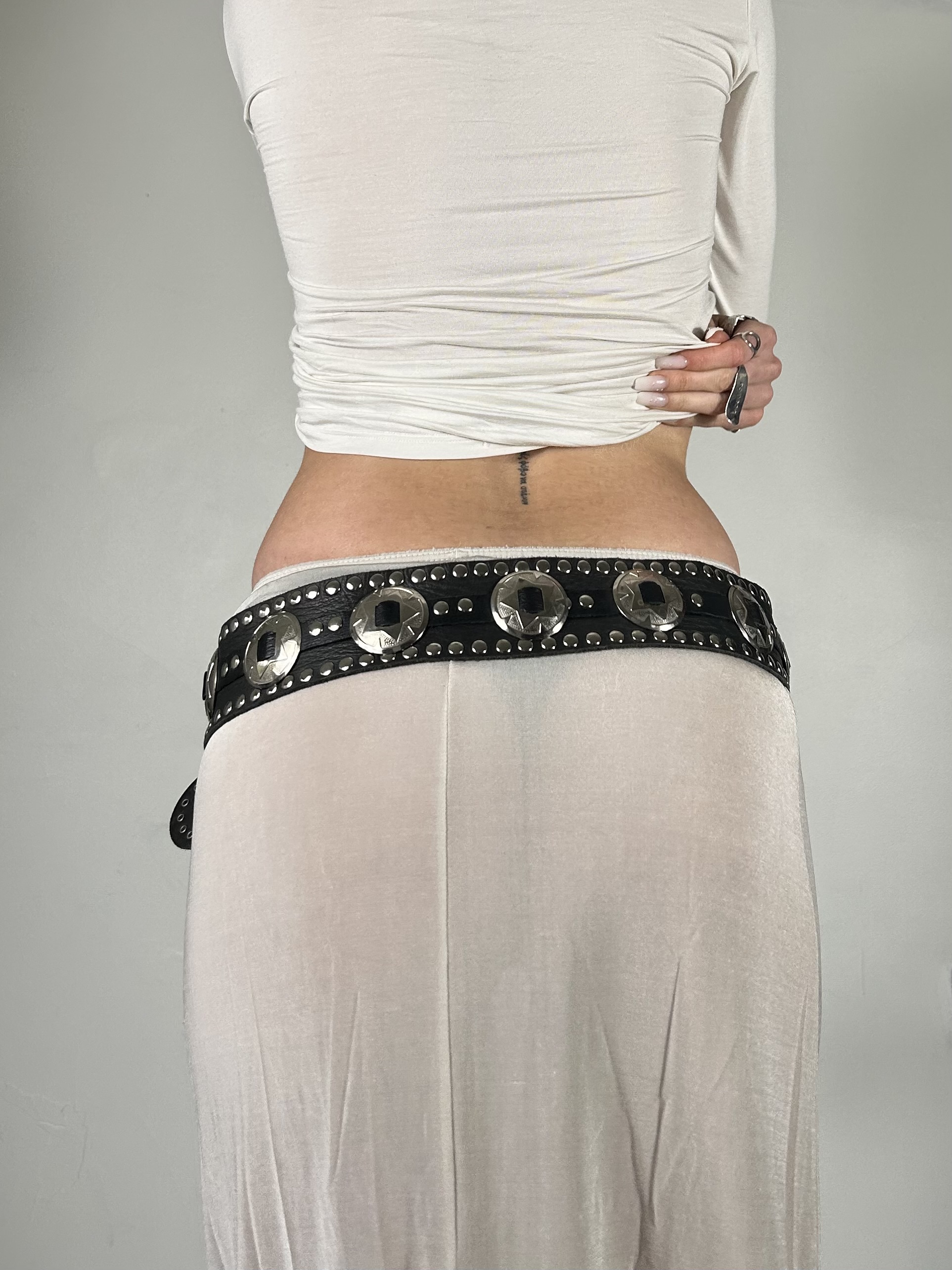 Black genuine leather belt with silver stud detailing and chunky buckle