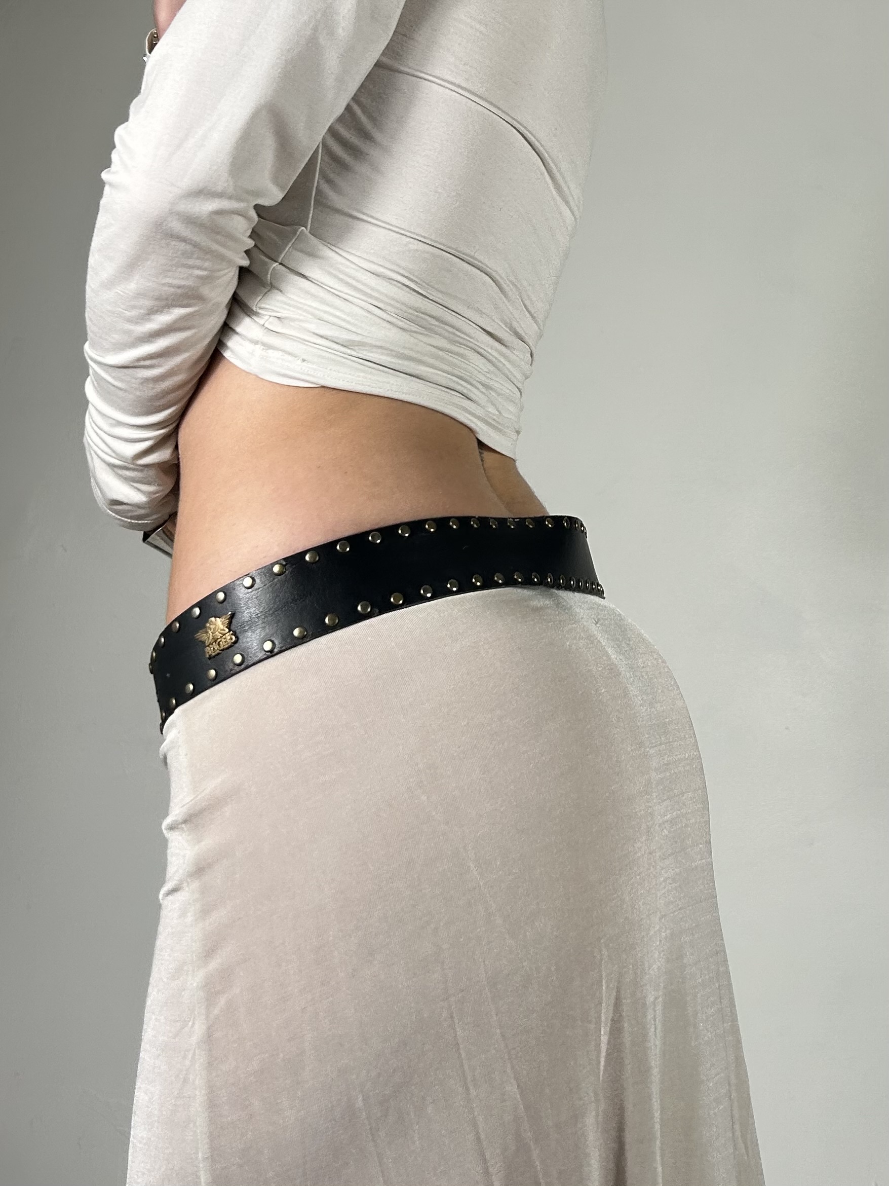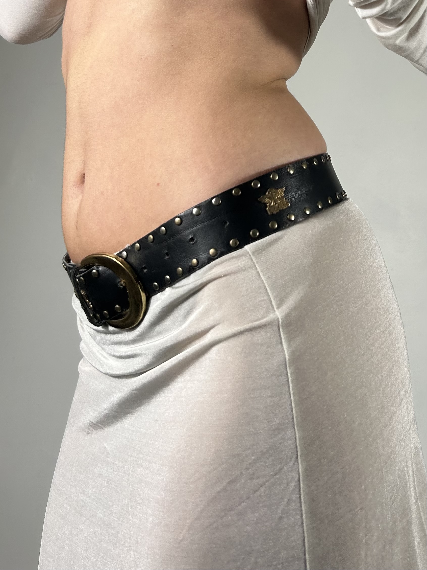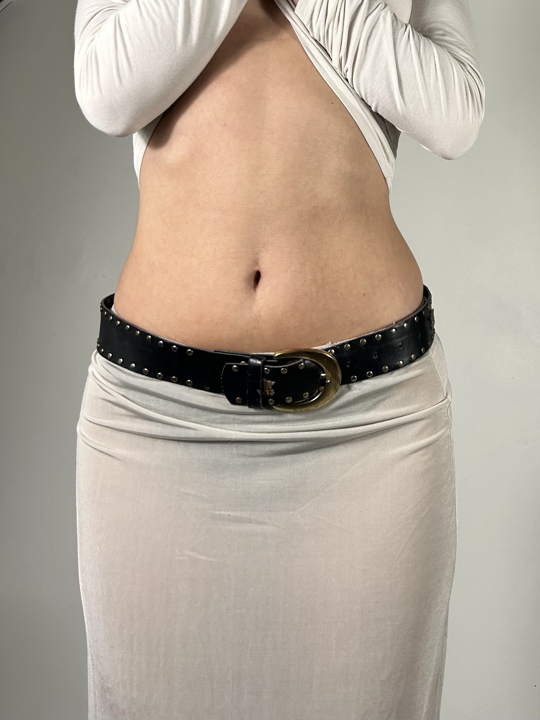 Black faux leather belt with brass stud detailing. Size xs/s