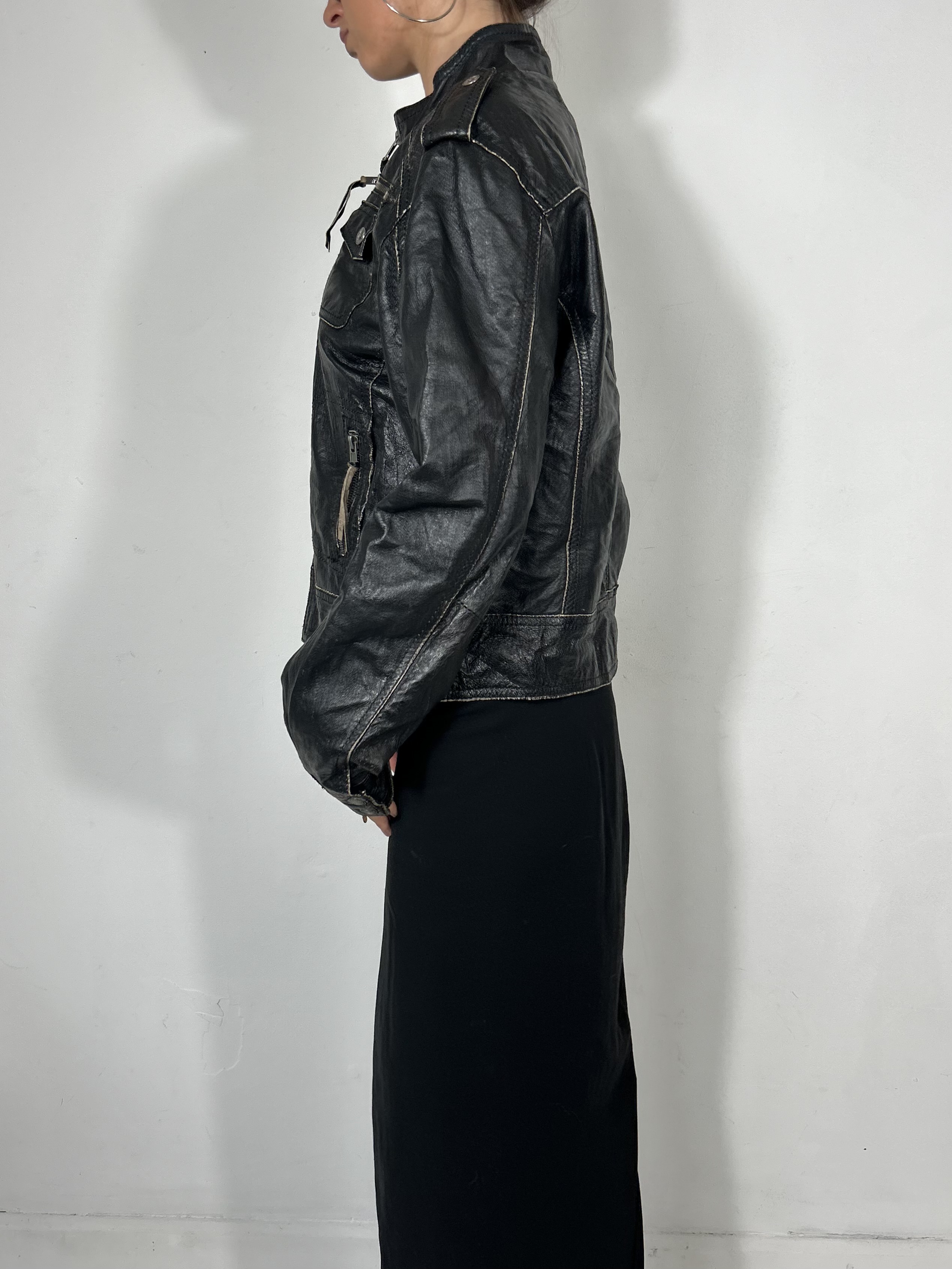 Black leather zip up jacket with boxy cropped fit and zip detailing
