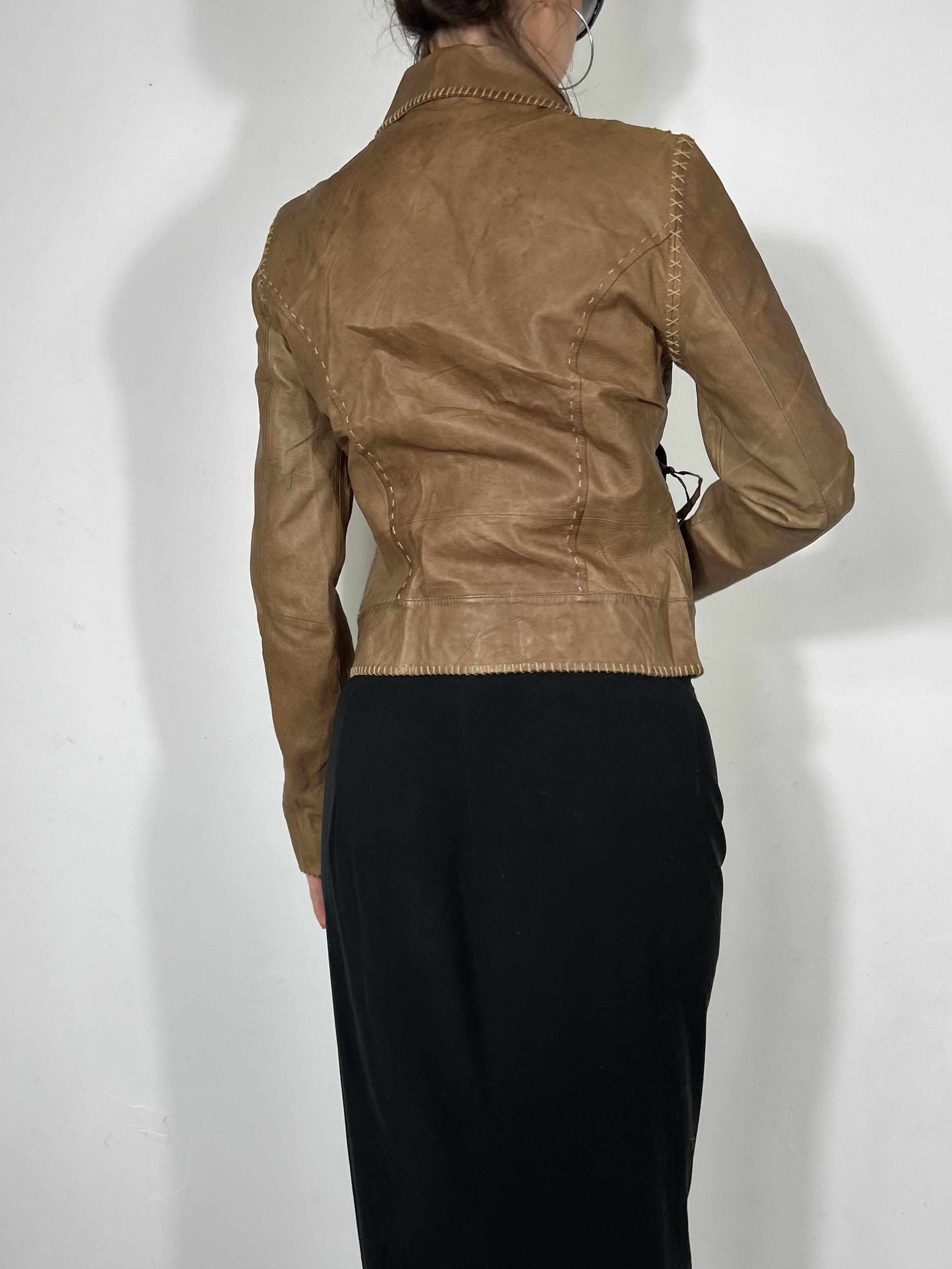 Tan soft leather zip up jacket with cropped fit and contrast stitching