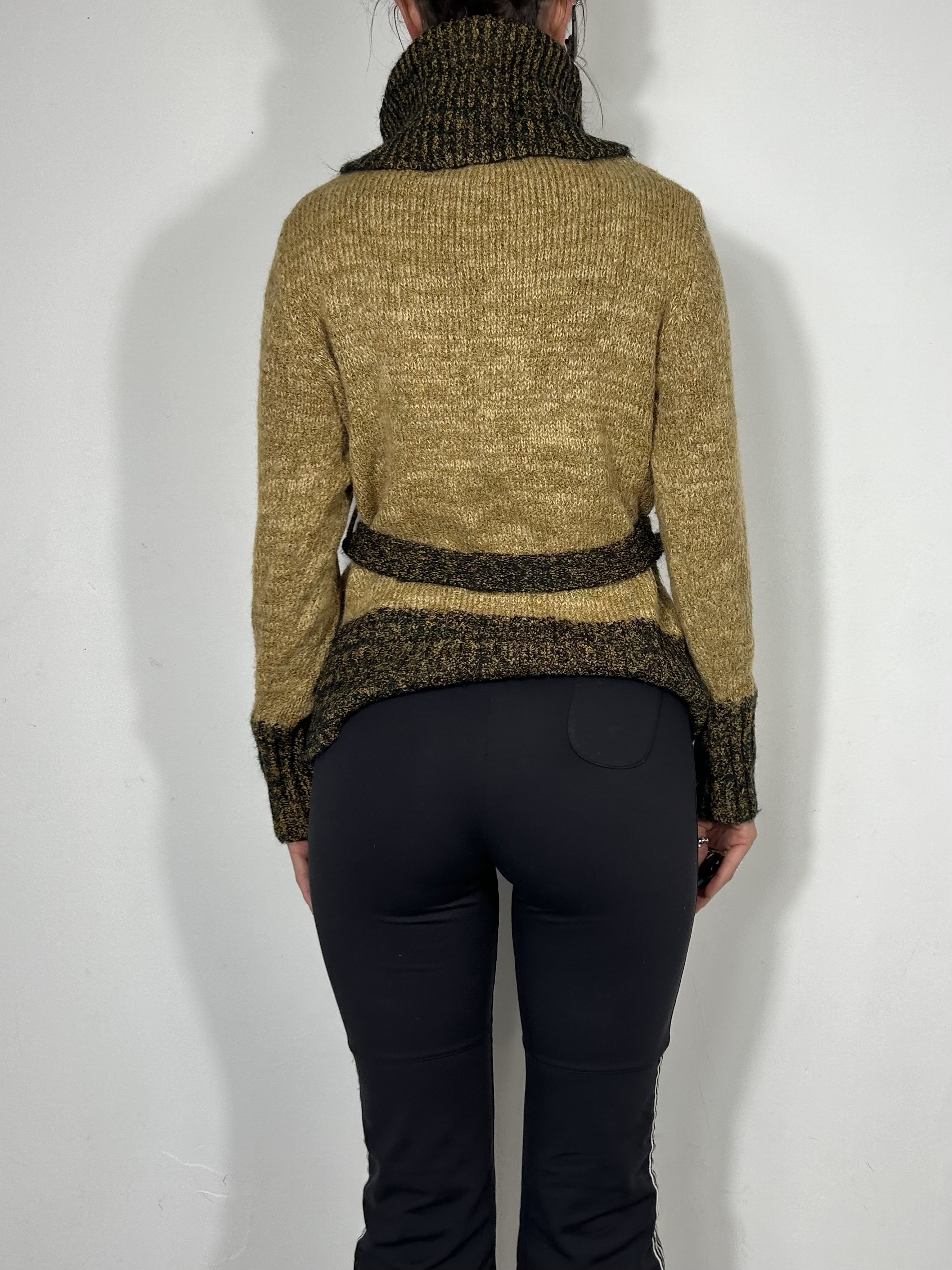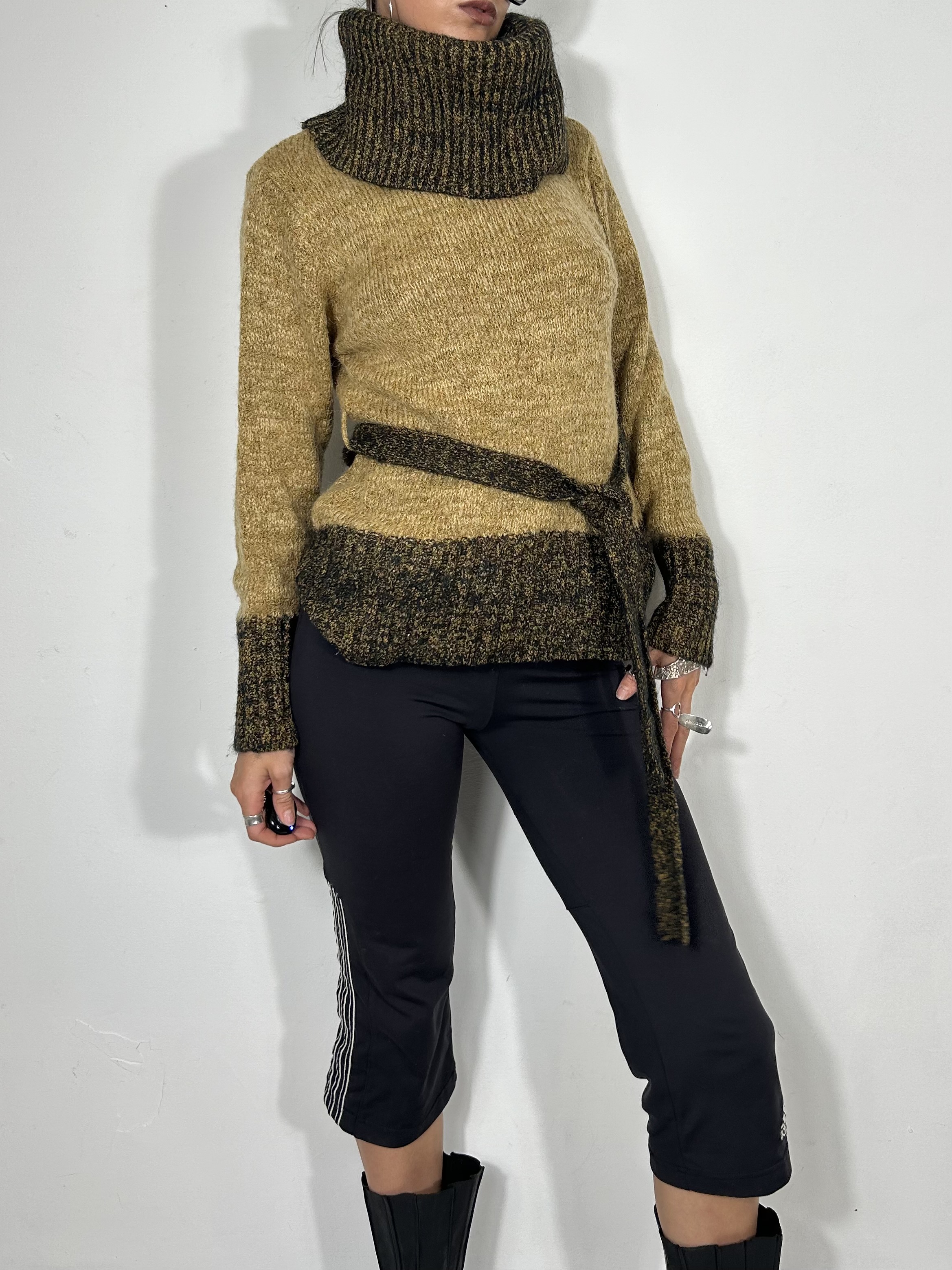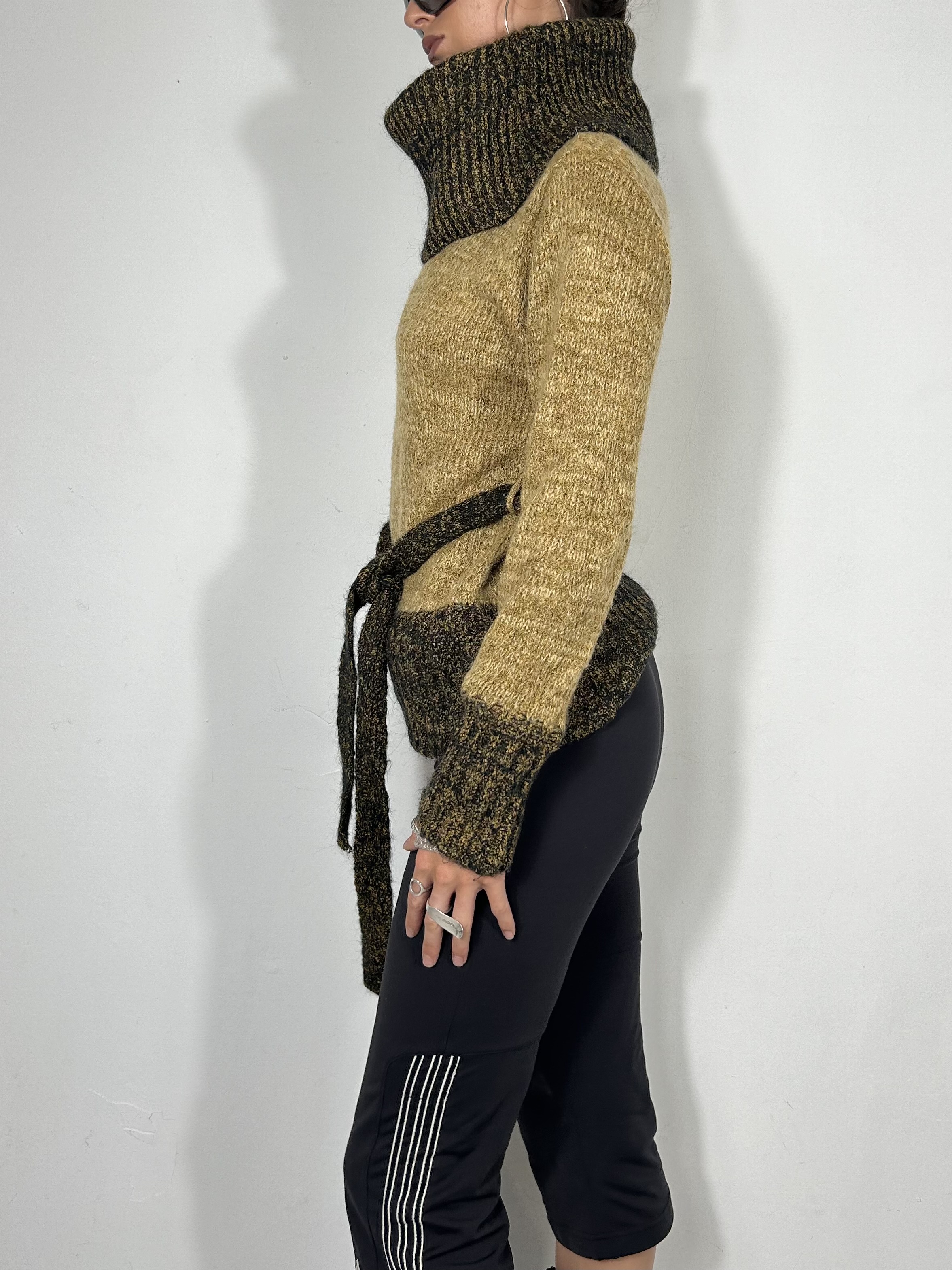 Earthy toned mohair roll neck jumper with tie detail. 79% mohair, 21% cotton
