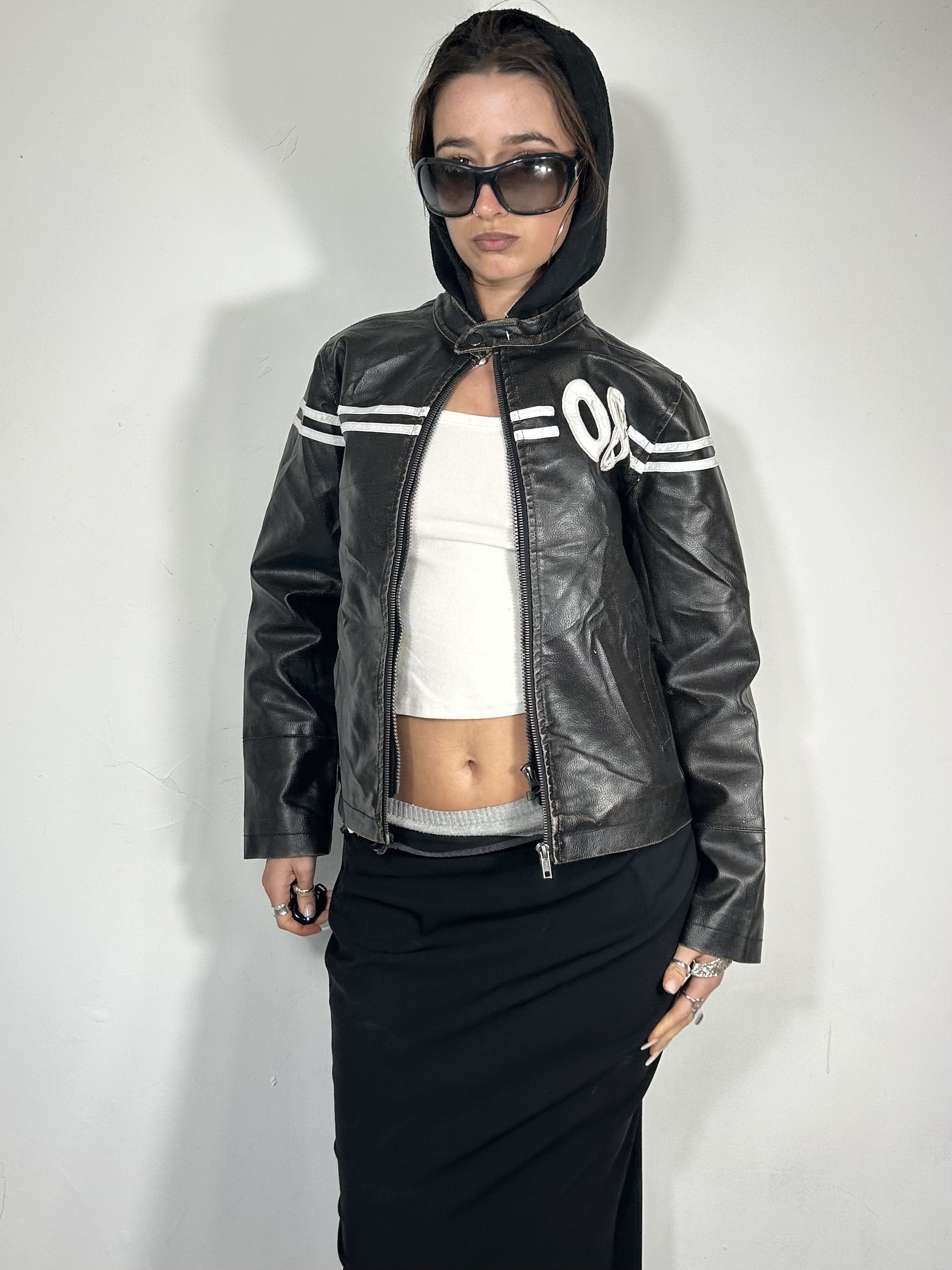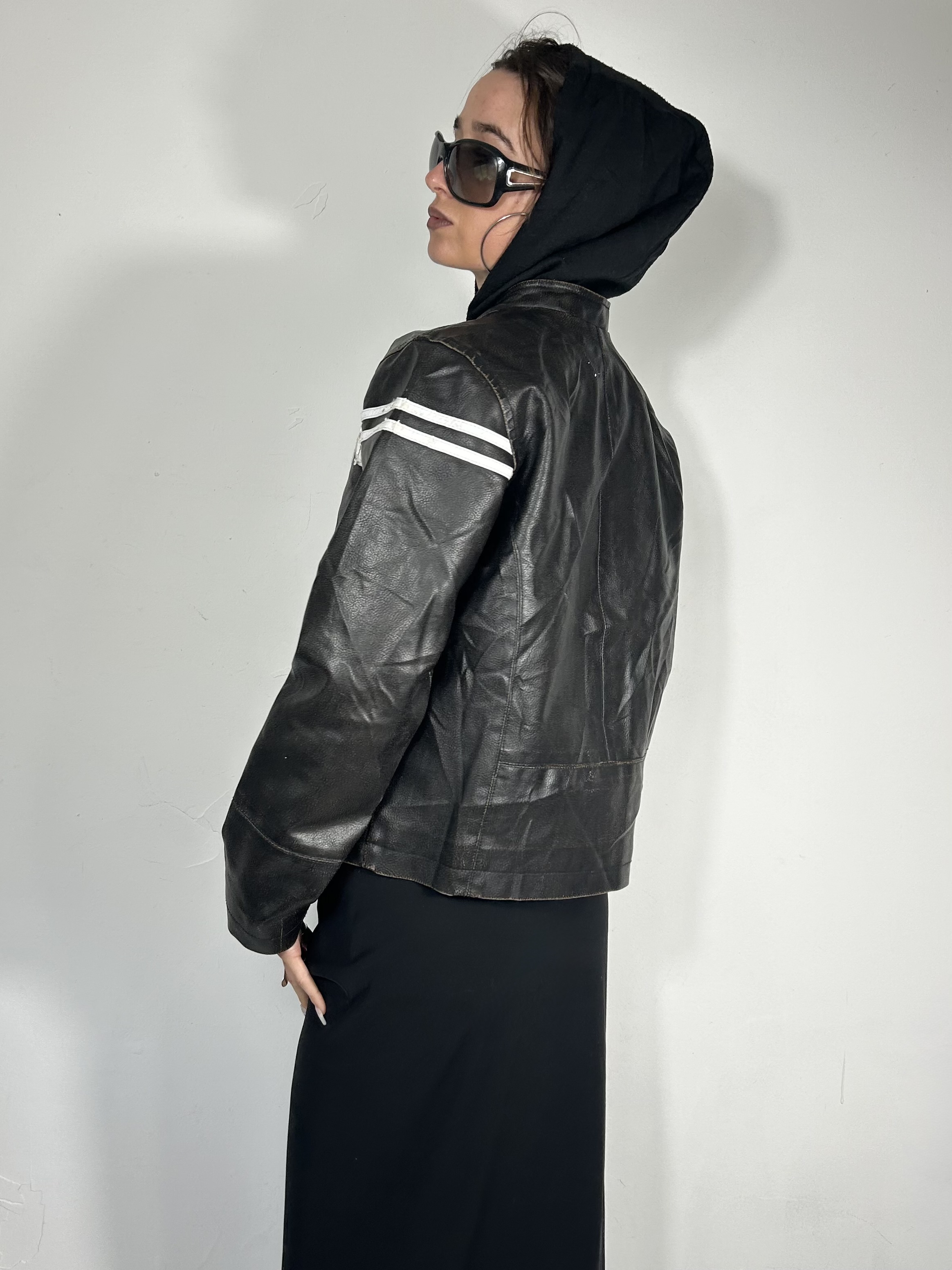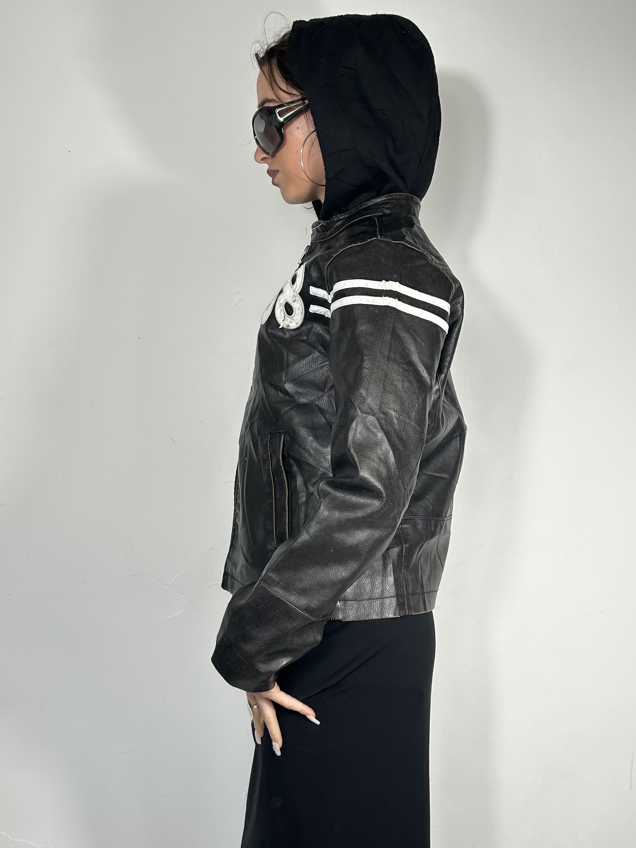 Black hooded dual layer leather jacket with white detailing. Please note, the white is peeling.