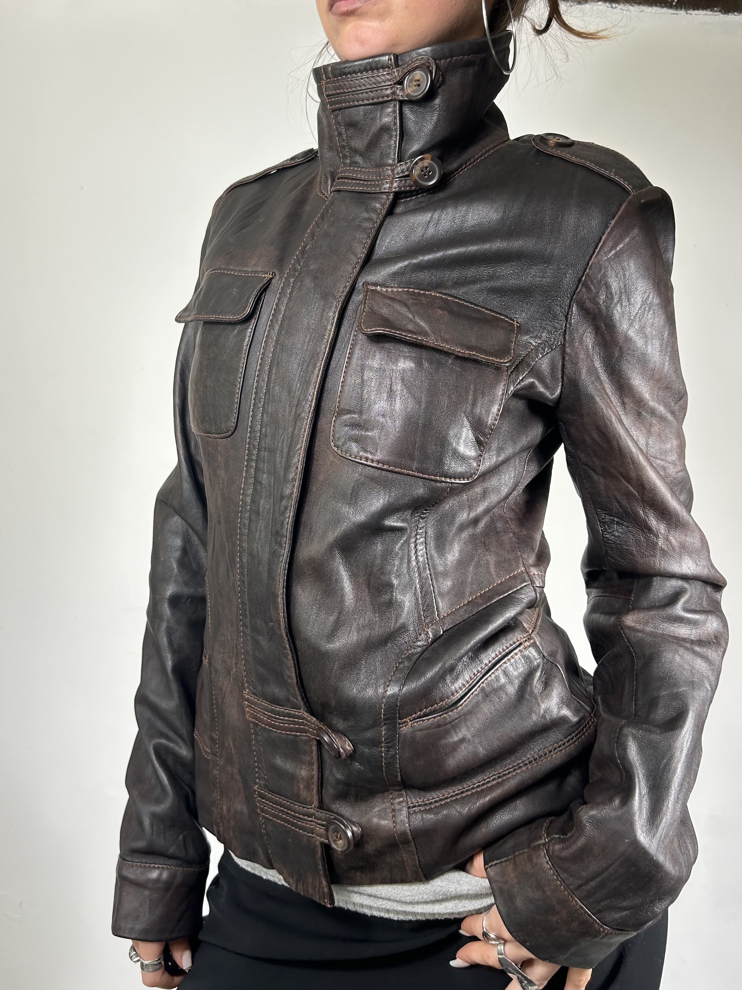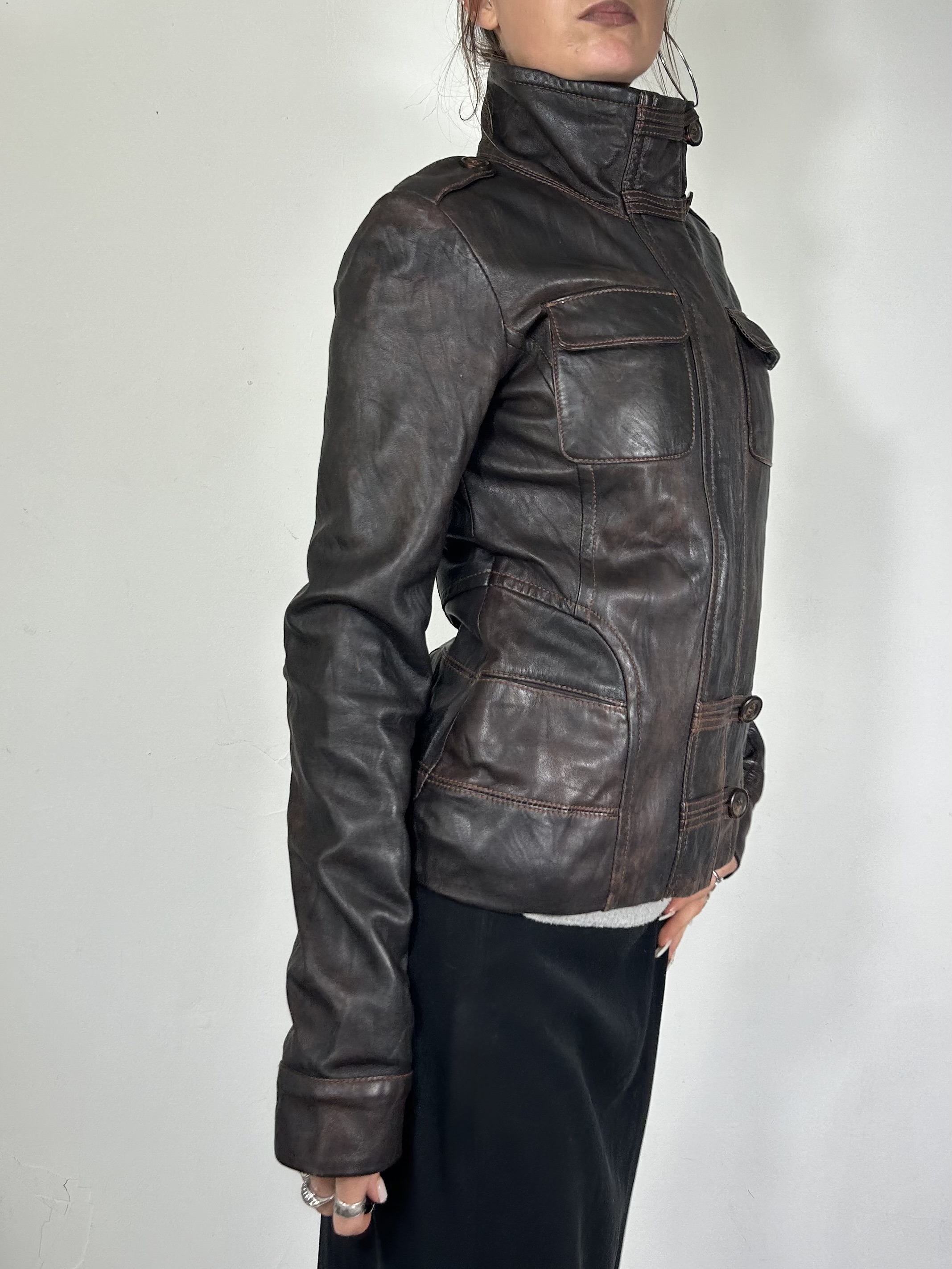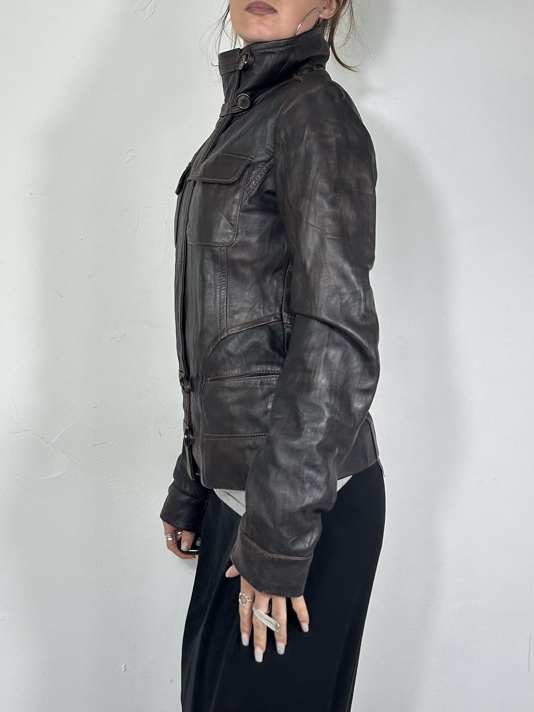 Brown asymmetrical leather jacket with utility fastenings and high neckline