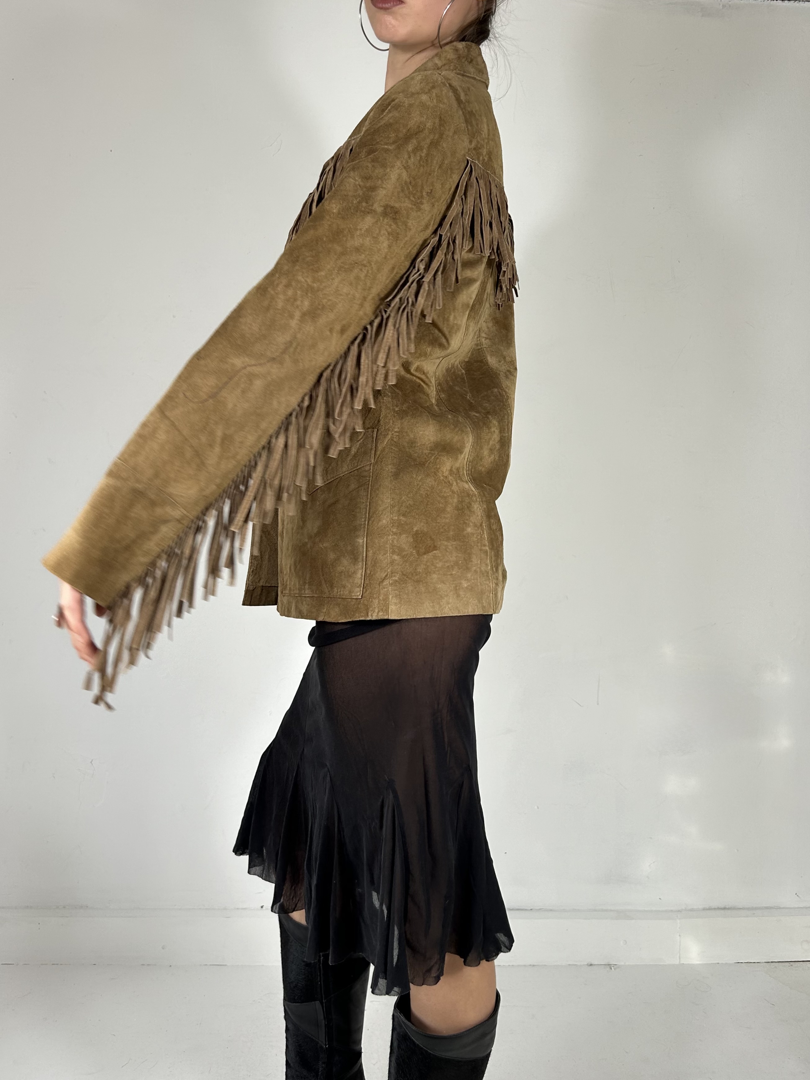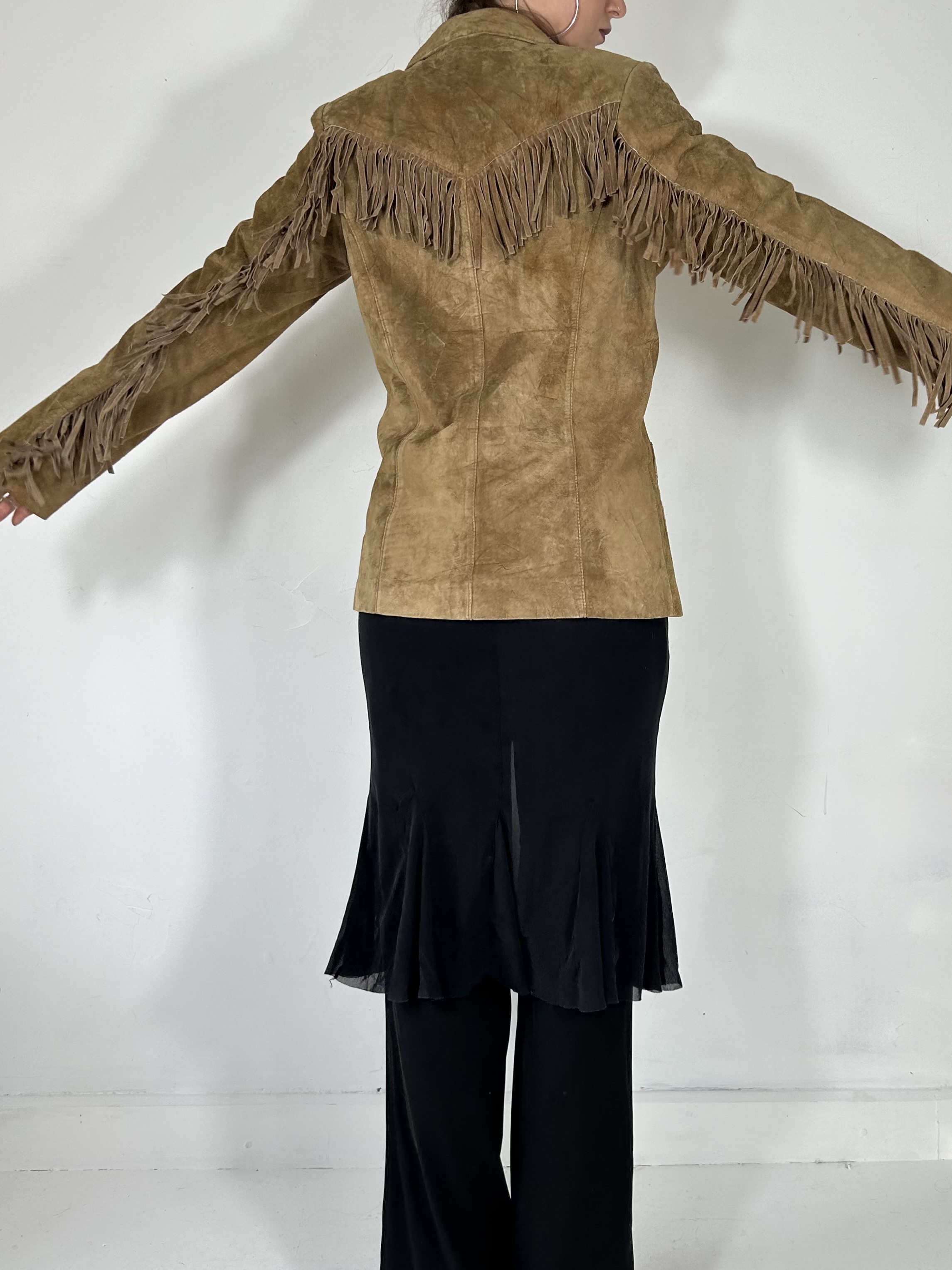 Tan suede button up fringe jacket