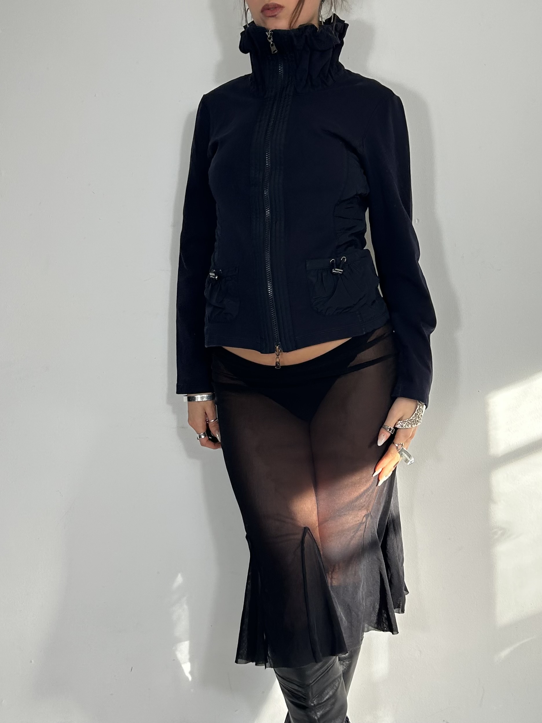 Navy blue double zip jumper with ruched neckline and toggle detailing