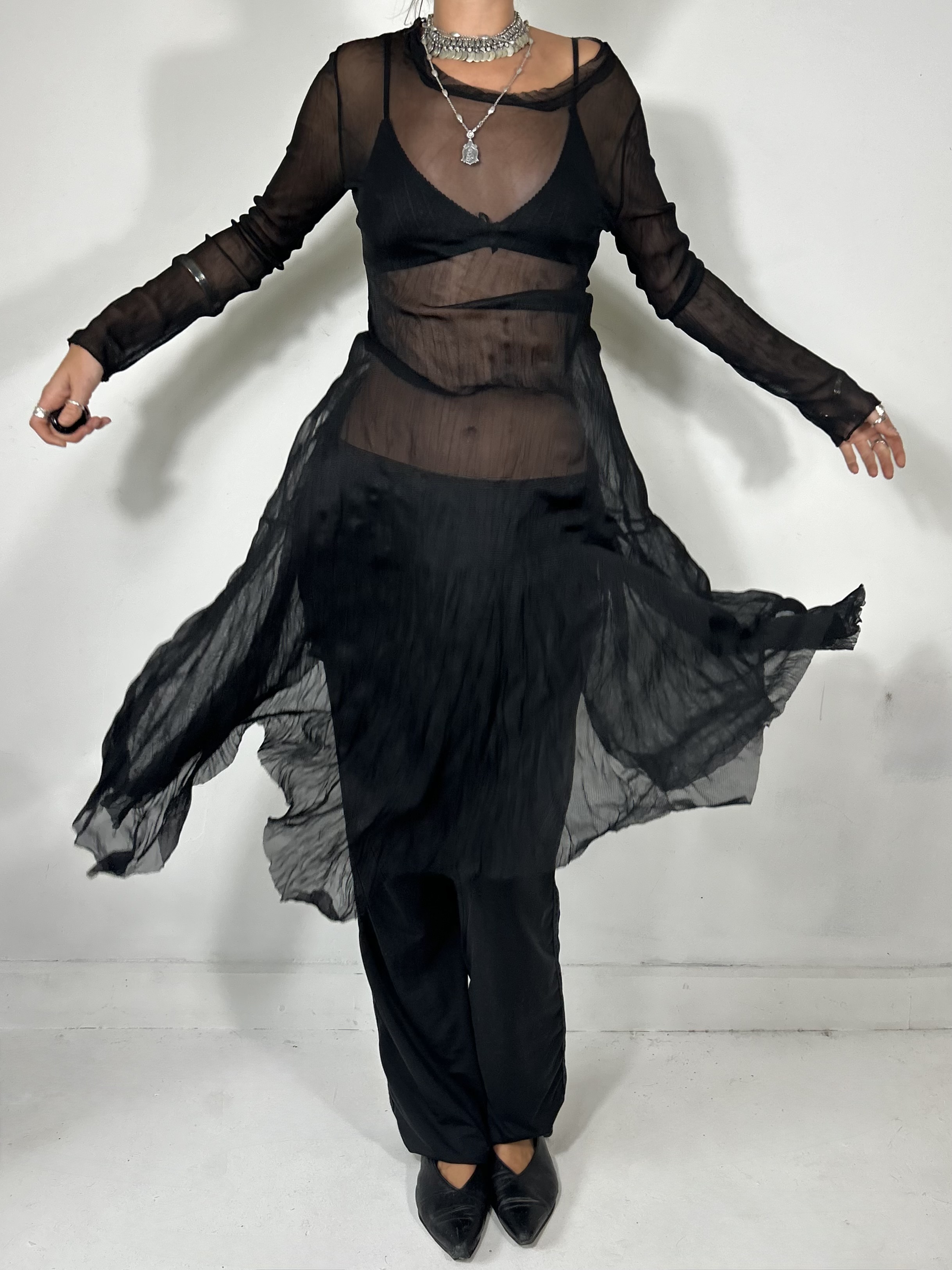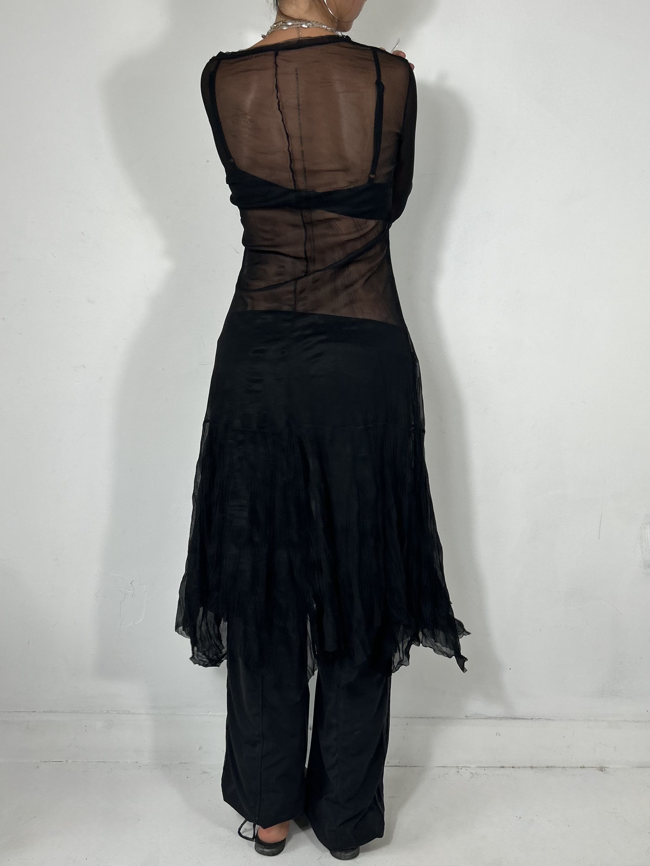 Black mesh maxi dress with asymmetrical hem