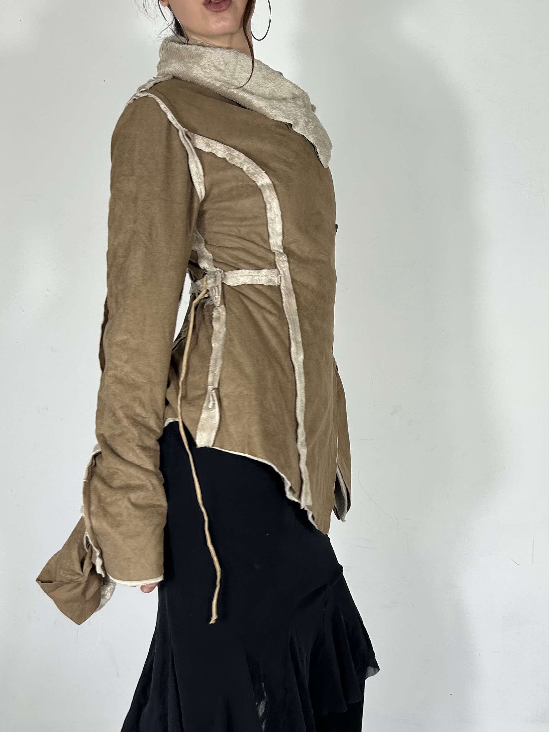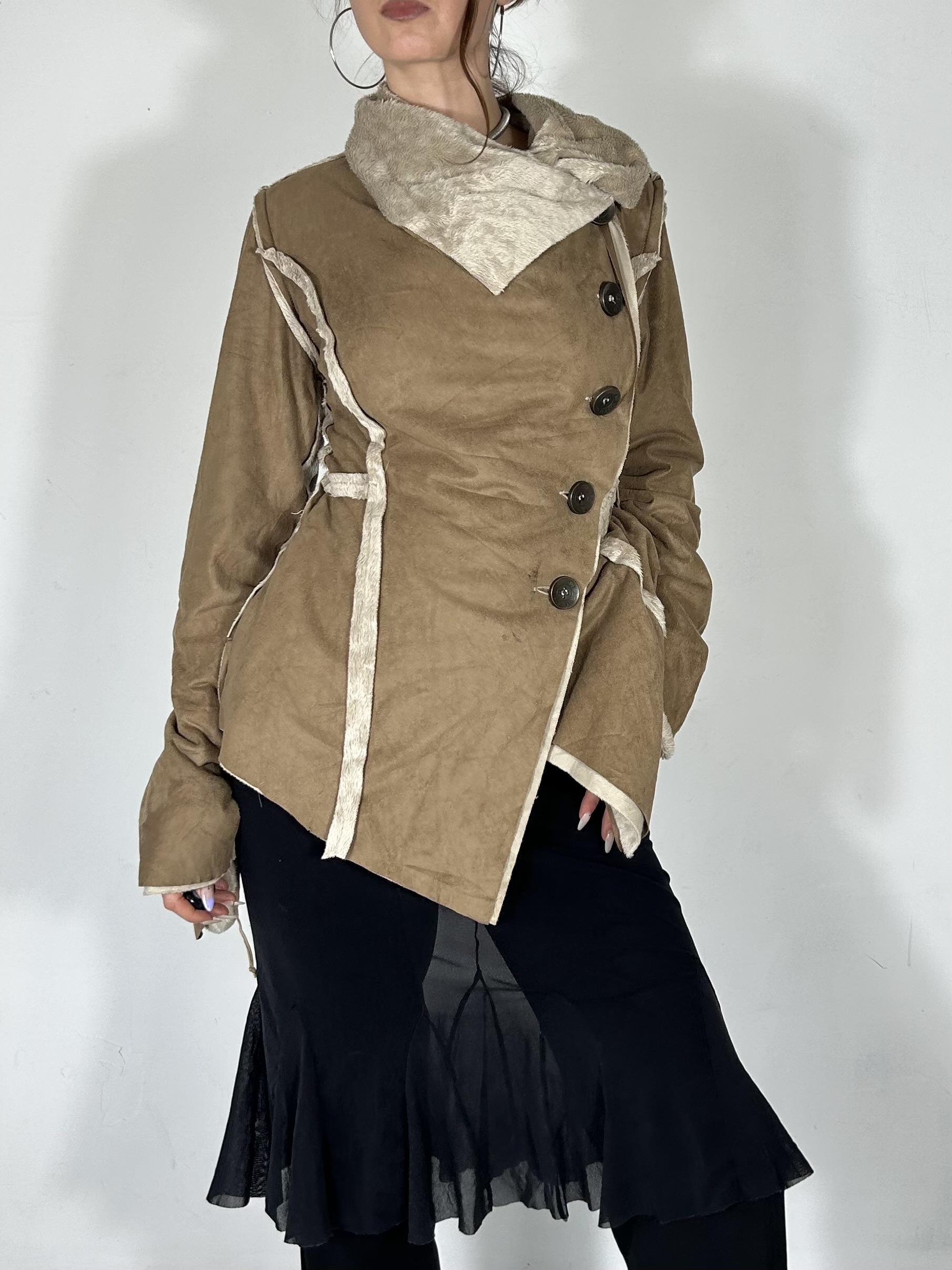 Camel suede style asymmetric button up jacket with laced back and fur lining