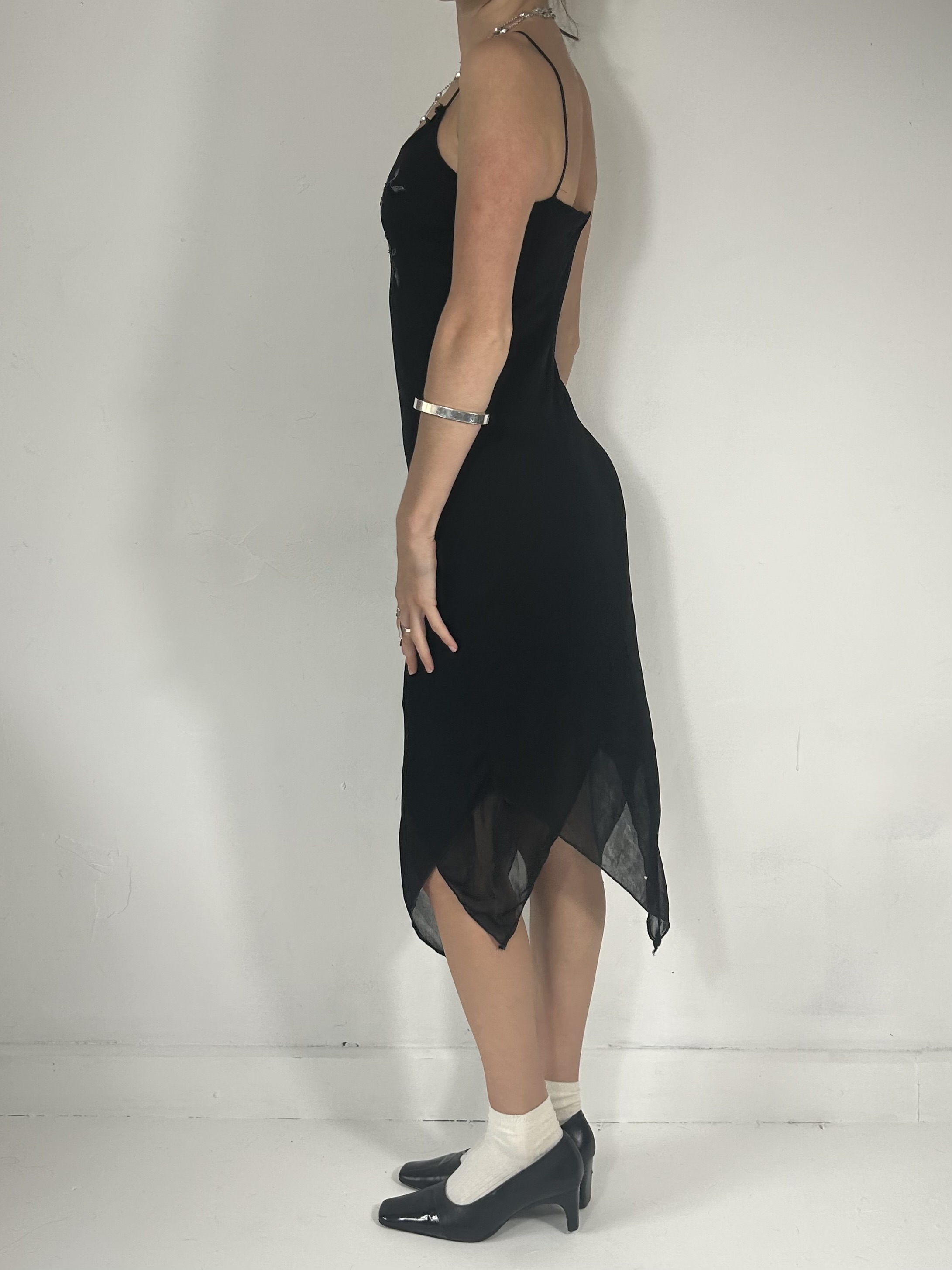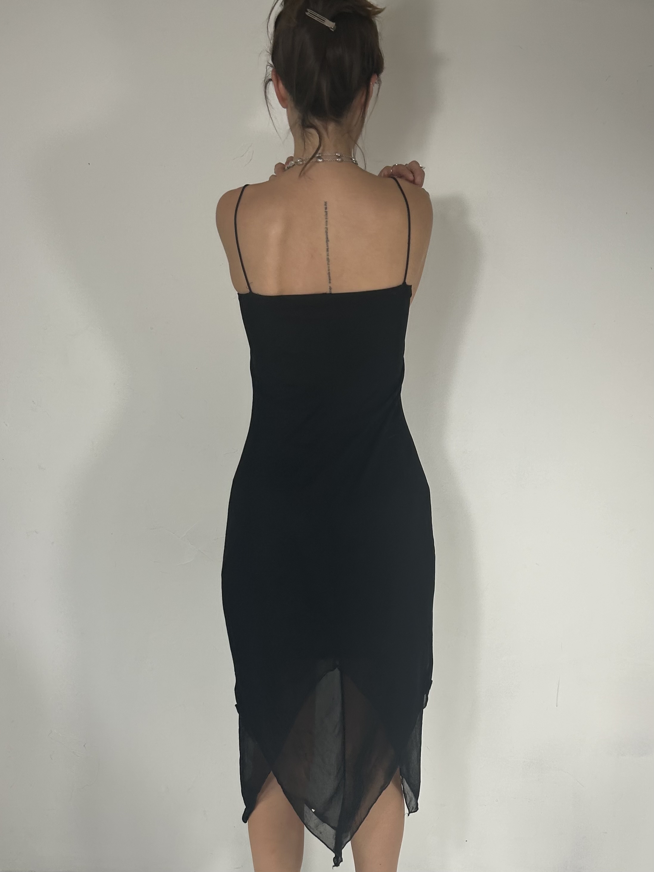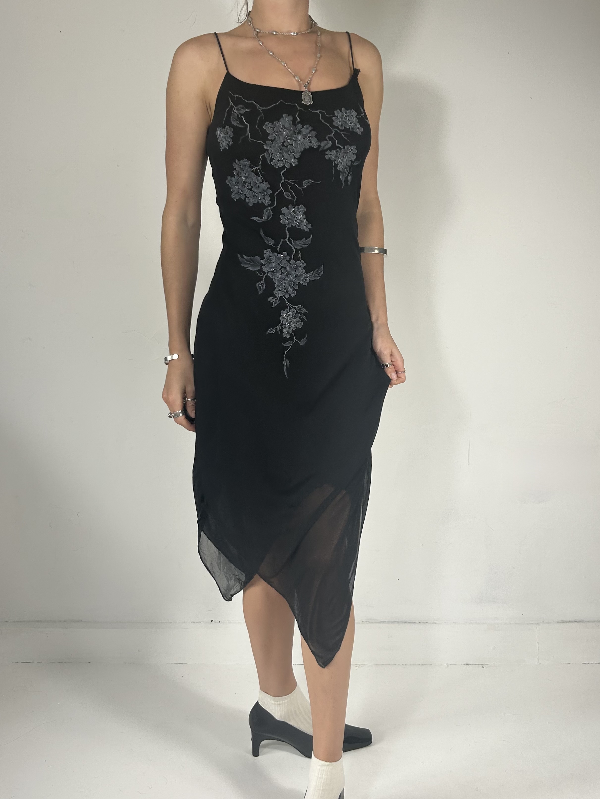 Black mesh double layer midi dress with floral detailing and asymmetric hem
