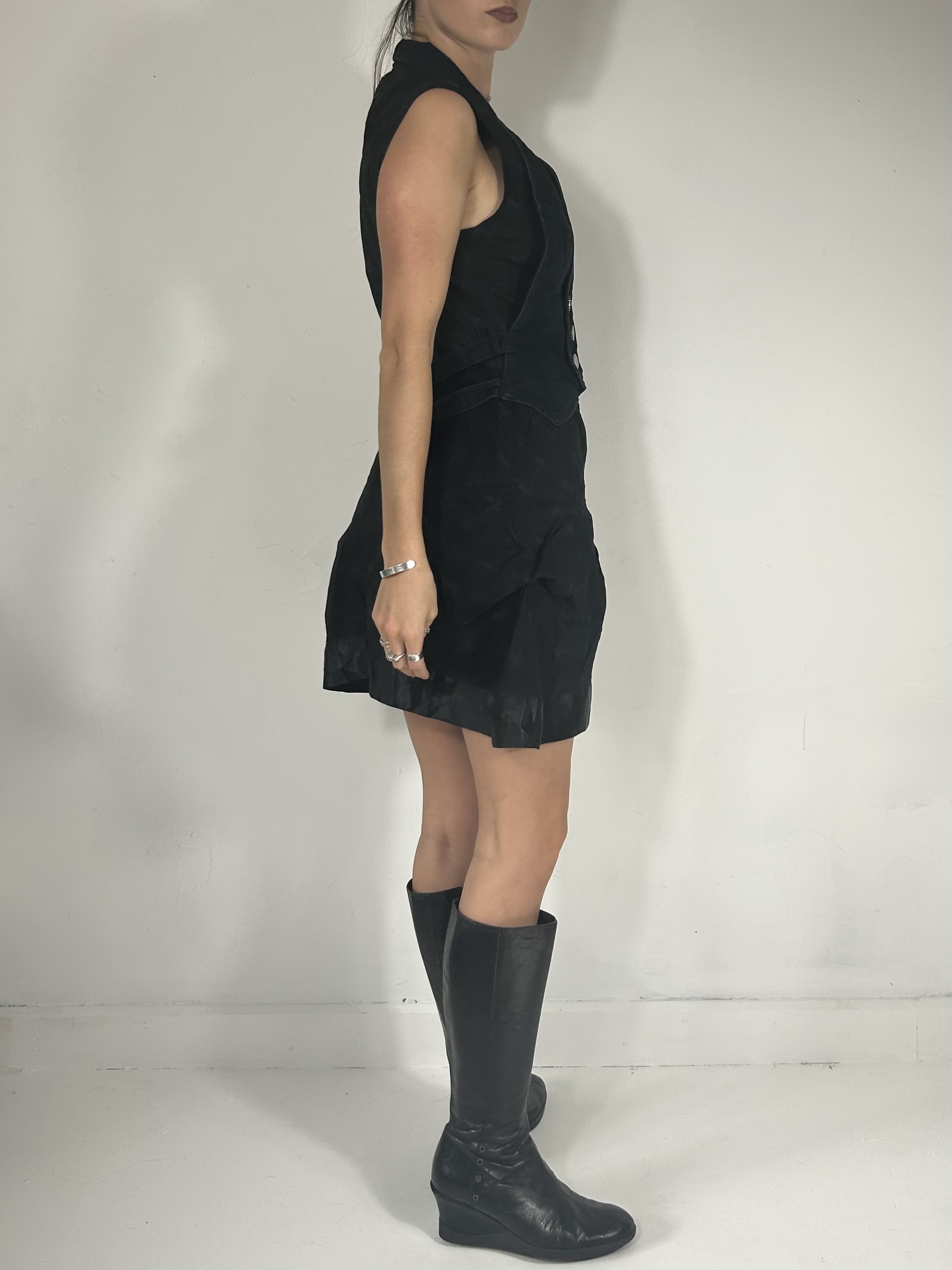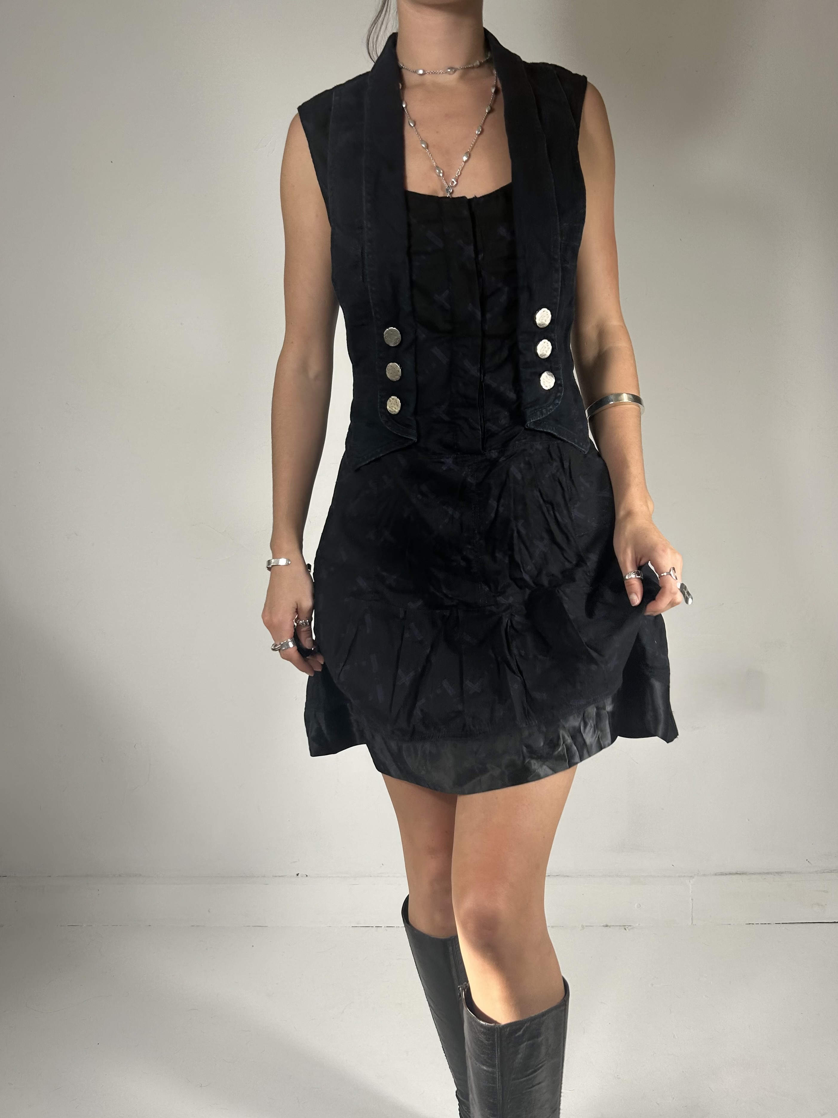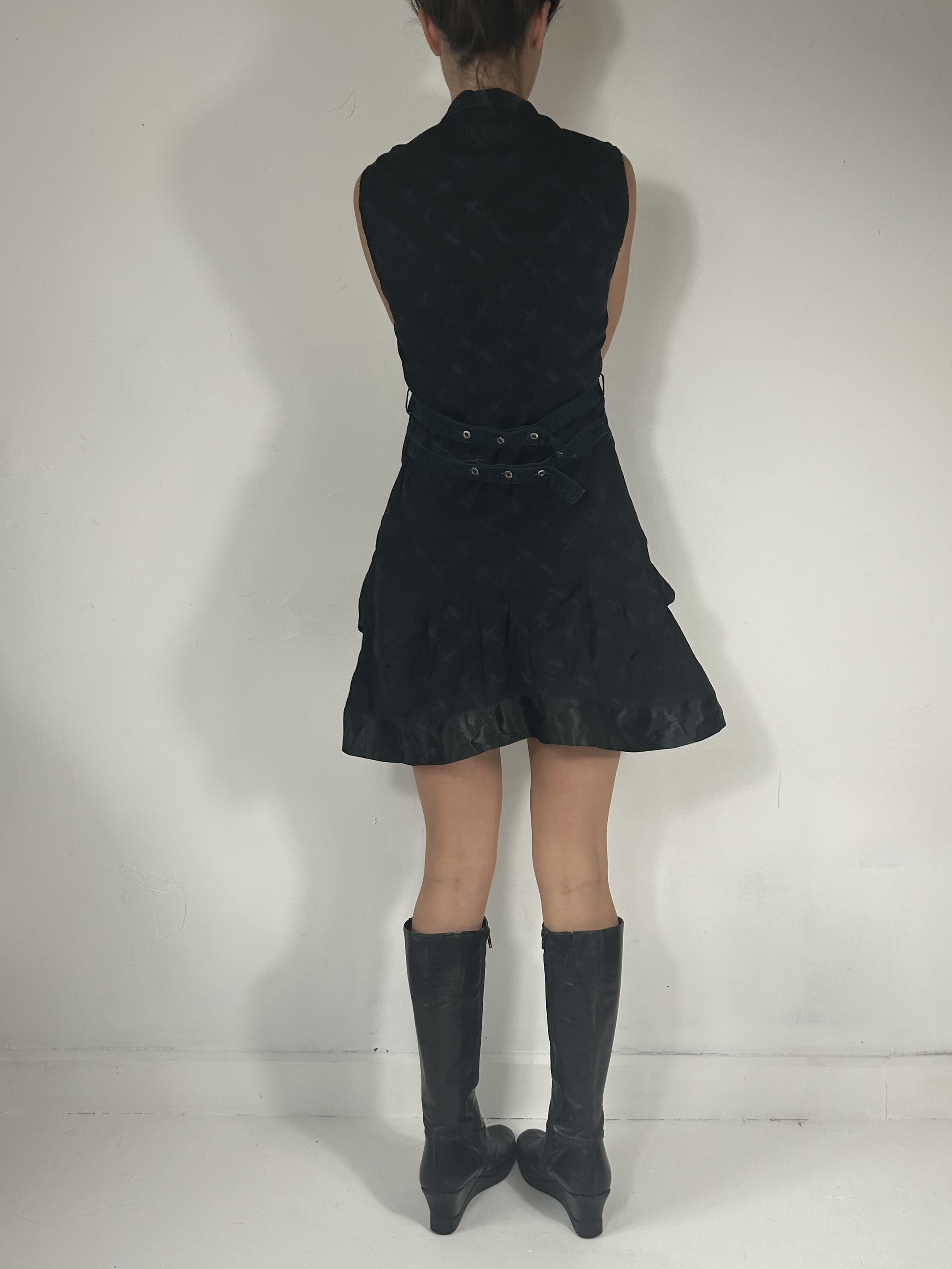 Navy blue waist coated mini dress with military style buttons and bubble hem