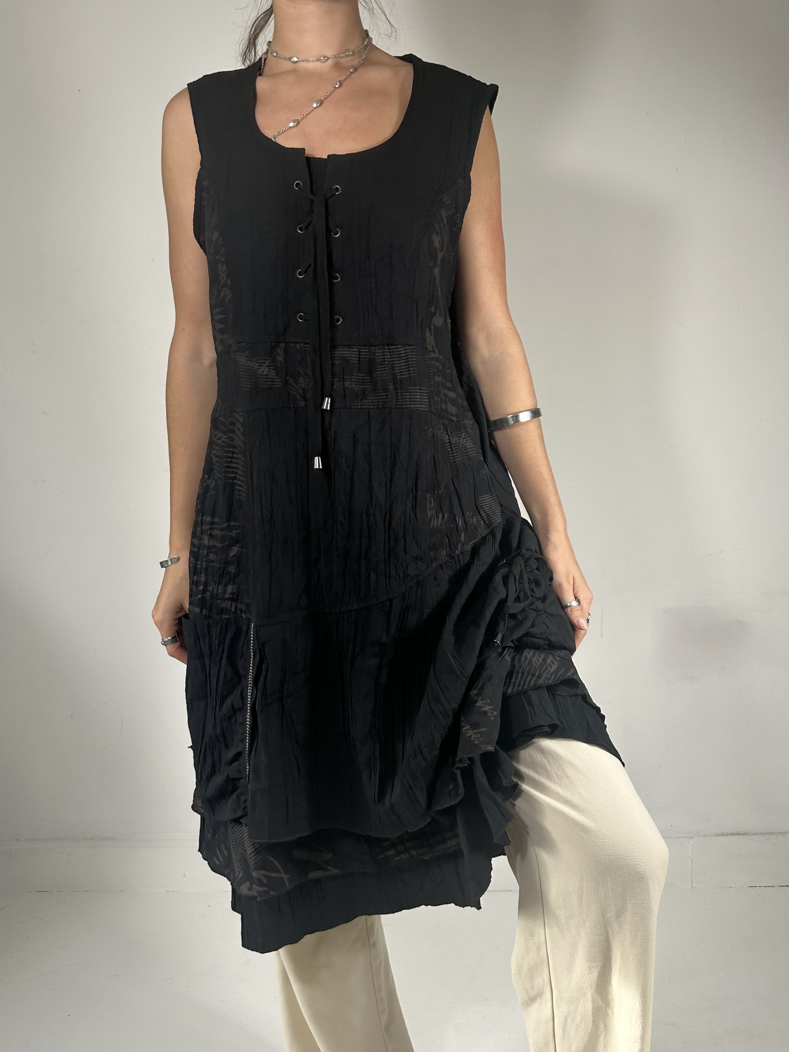 Black layered utility midi dress with lace up detailing