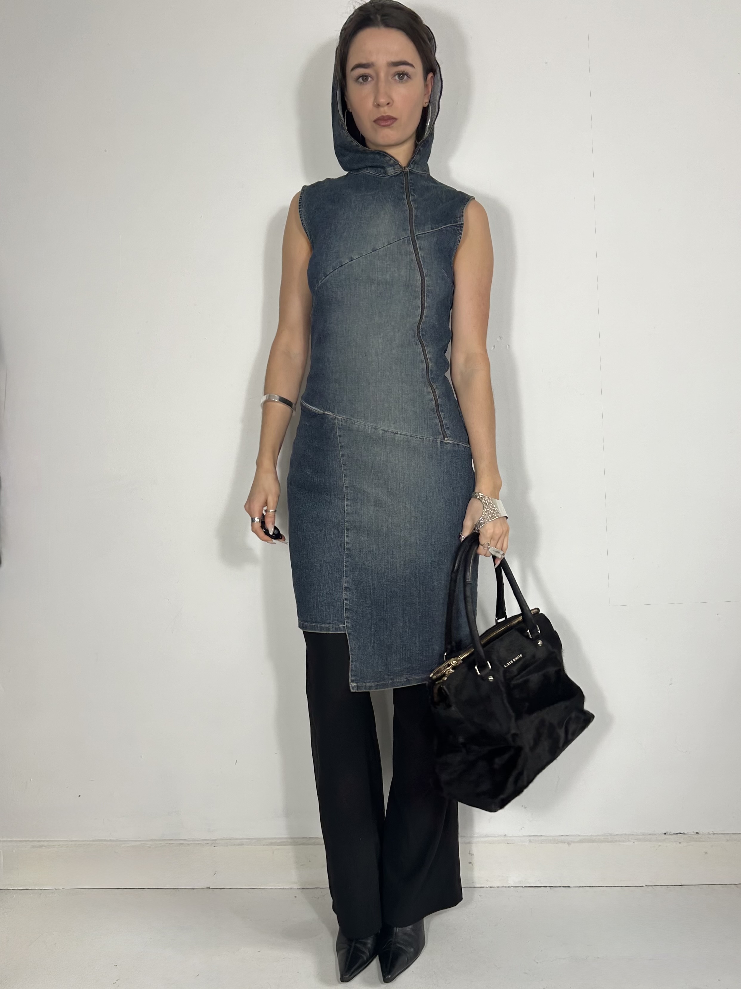 Denim asymmetrical zip up dress with hood and asymmetric hem. Please note that the zip is pulled up using the safety pin.