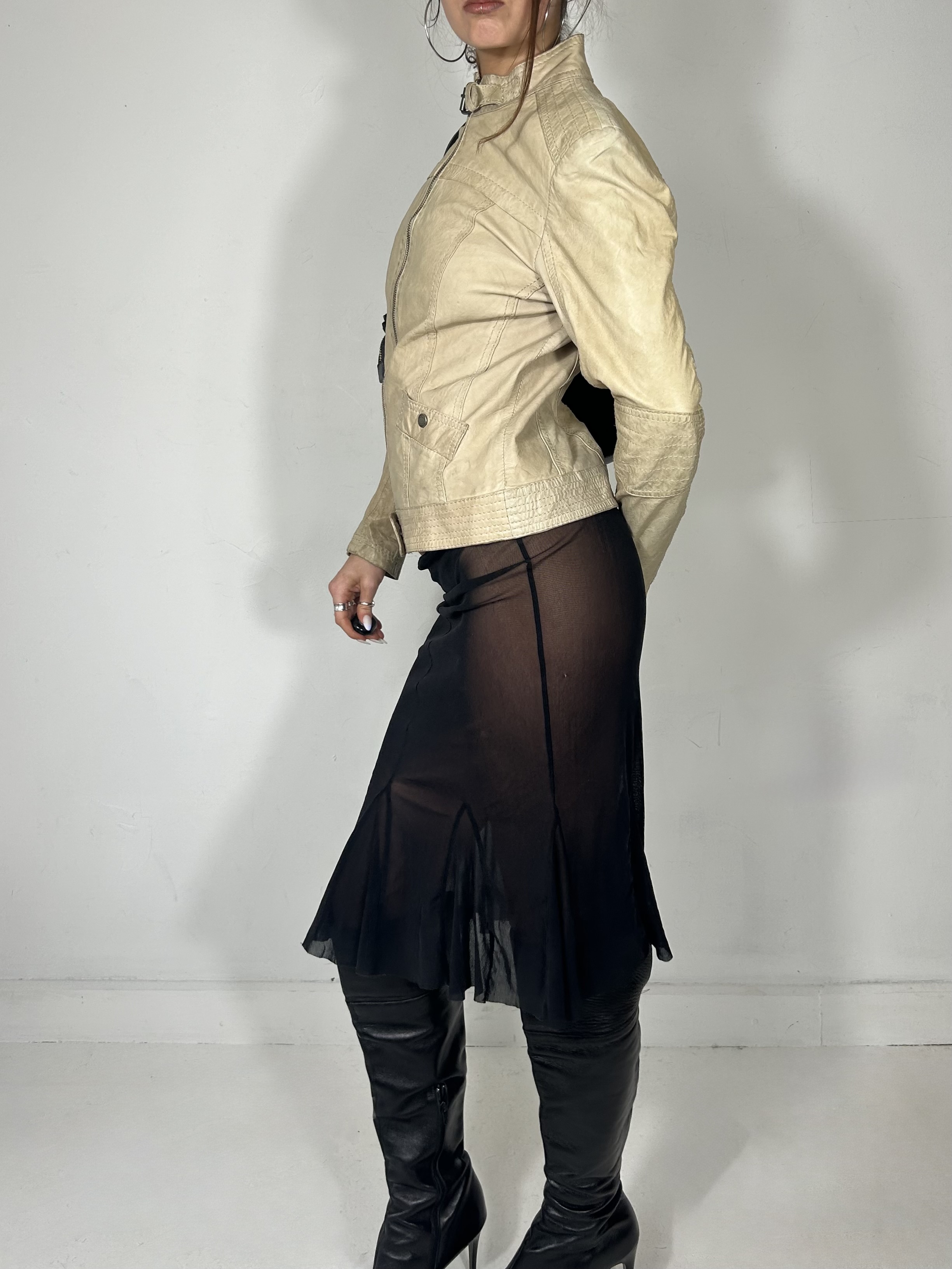 Cream leather high neck biker jacket with buckle neck and popper detailing