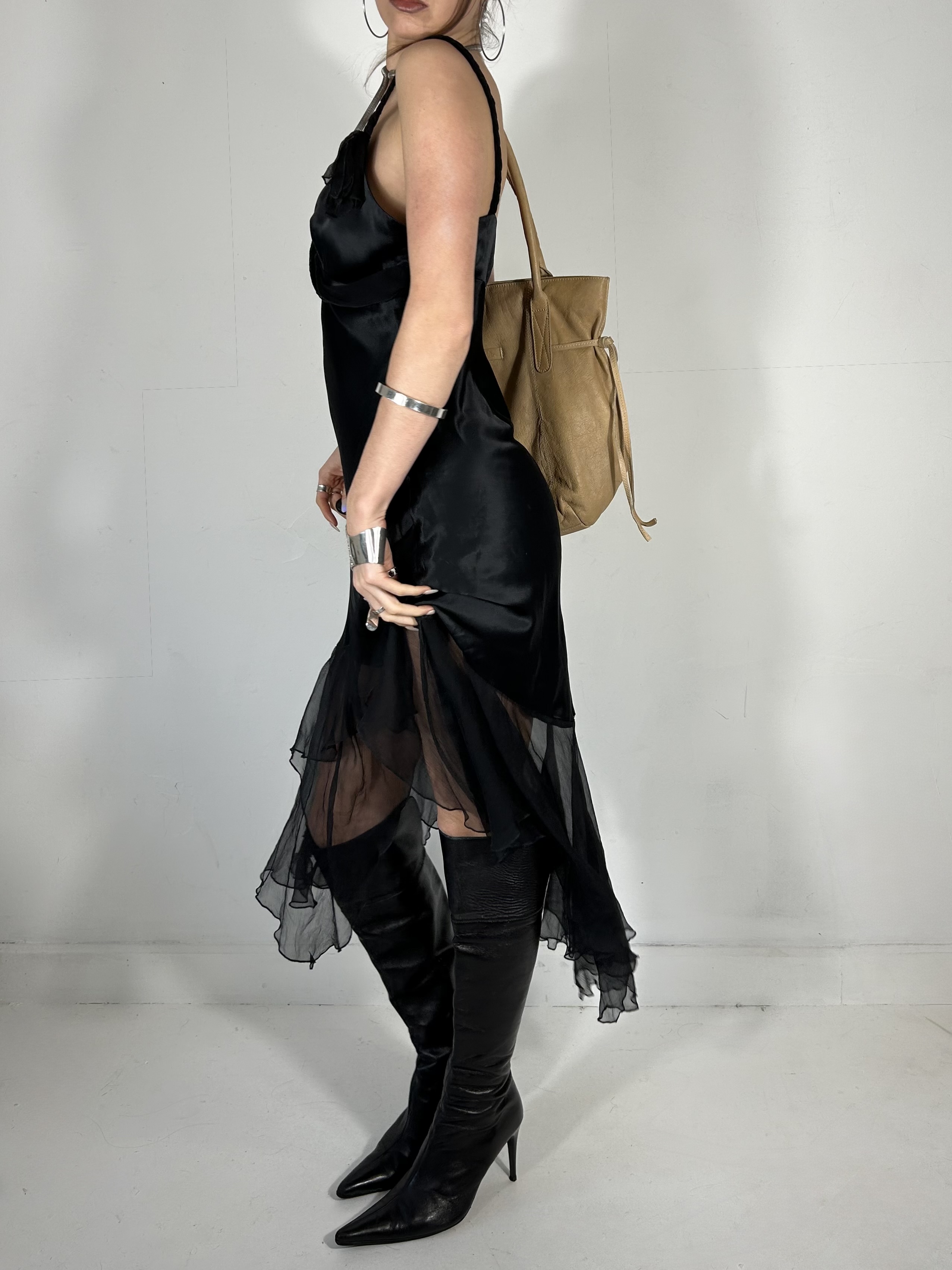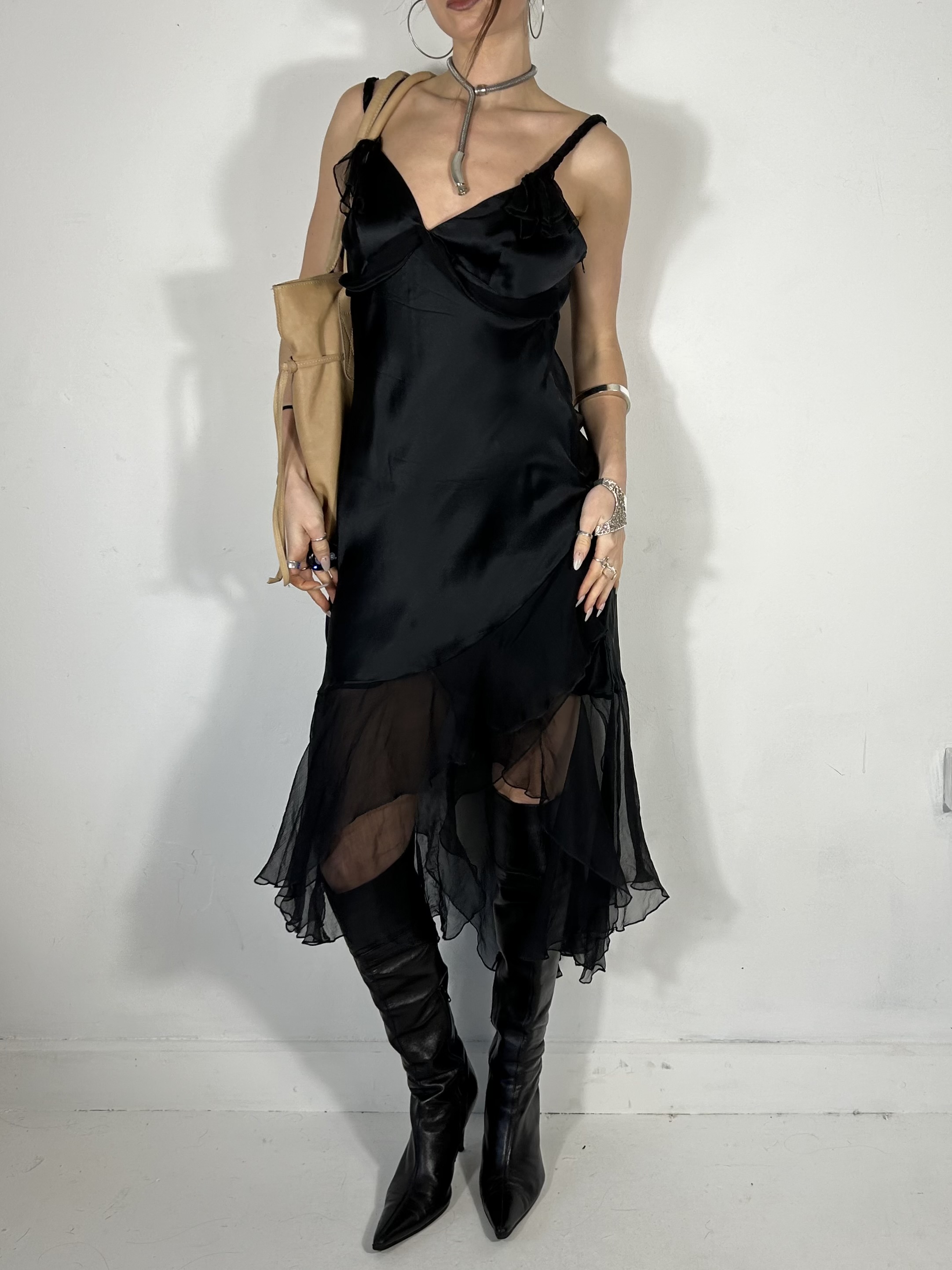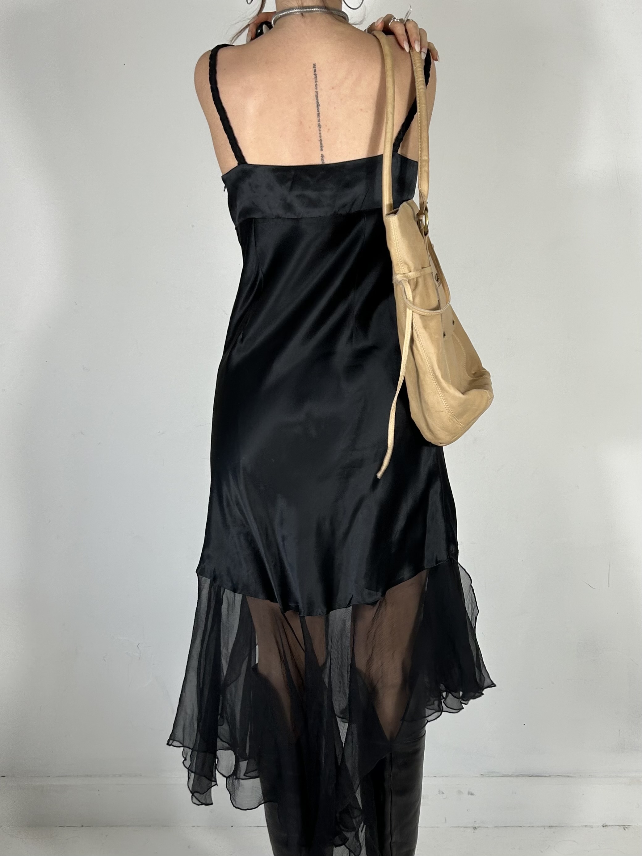 100% silk black slip dress with chiffon trim