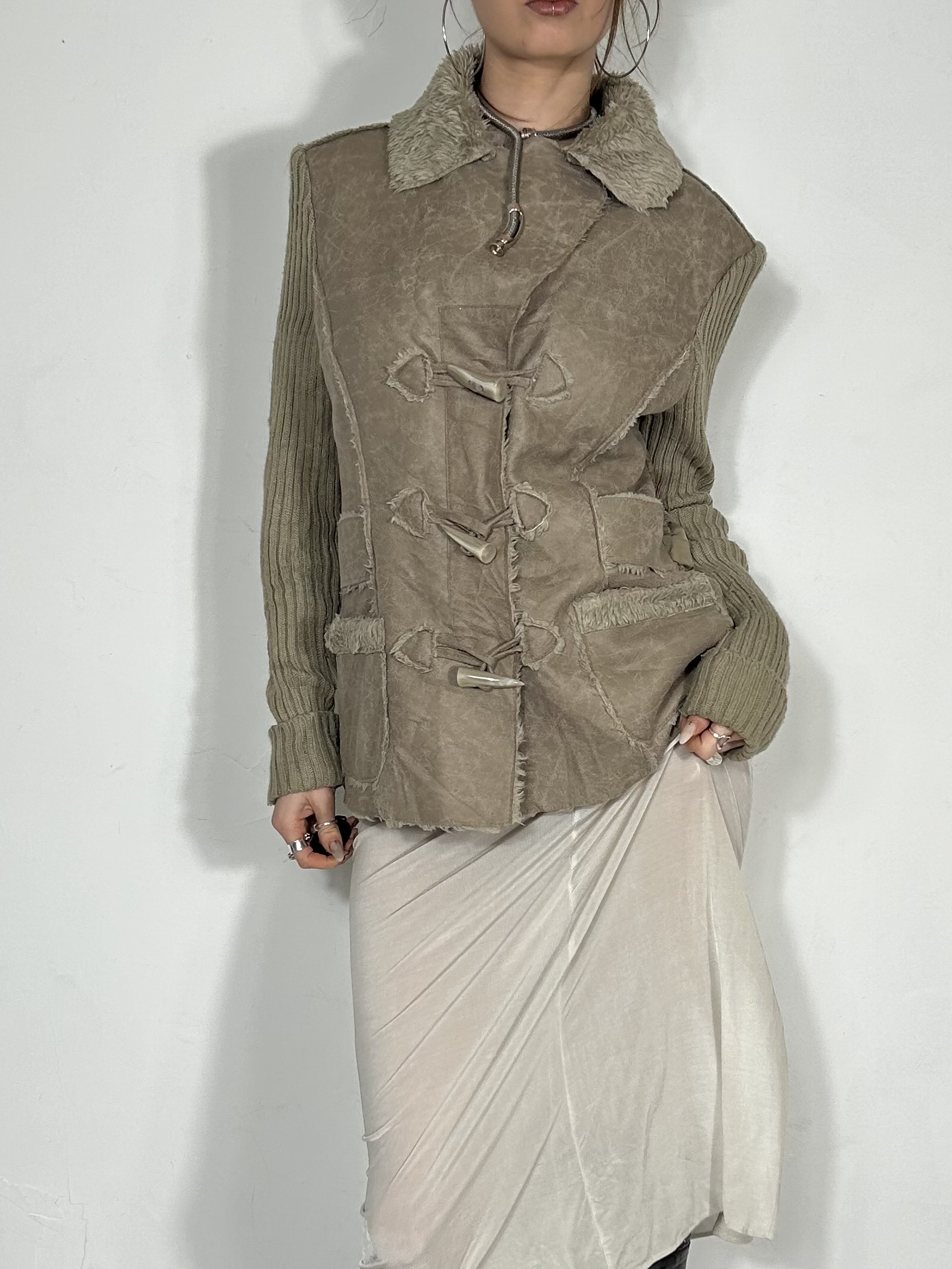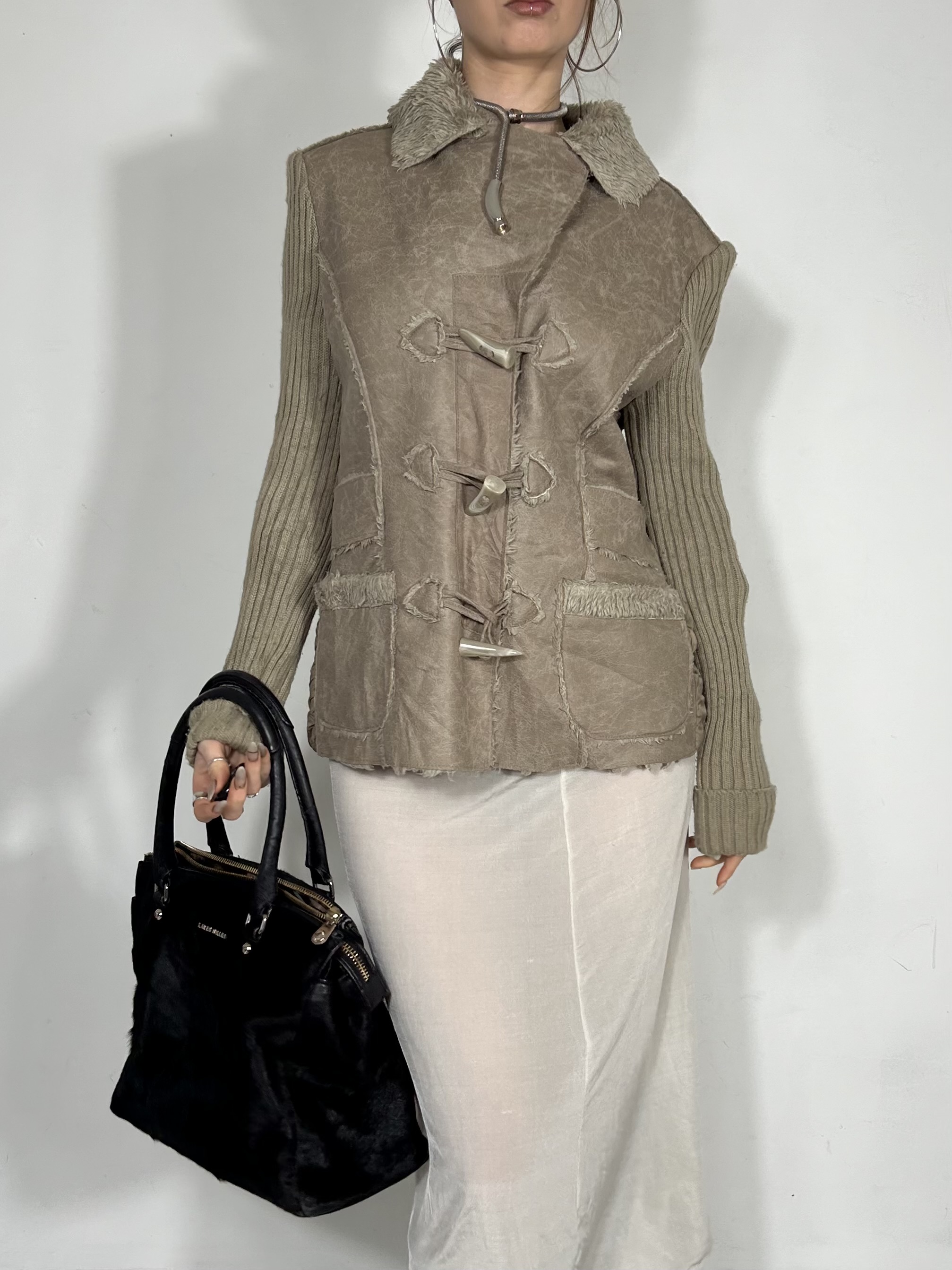 Cream suede and faux fur jacket with ribbed knit arms and tooth clasp closures