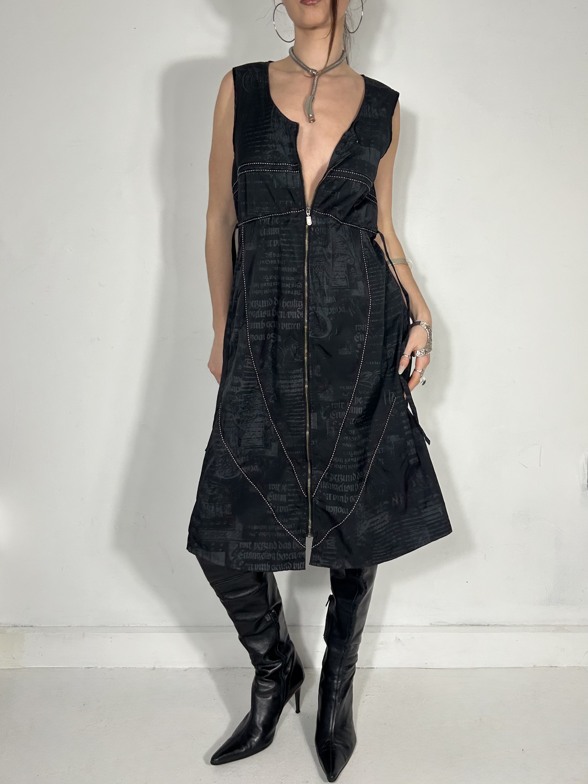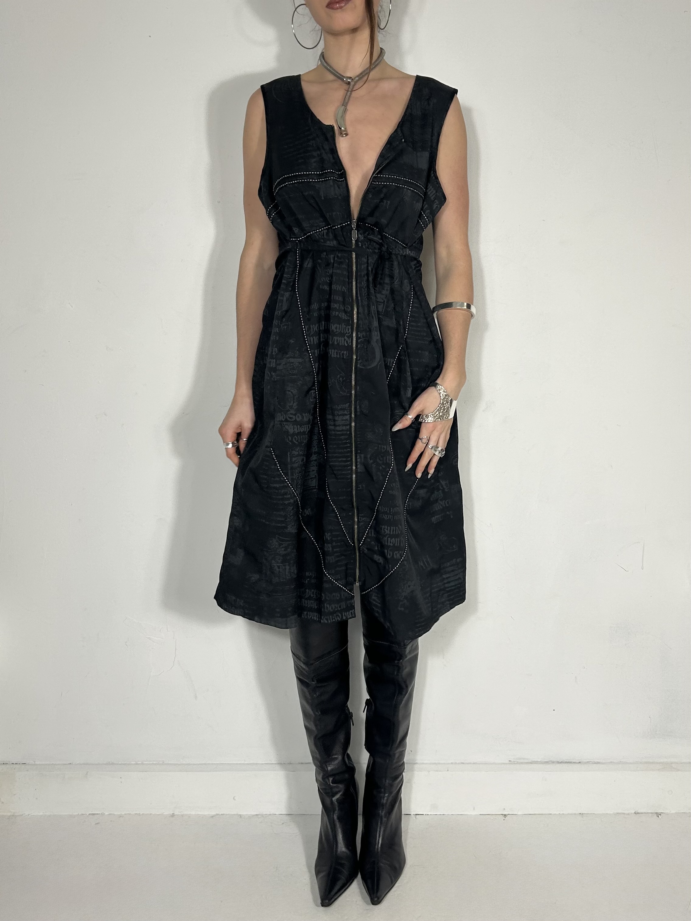 Midnight blue newspaper print dress with zip detailing and adjustable waist