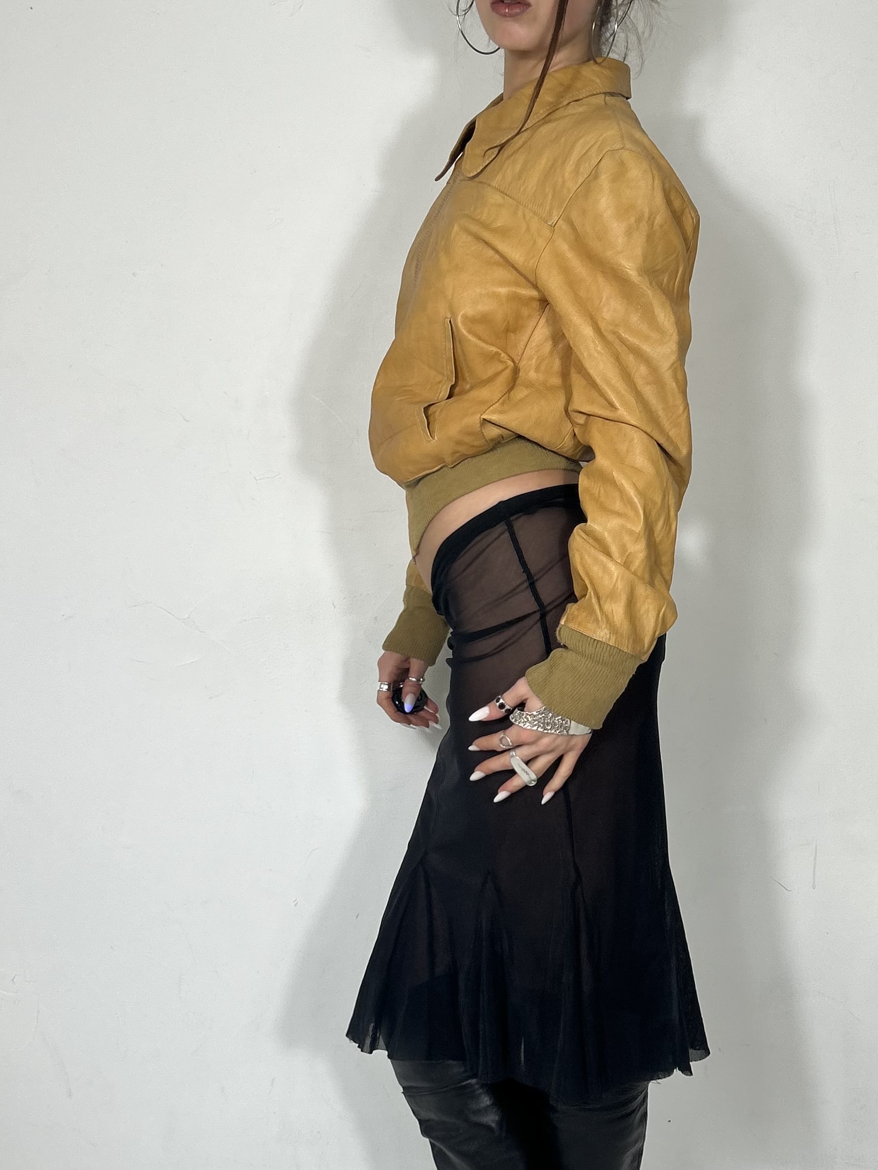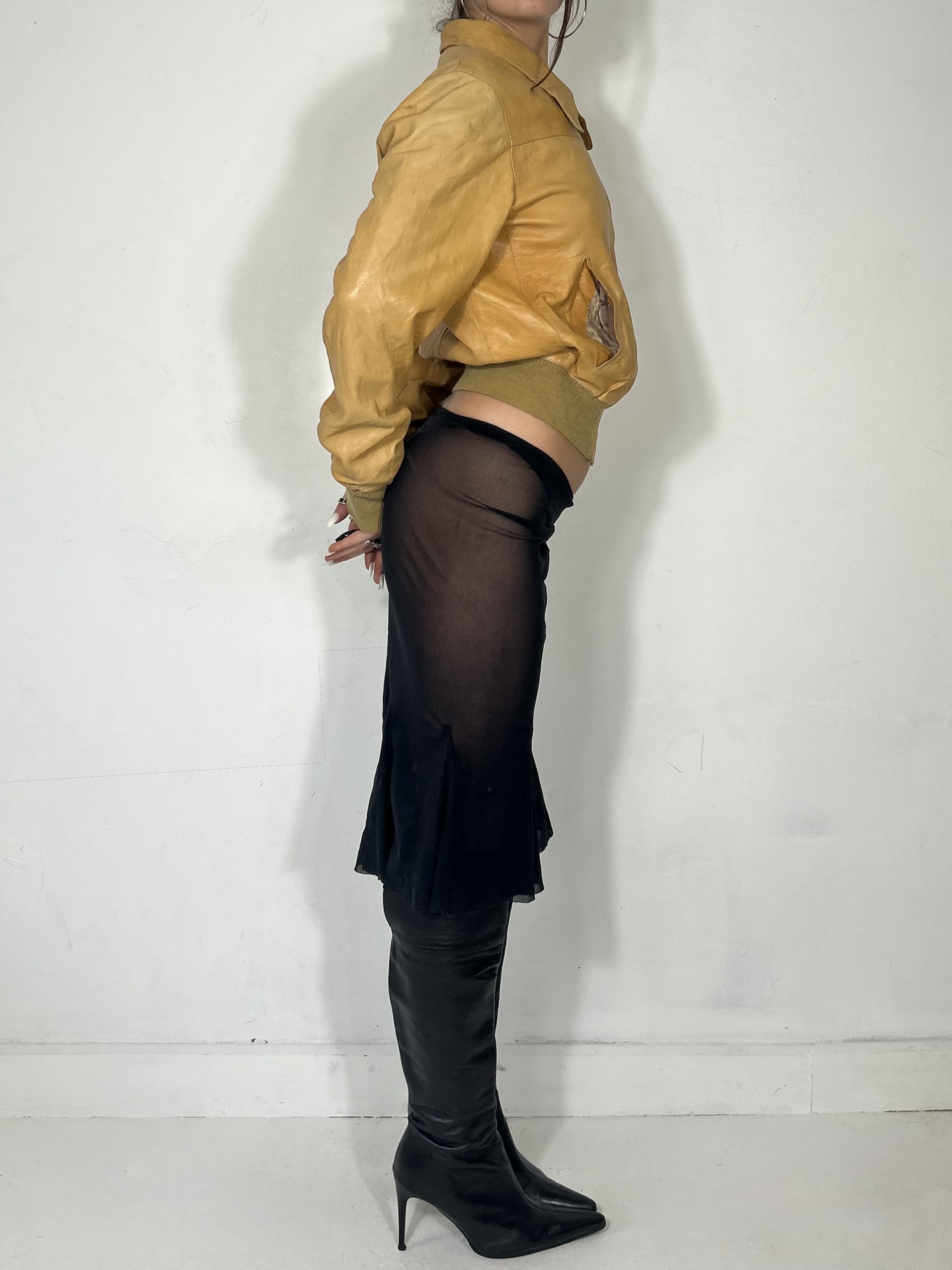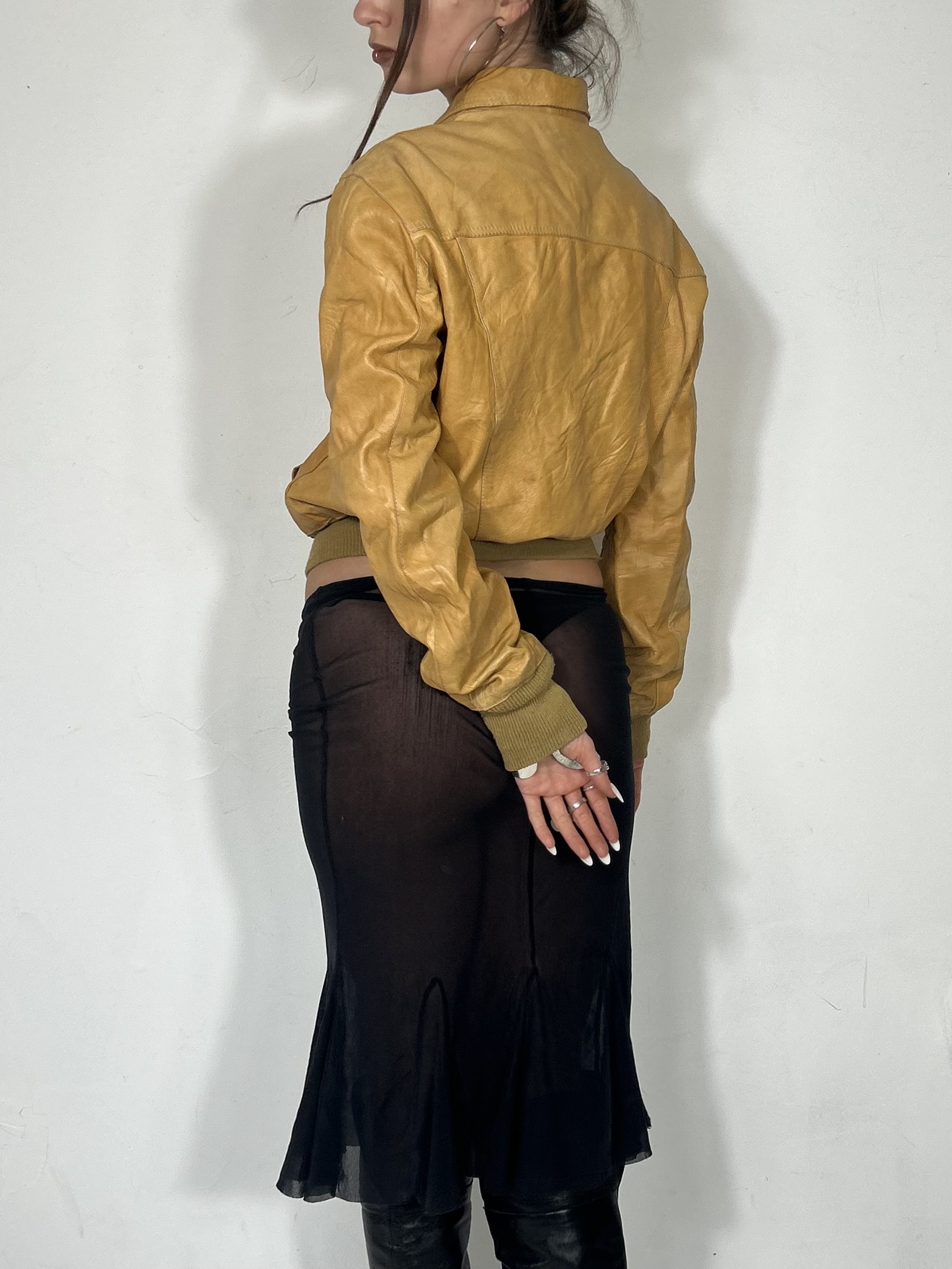 Mustard leather cinch waist jacket with folded collar detail