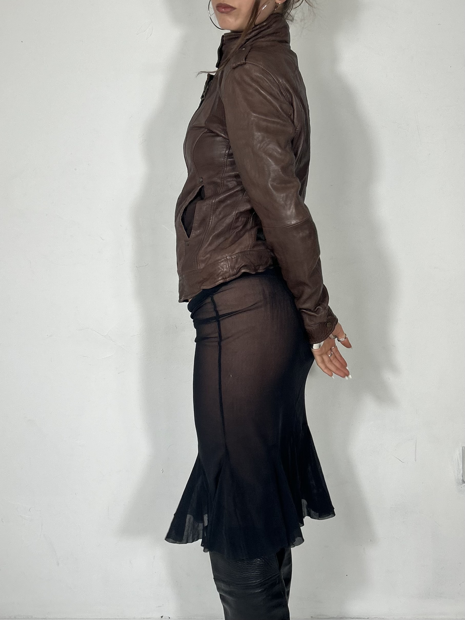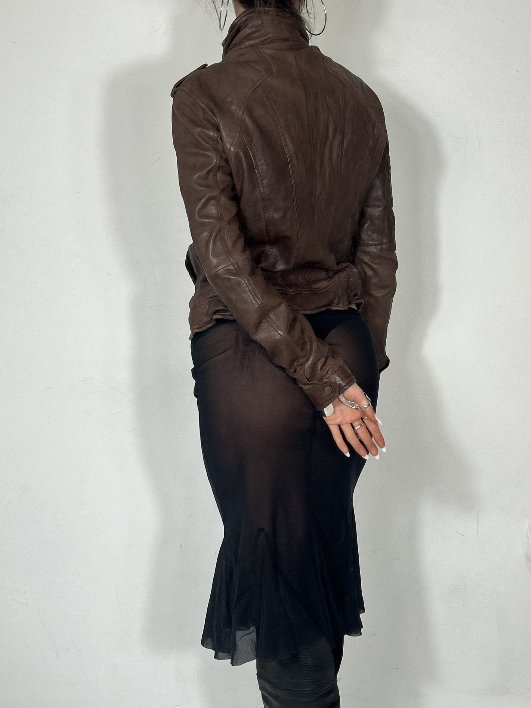 Tan high neck leather jacket with asymmetrical zip detailing