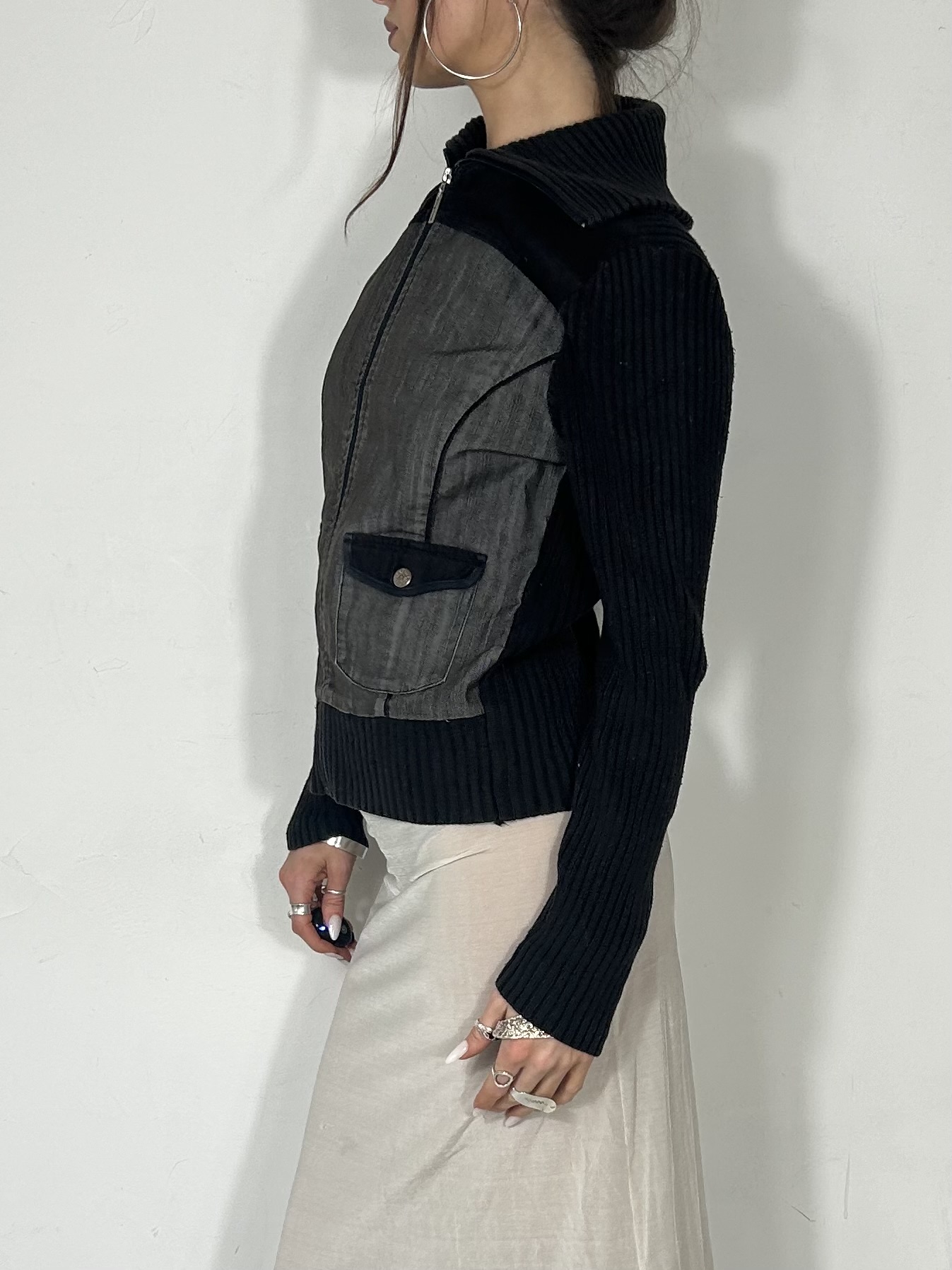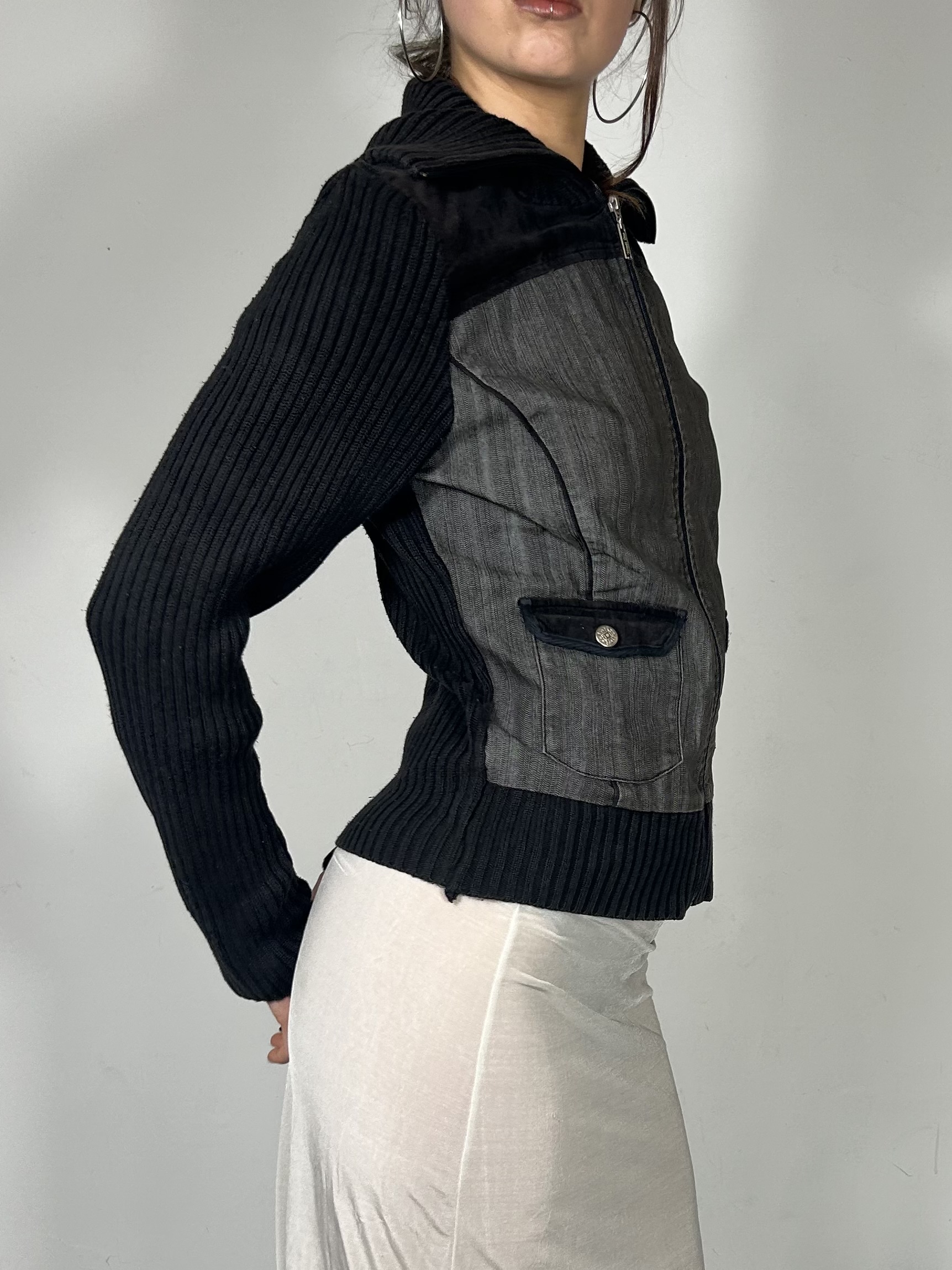 Charcoal denim and knit zip up jumper with high neckline and pocket detailing