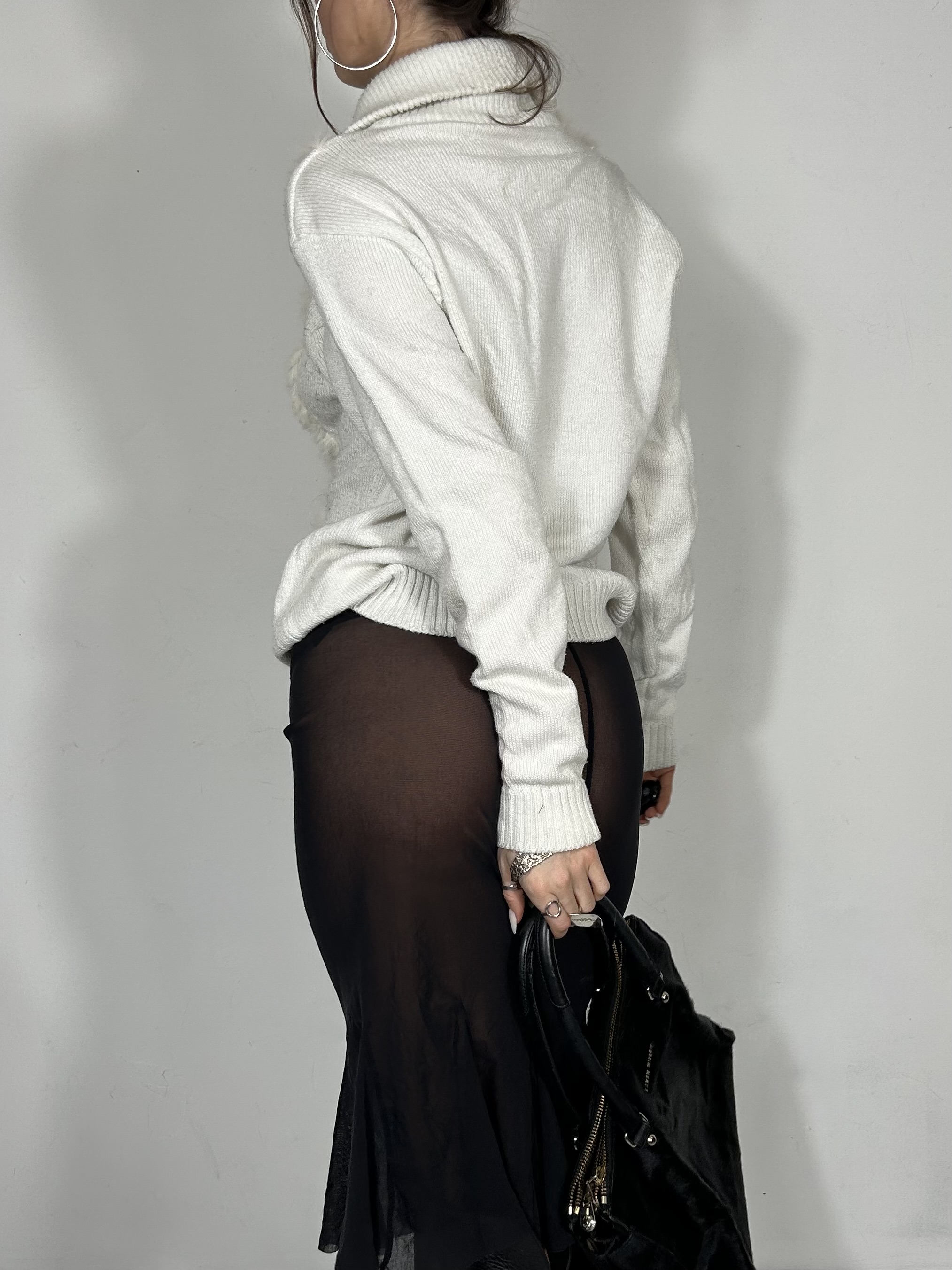White genuine fur and knit high neck zip up jumper with double zip detailing
