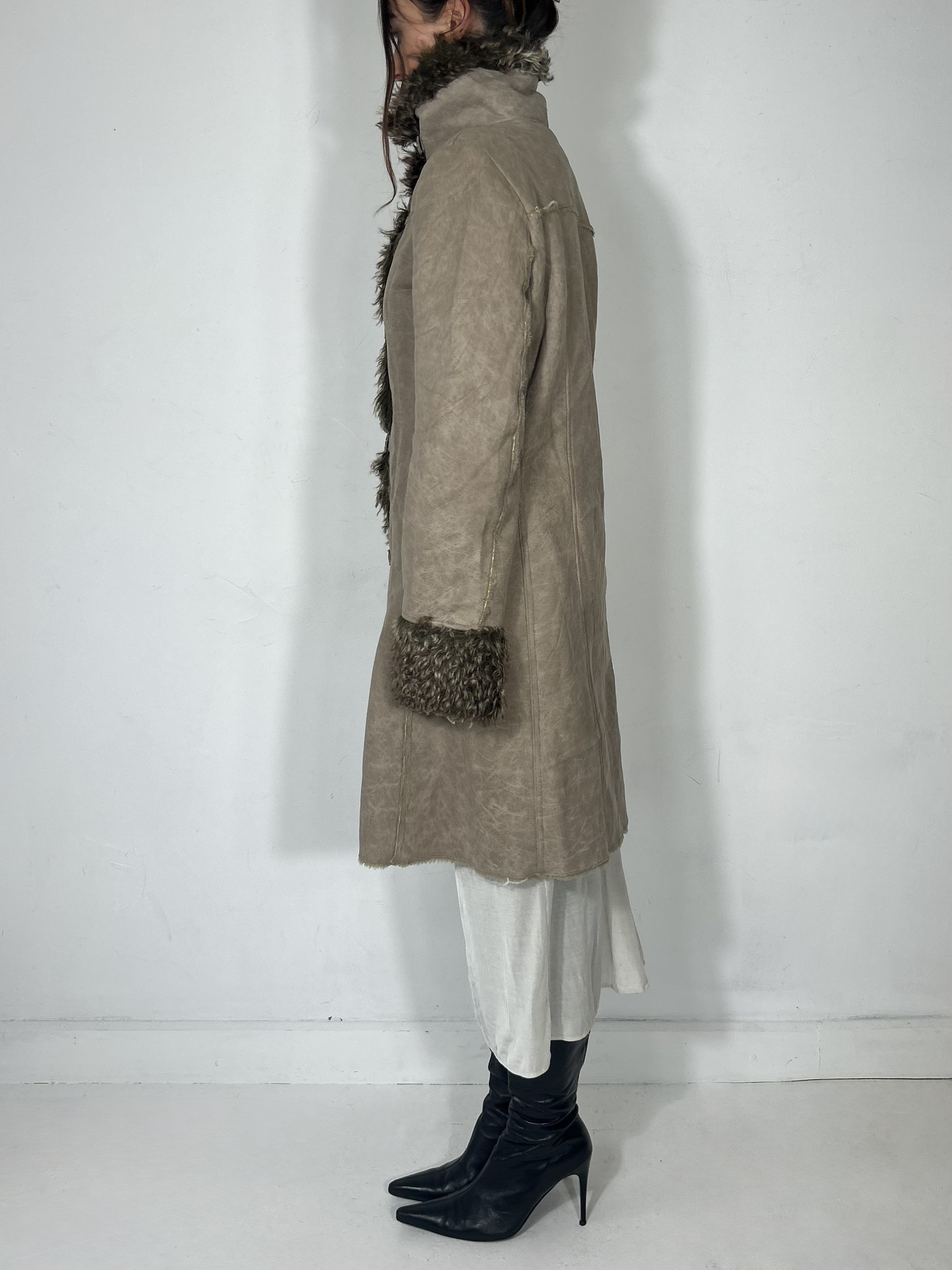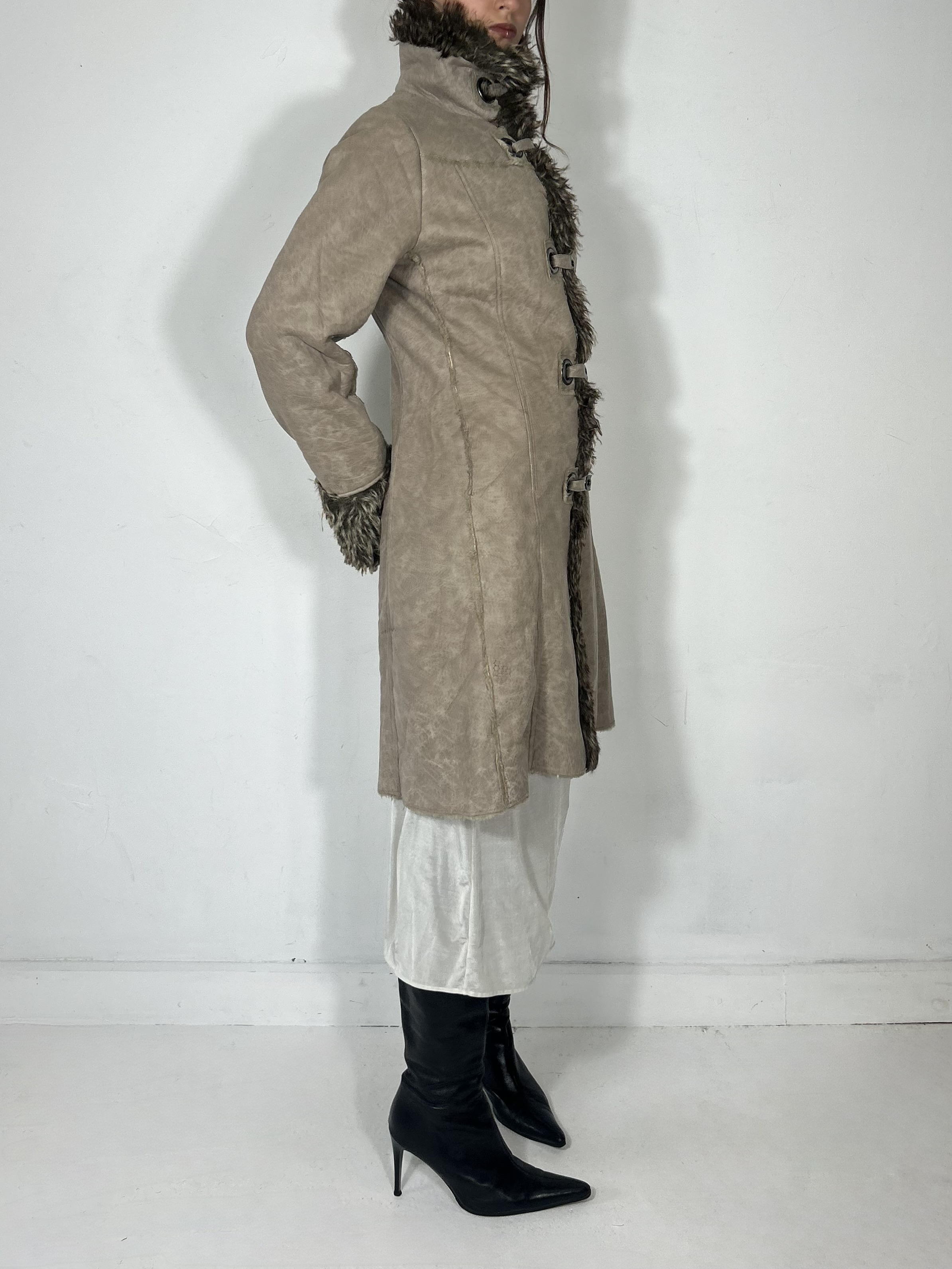 Sand suede and faux fur trench with silver eyelet detailing