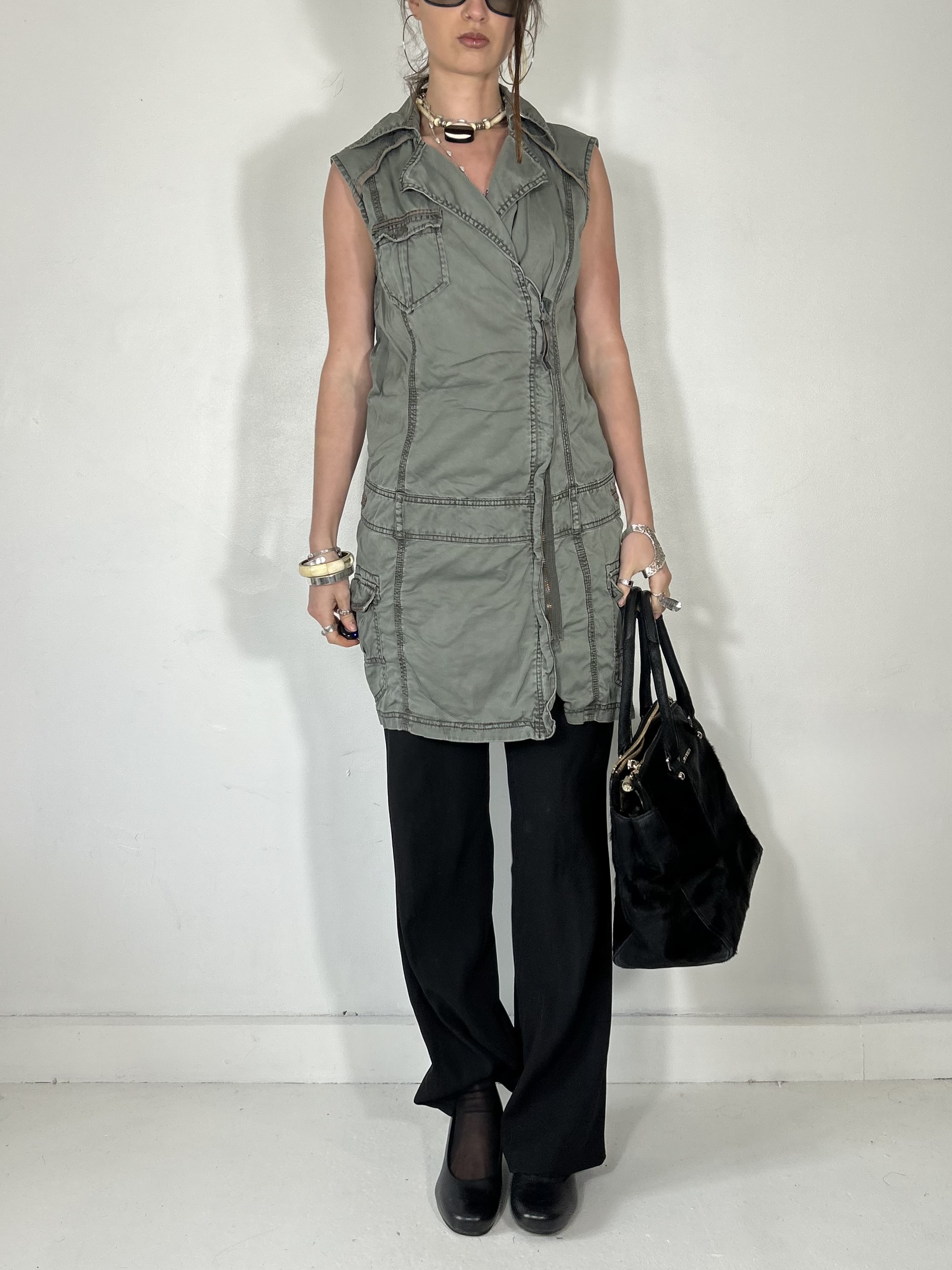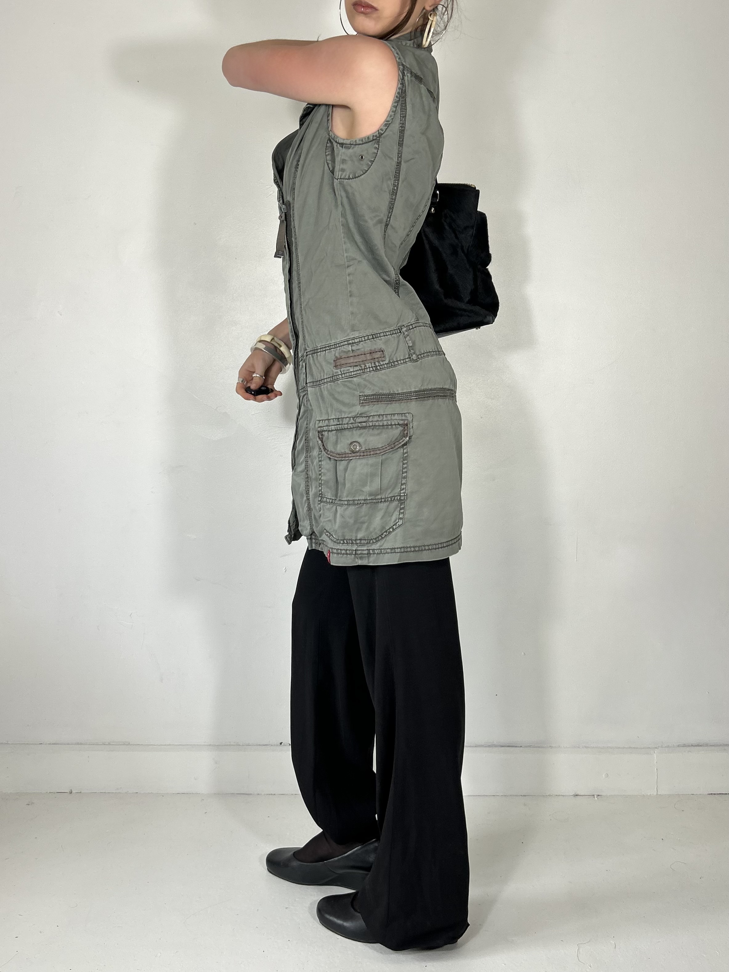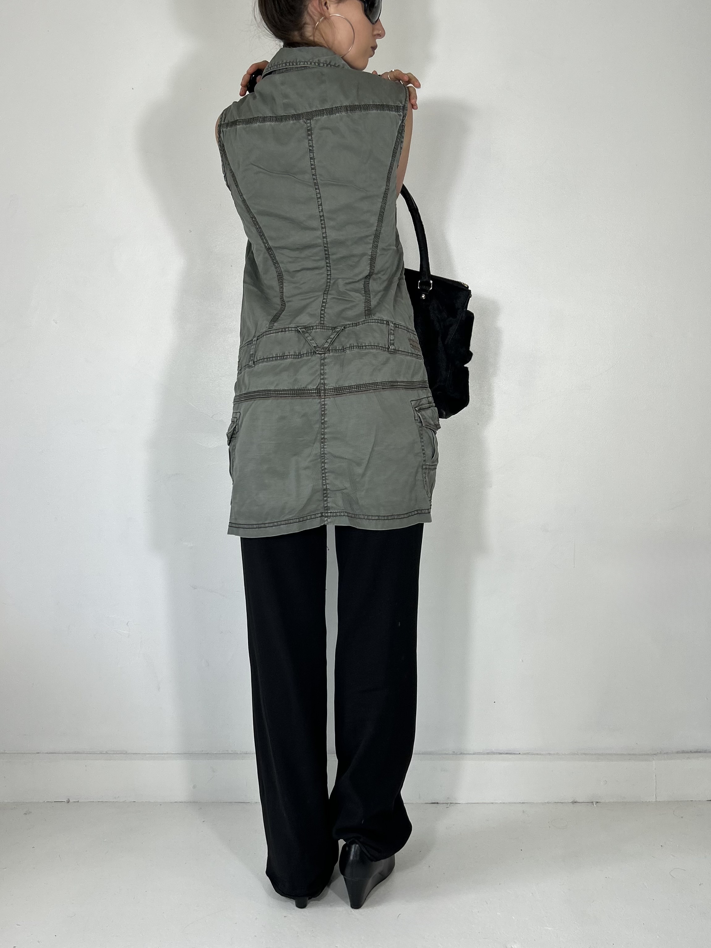 Khaki green asymmetrical utility mini dress with zip detailing