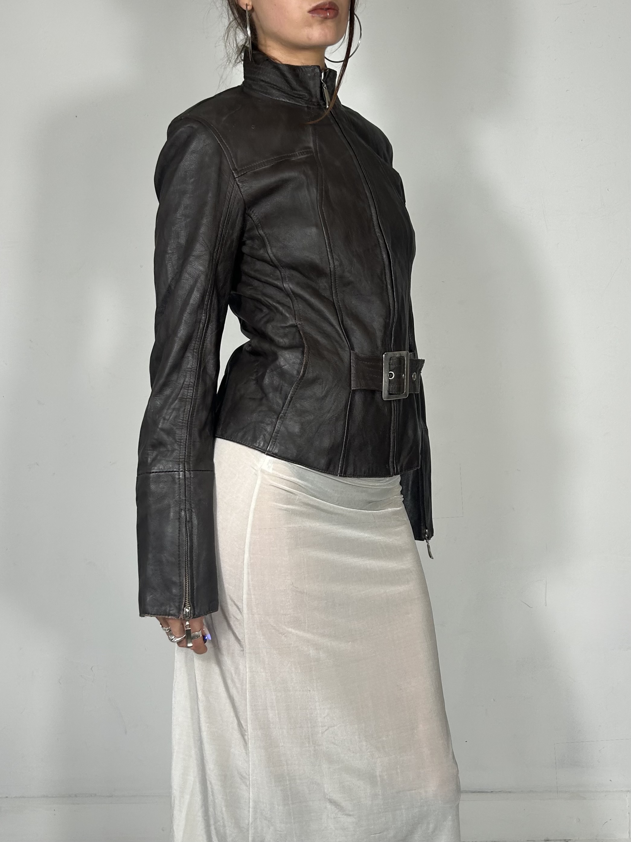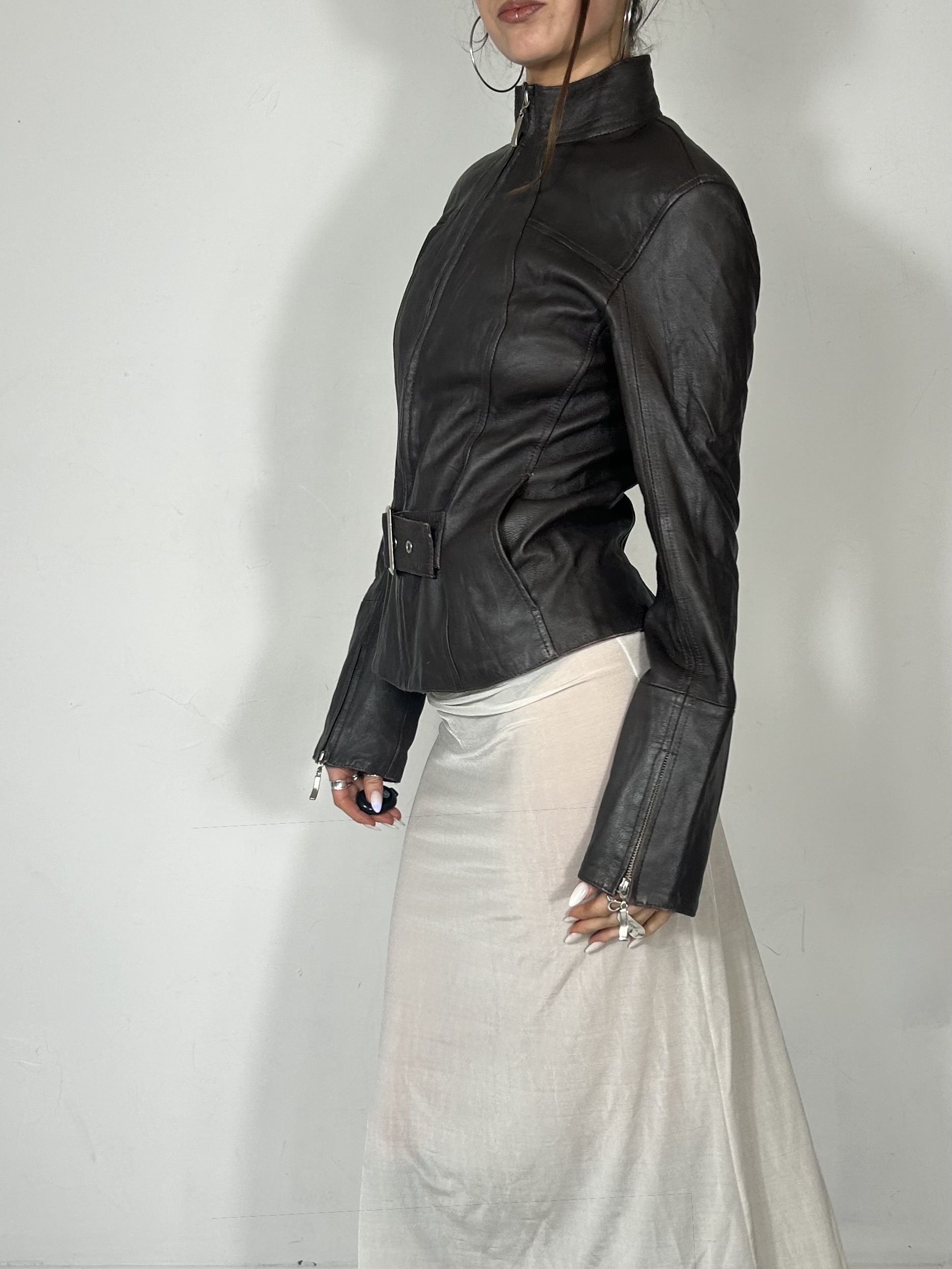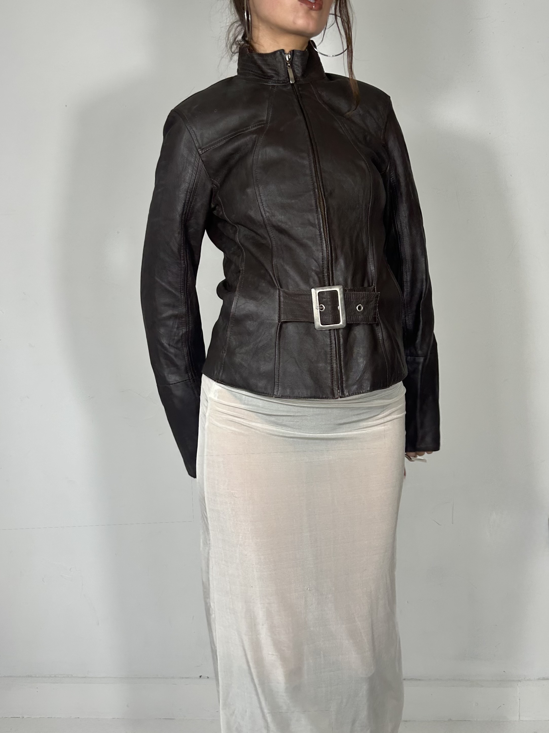 Chocolate brown high neck leather jacket with silver buckle detail