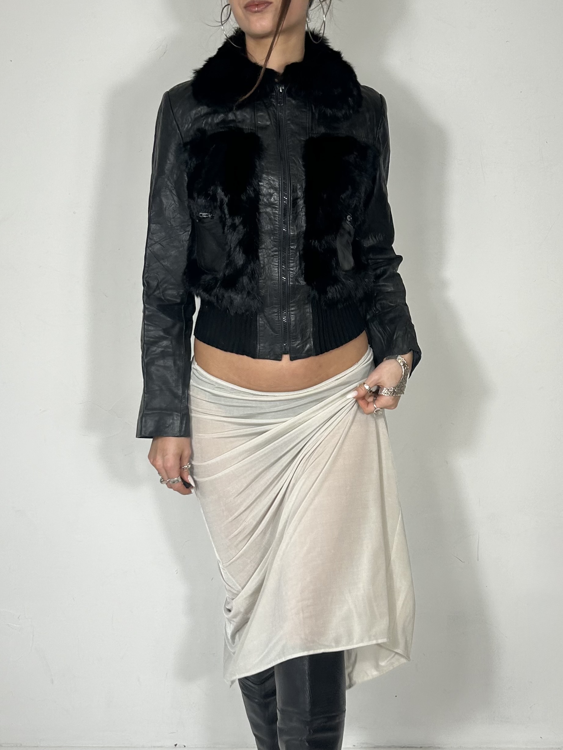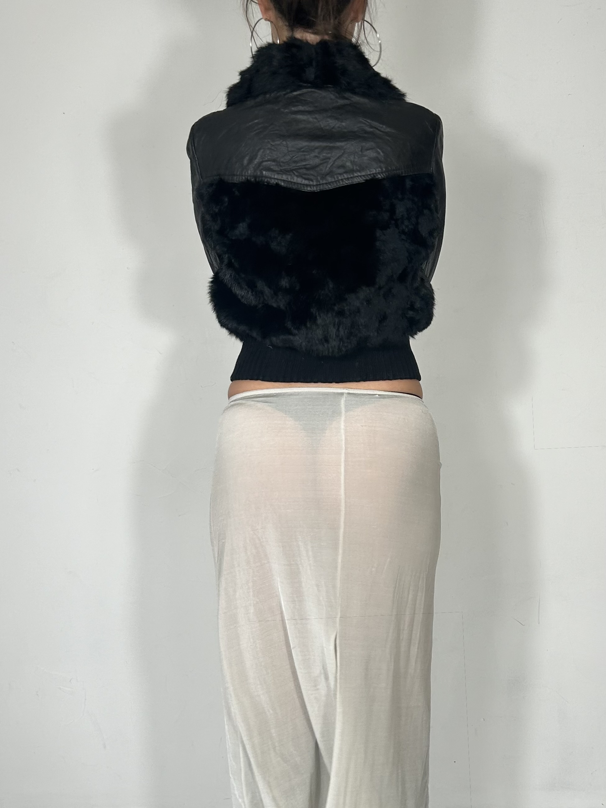 Black genuine fur and leather panelled jacket with cinch waist detailing