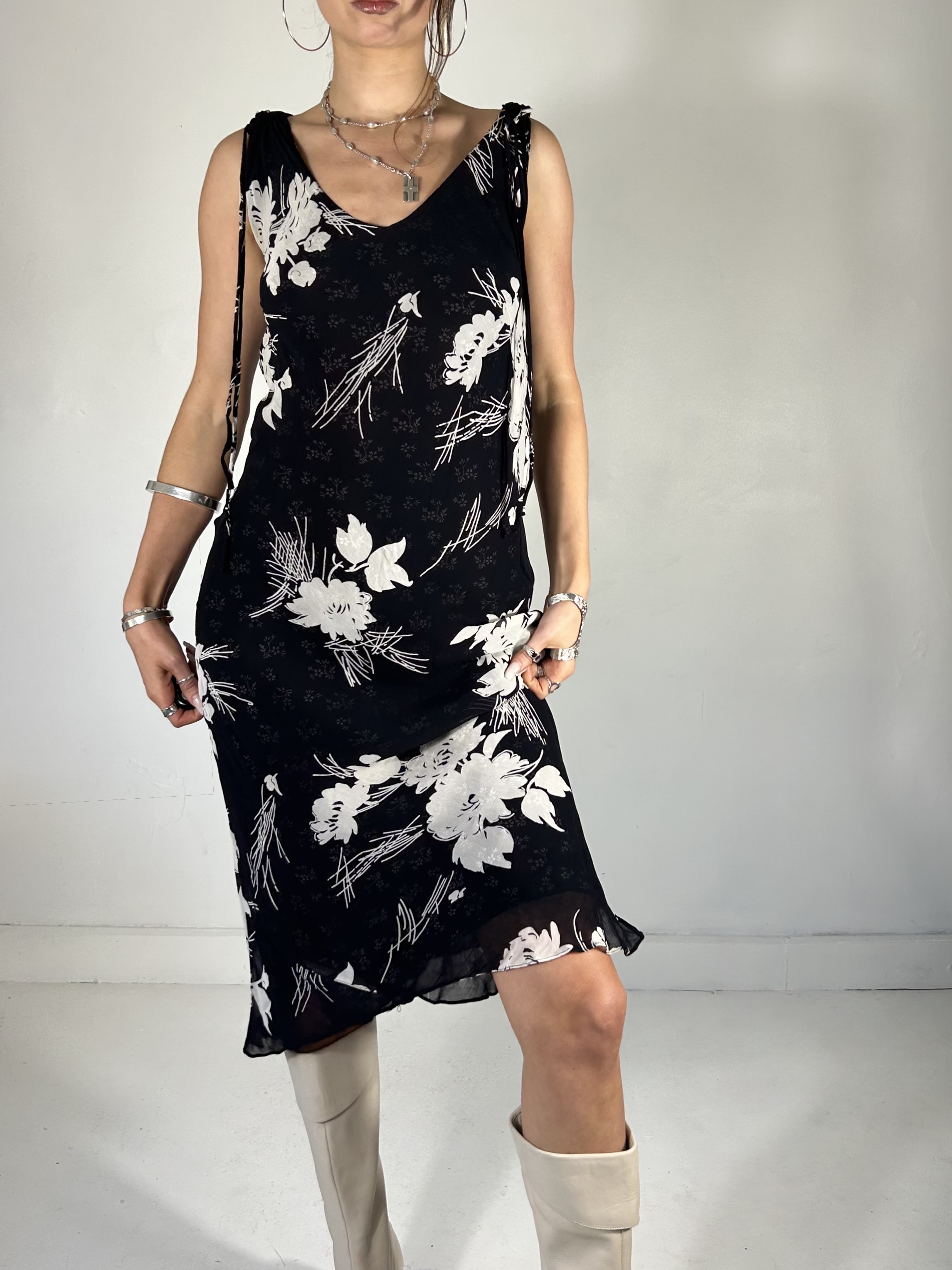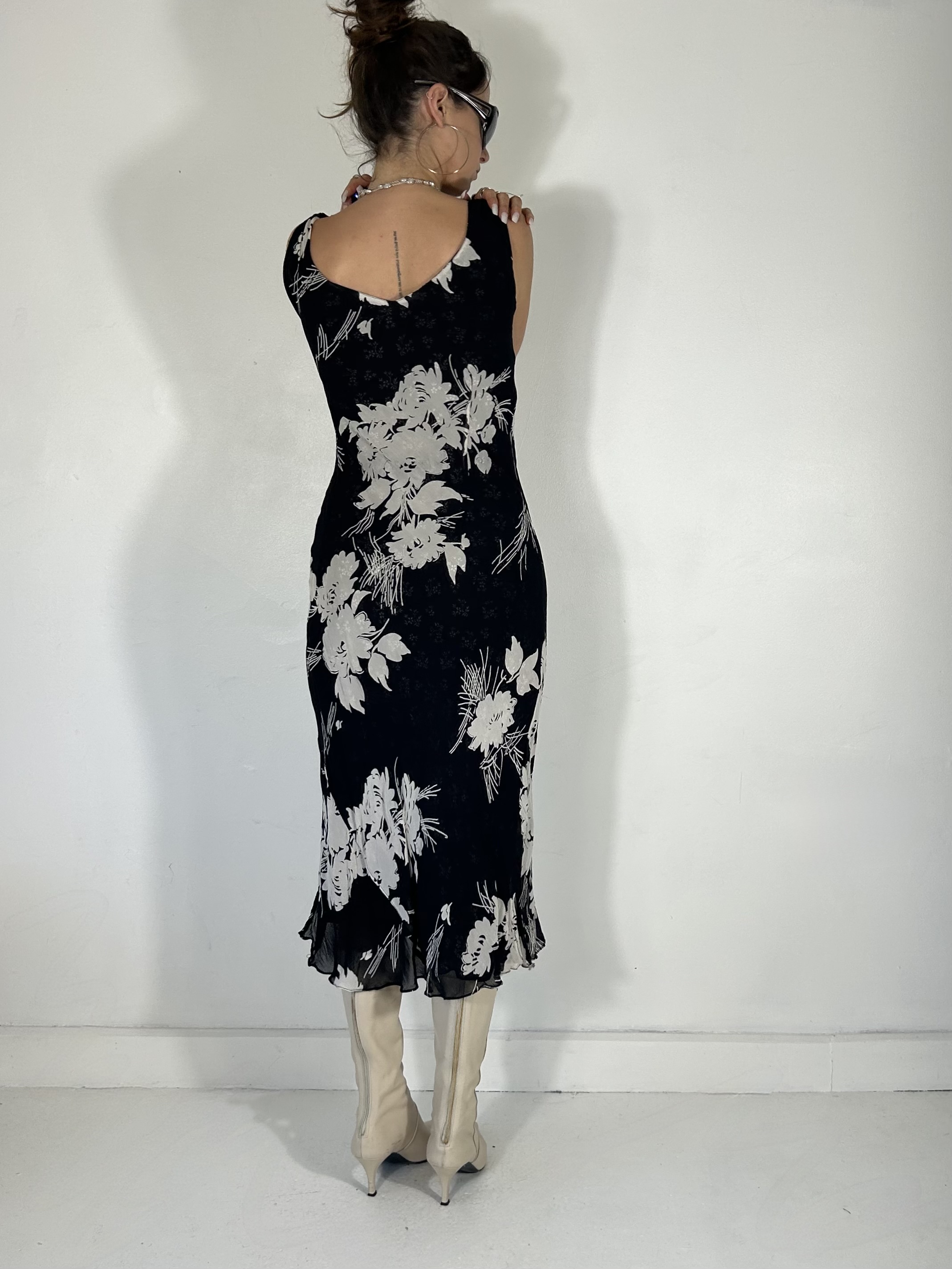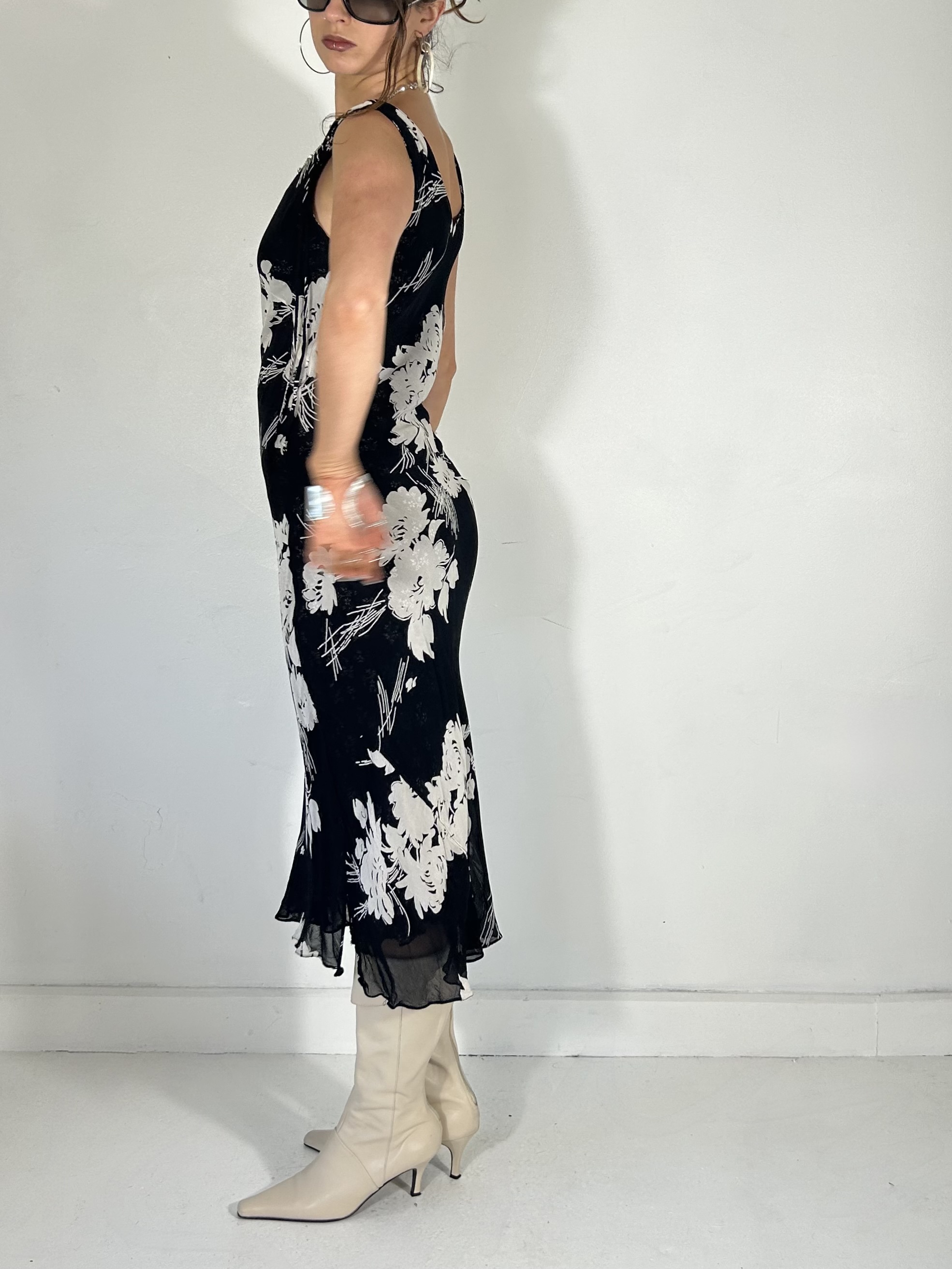 Reversible black and white floral chiffon midi dress with plunge neckline