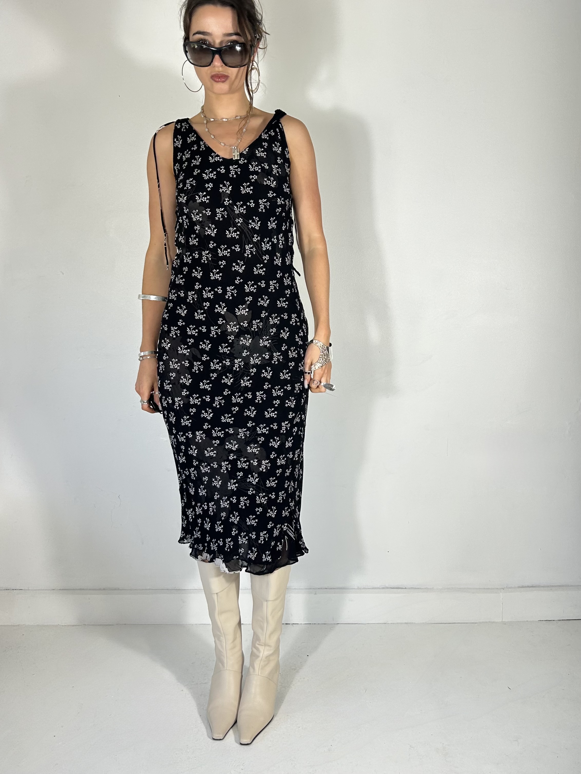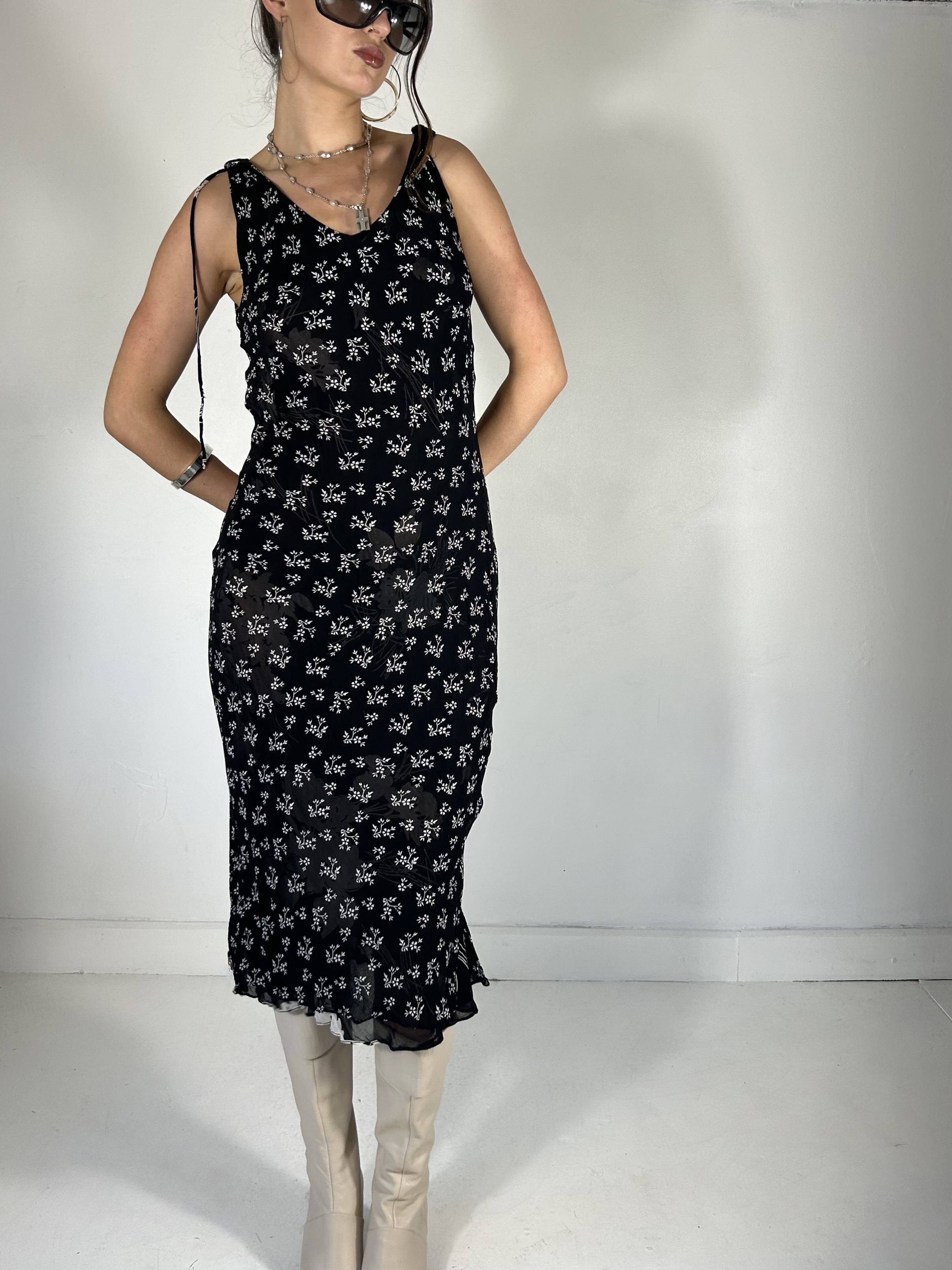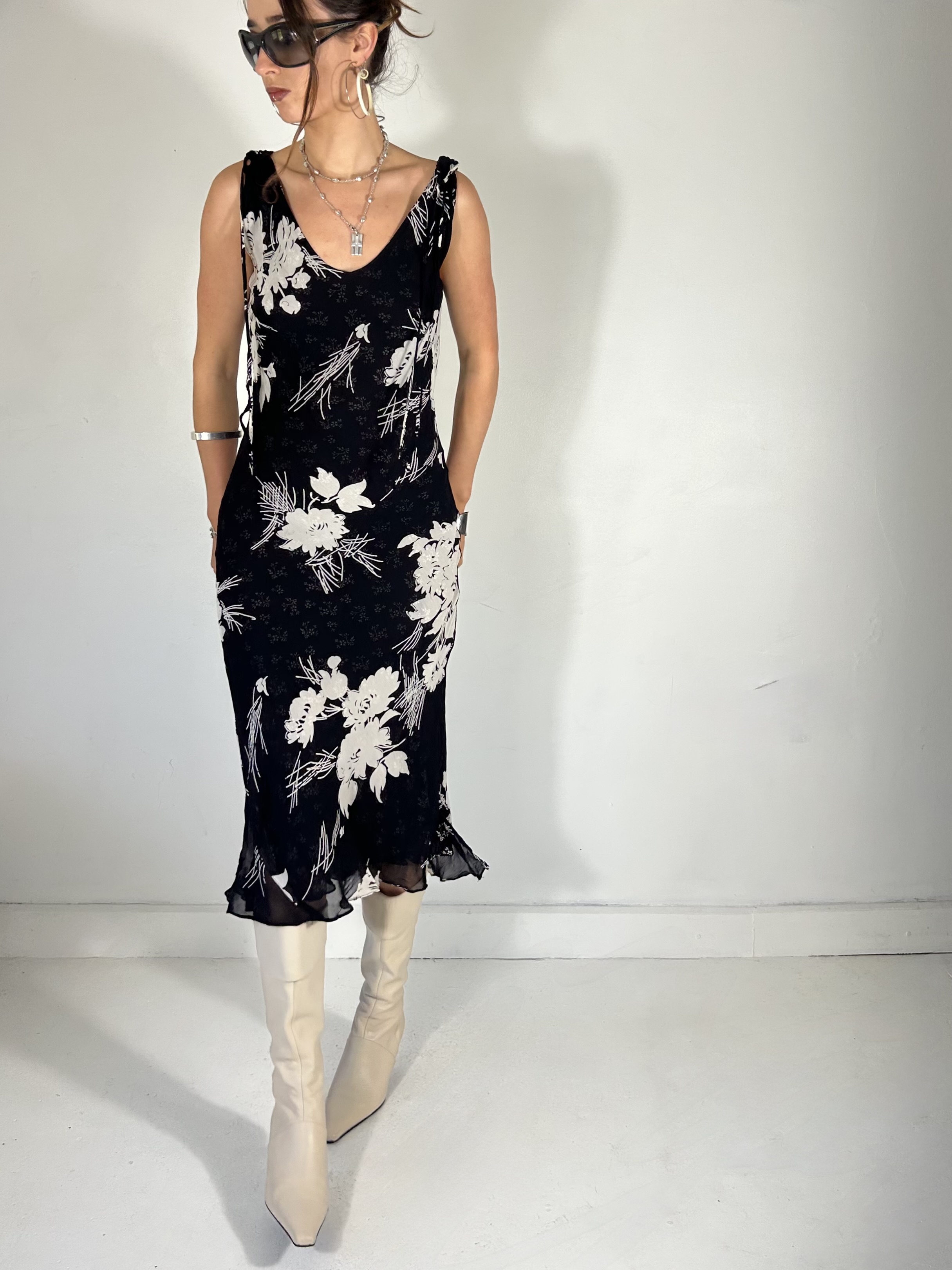Reversible black and white floral chiffon midi dress with plunge neckline