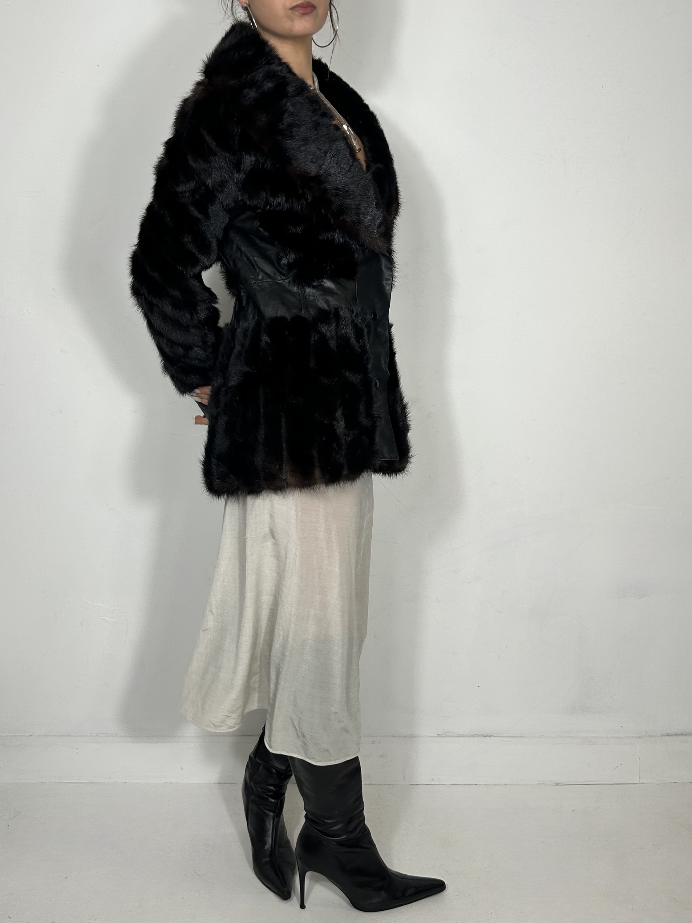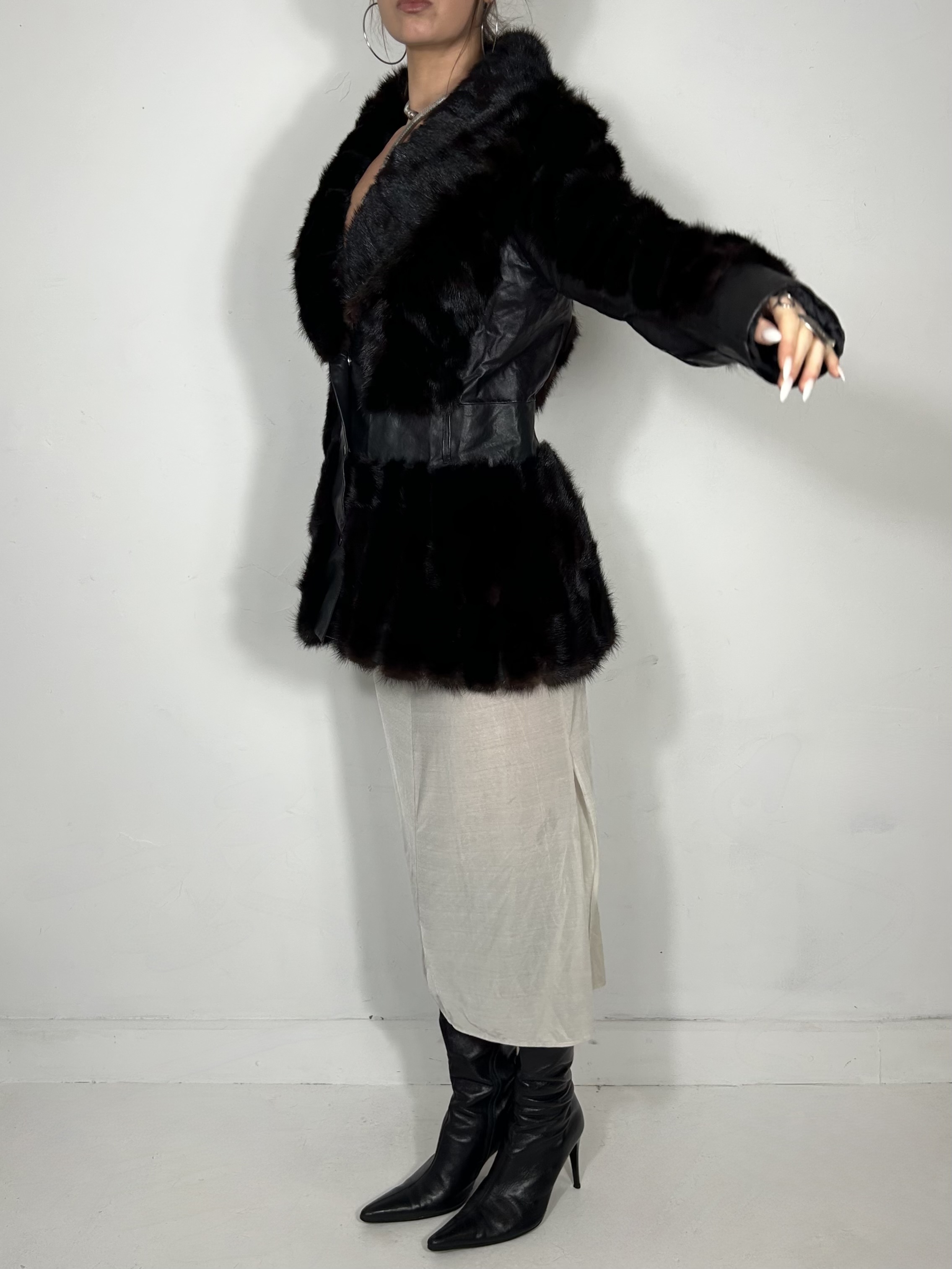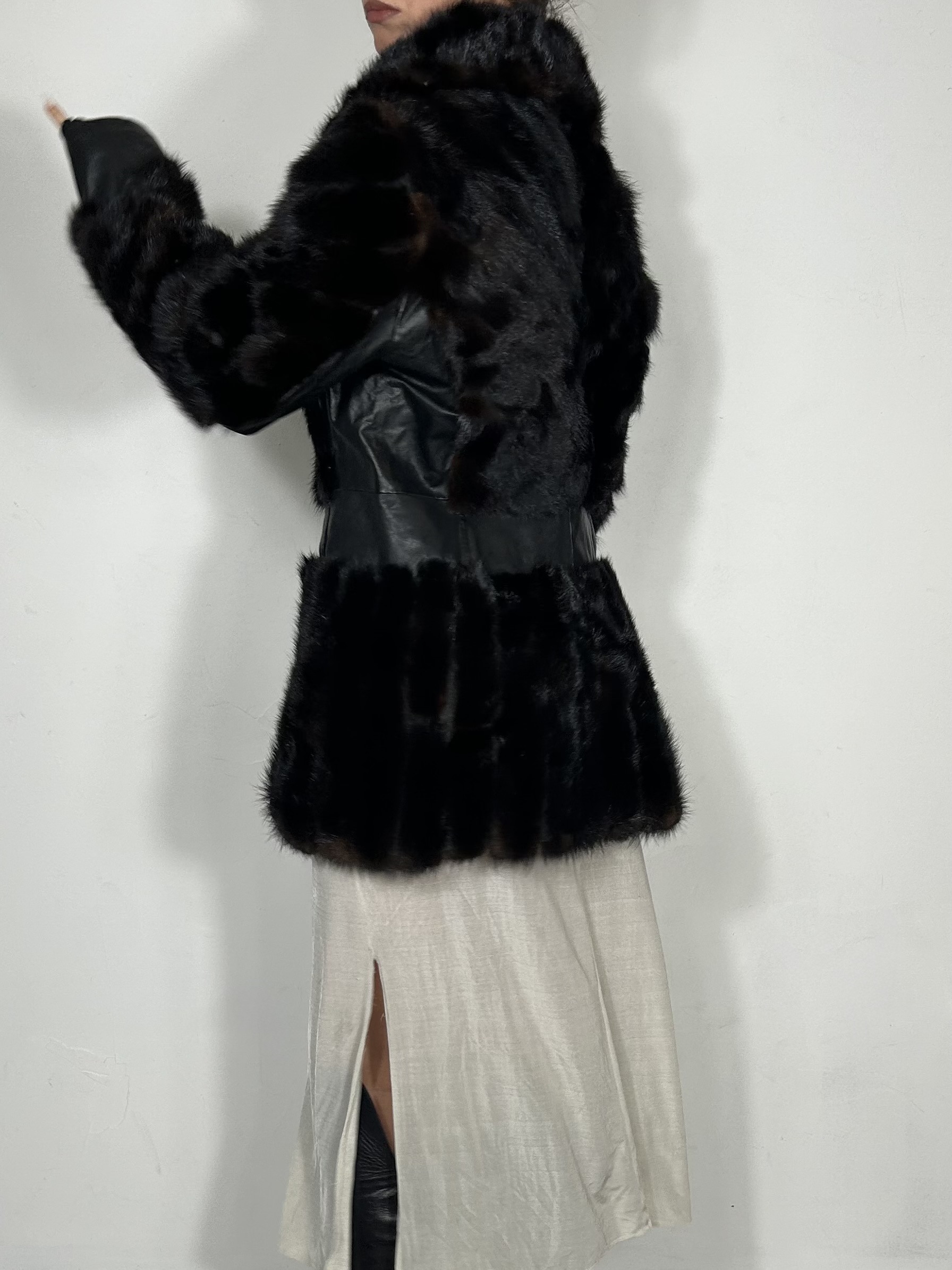 Chestnut genuine fur coat with cinch waist and leather panel detailing