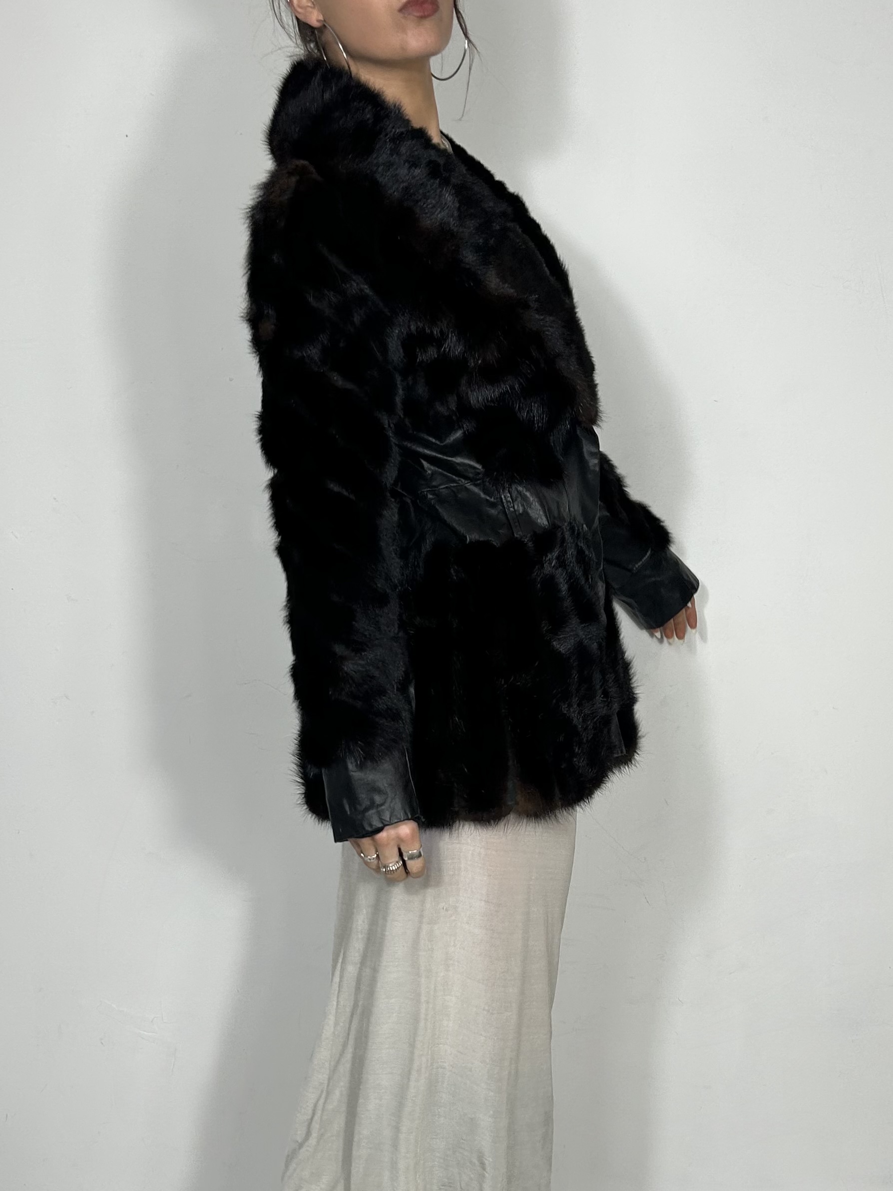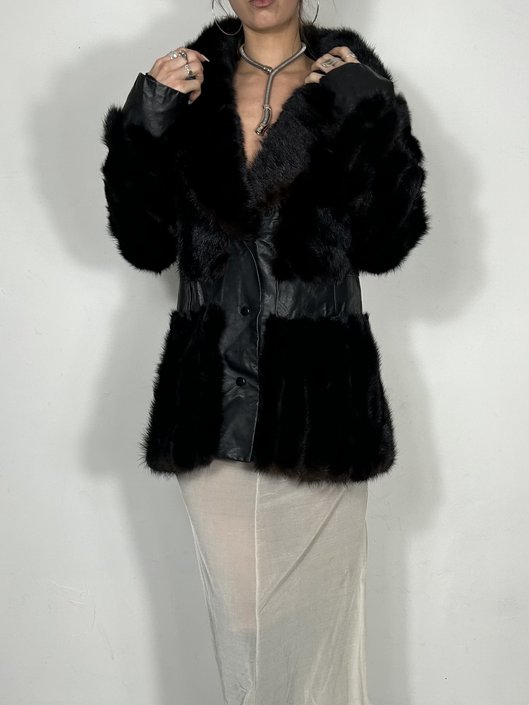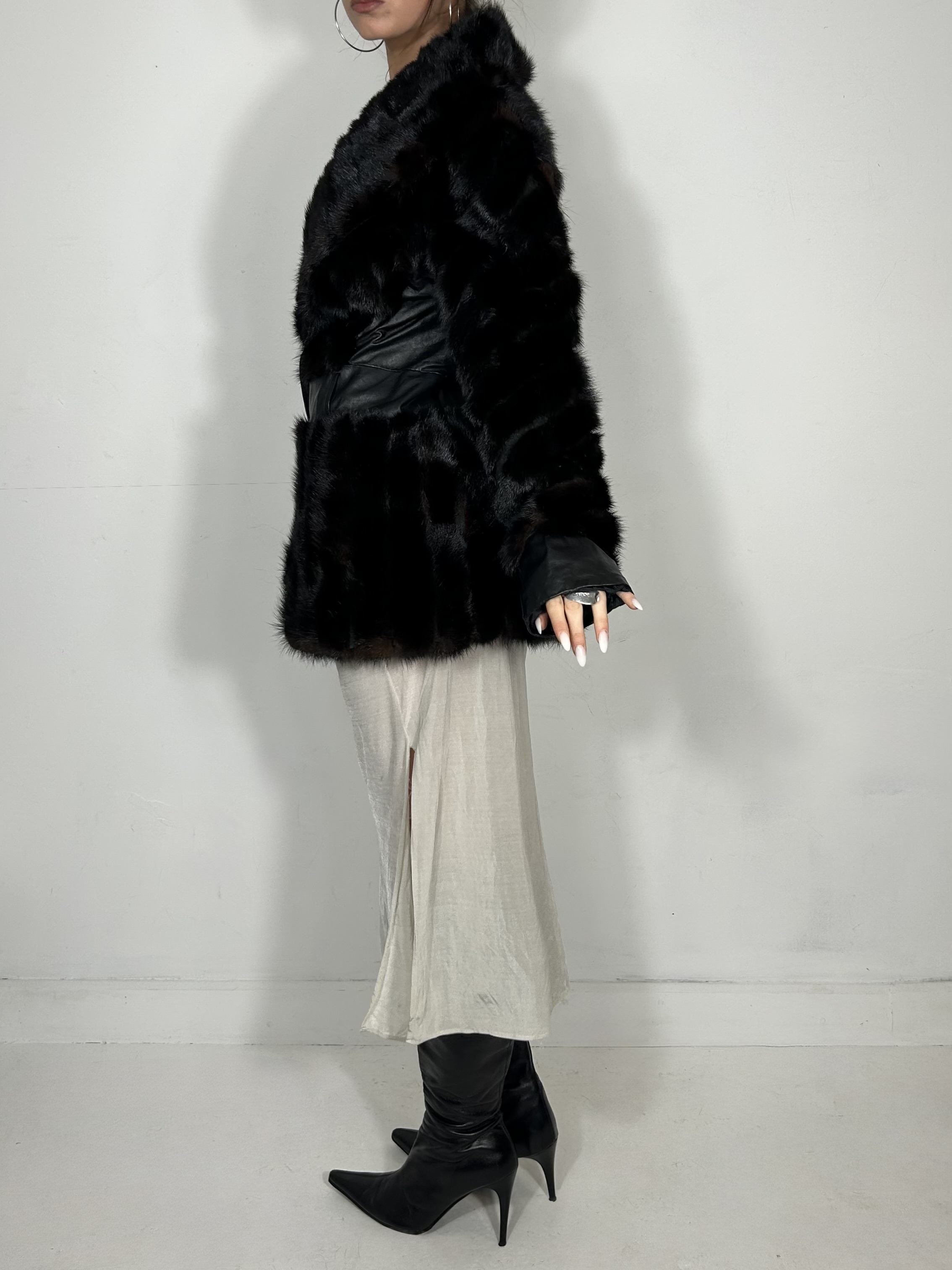 Chestnut genuine fur coat with cinch waist and leather panel detailing
