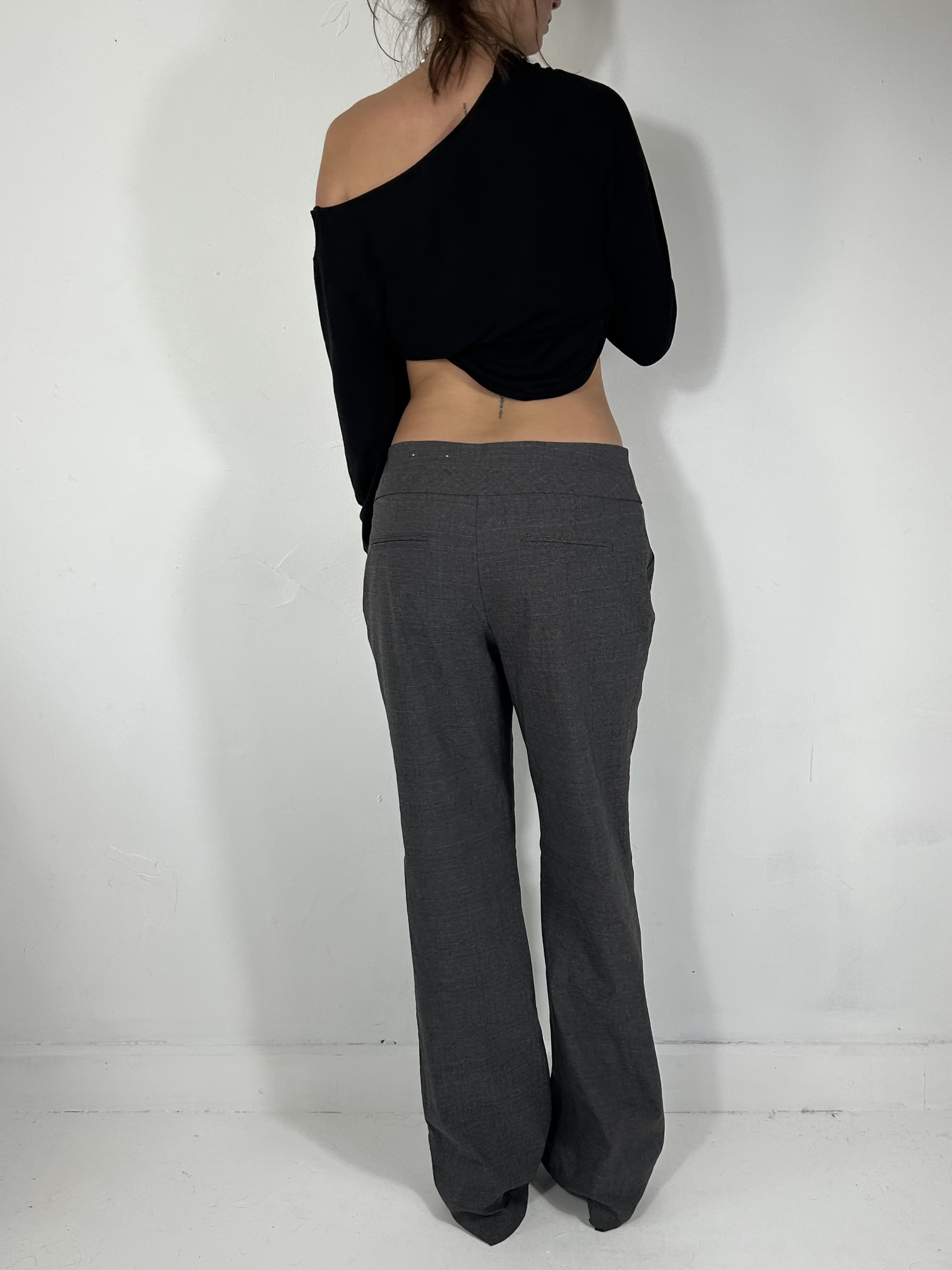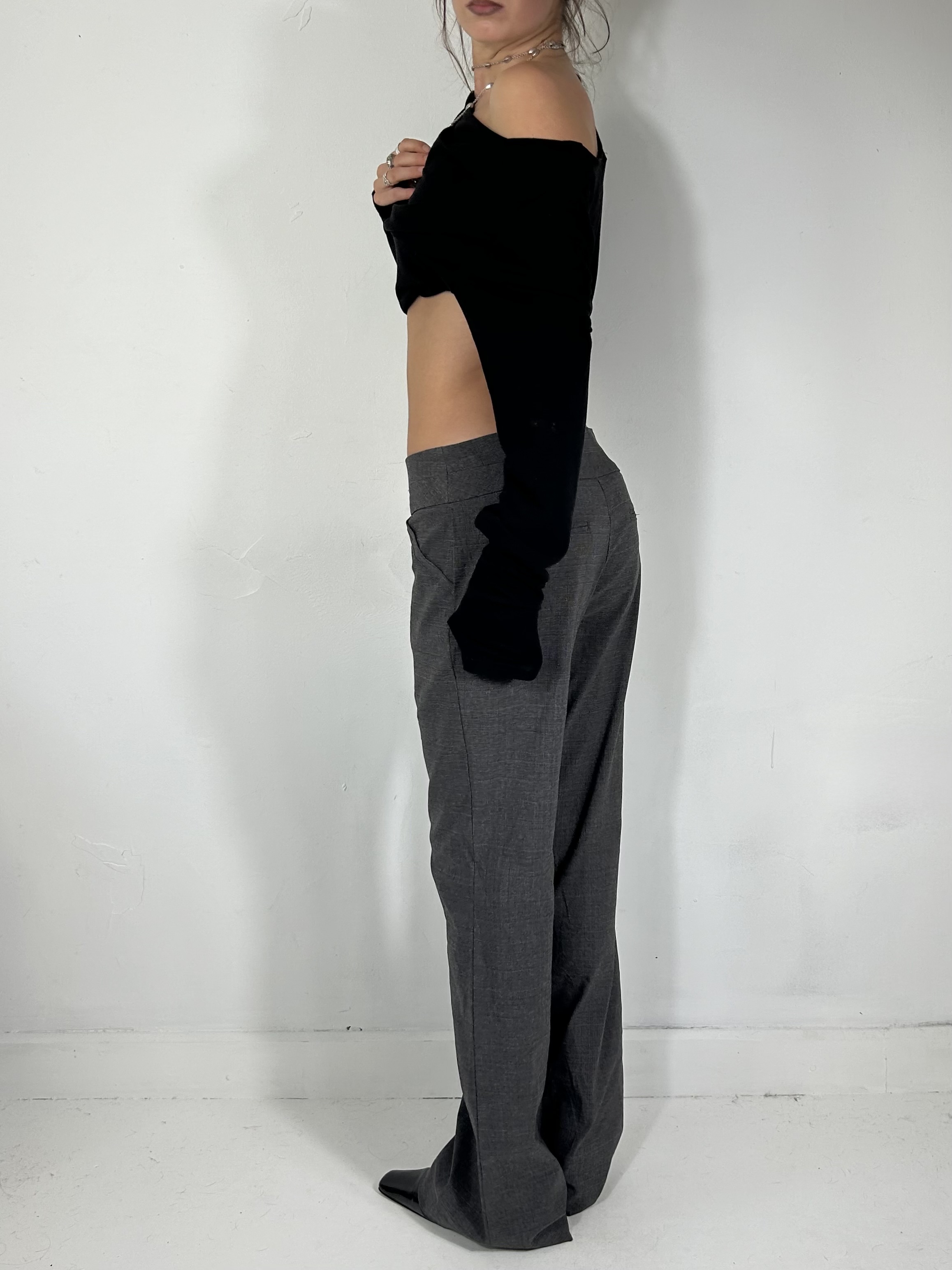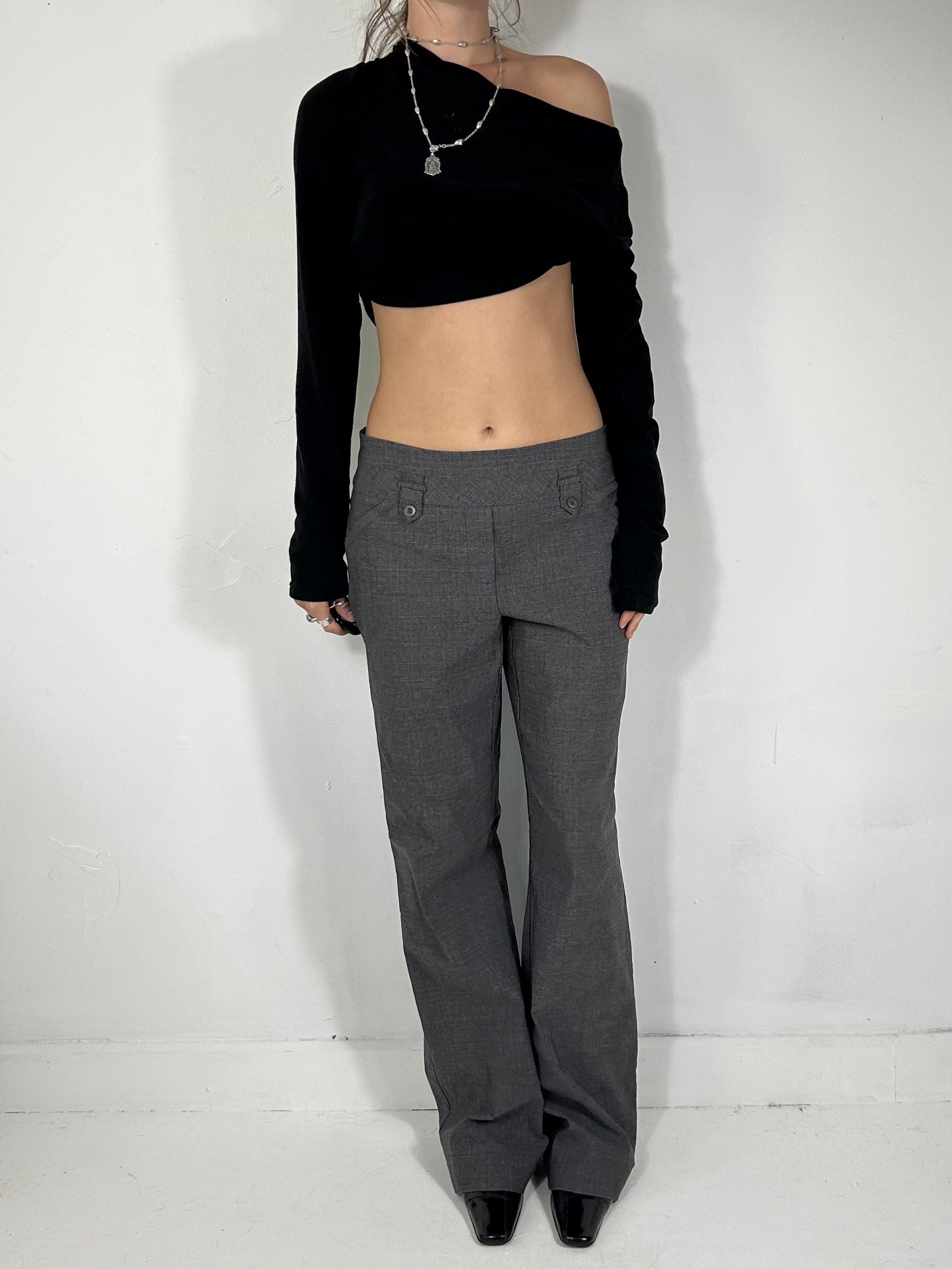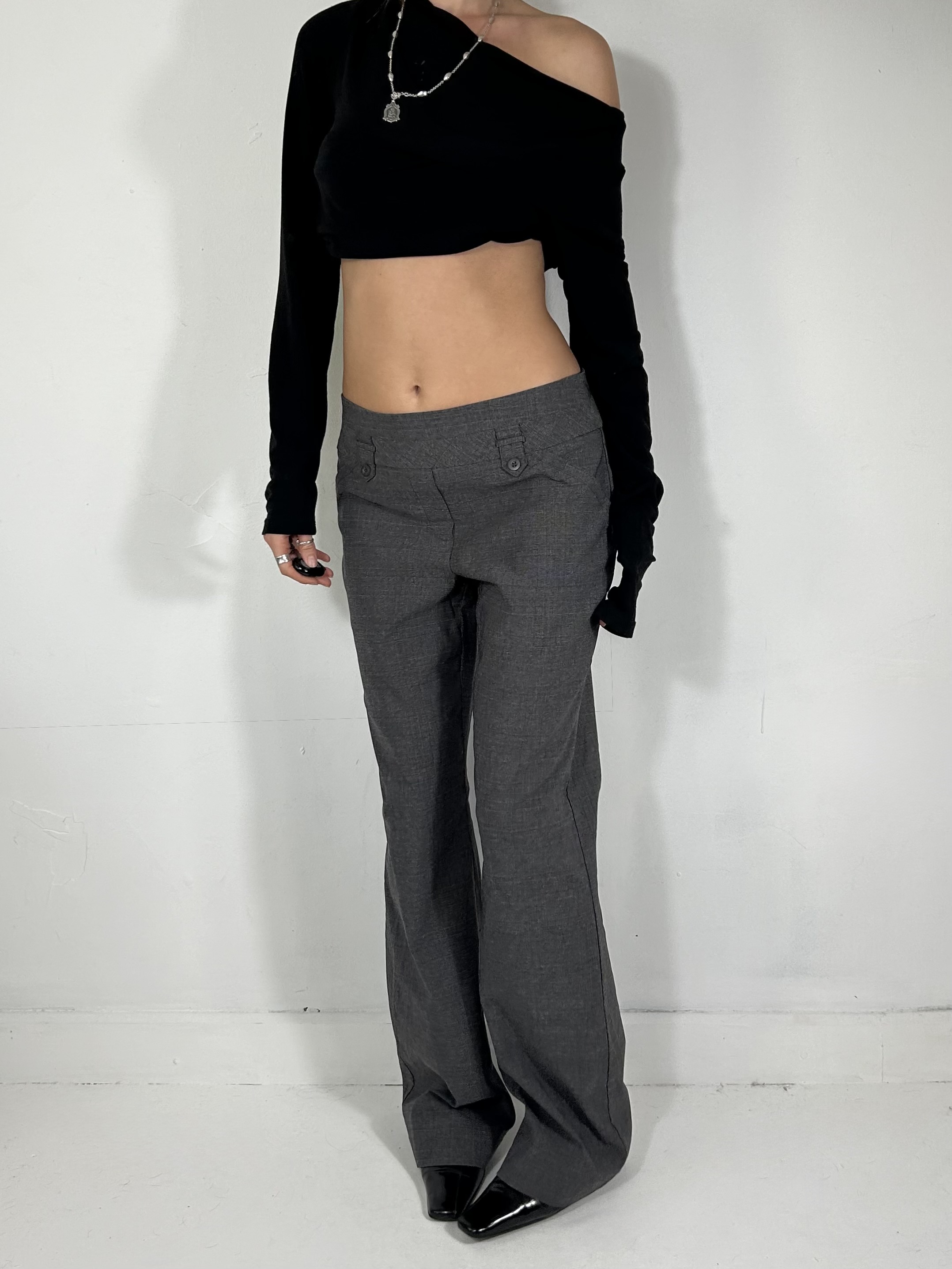Low rise straight leg suit trousers with thick waistband and double buckle detailing