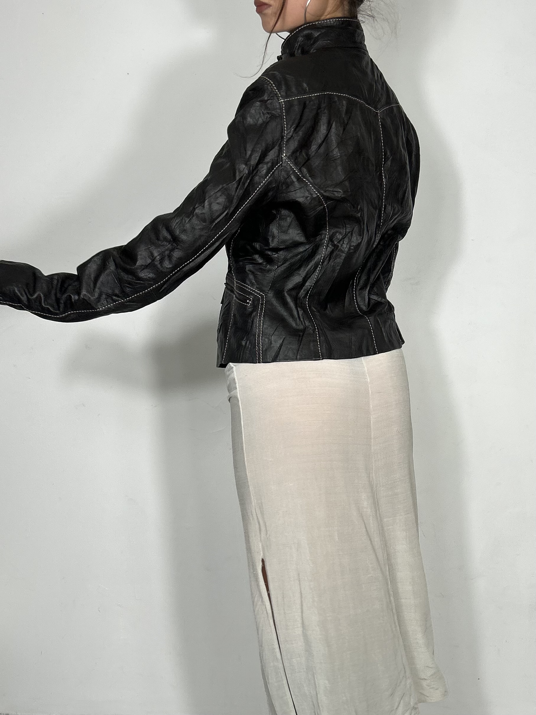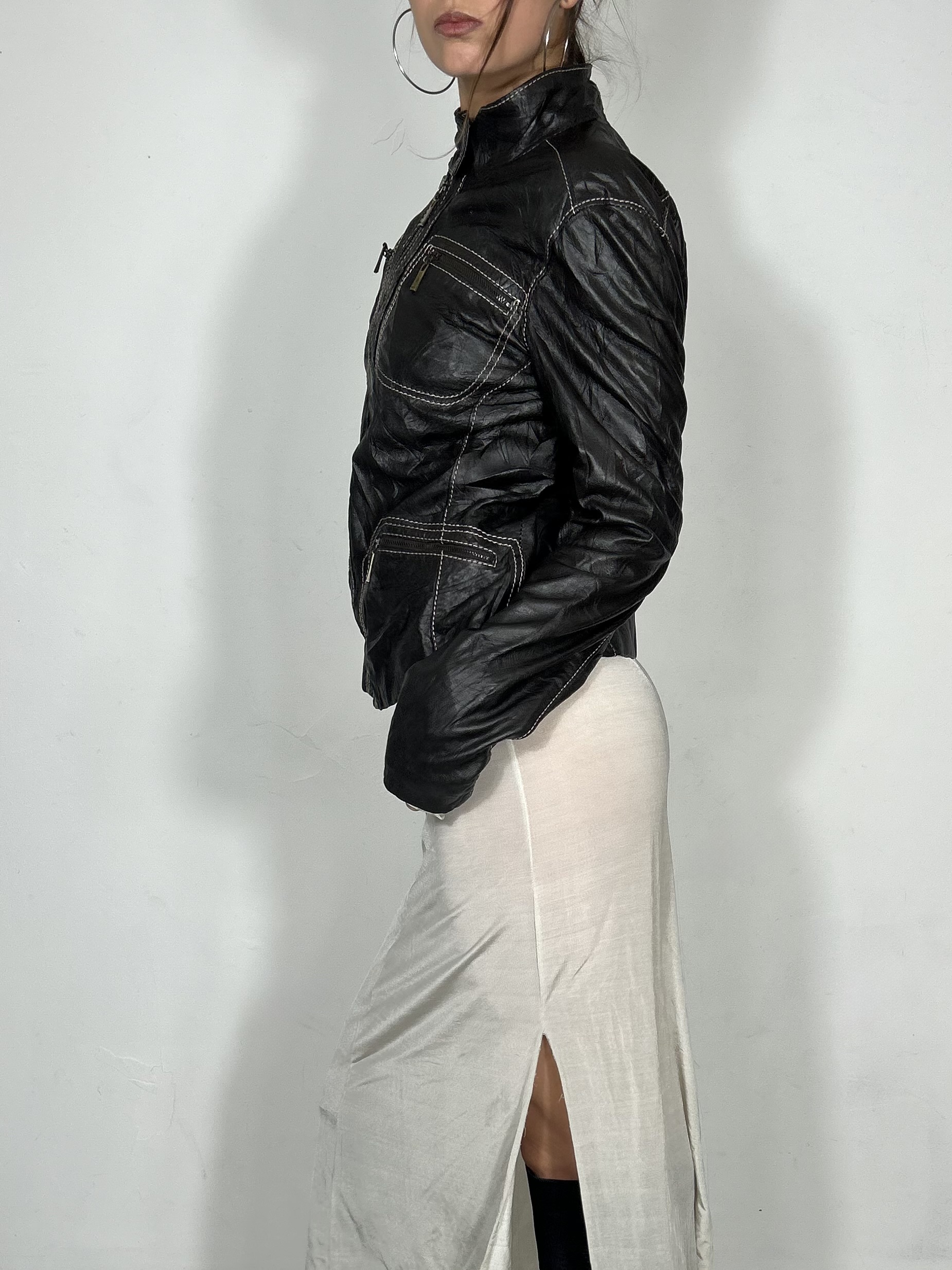 Black fitted leather jacket with contrast stitch detailing and utility pockets