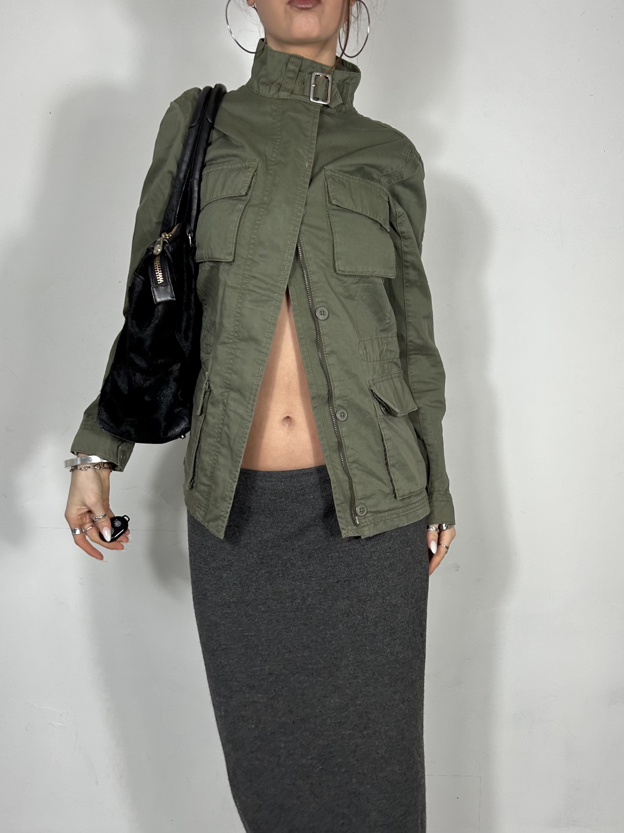 Khaki green canvas jacket with silver chrome buckle detailing and utility pockets