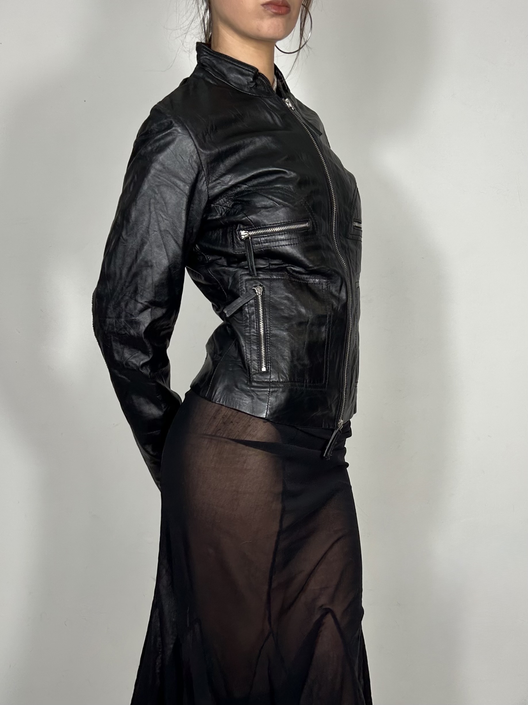 Black leather double zip blazer jacket with stitch detailing