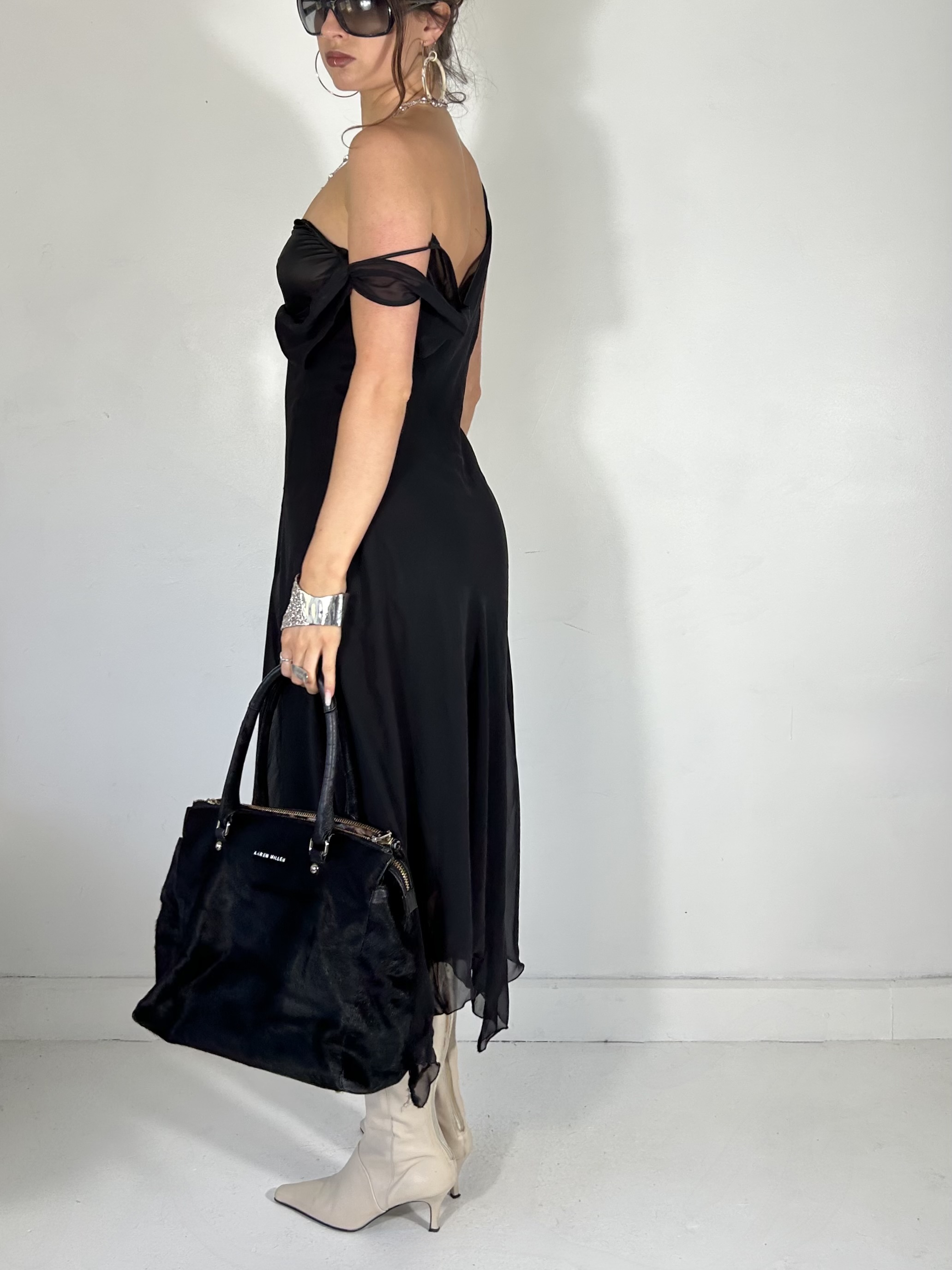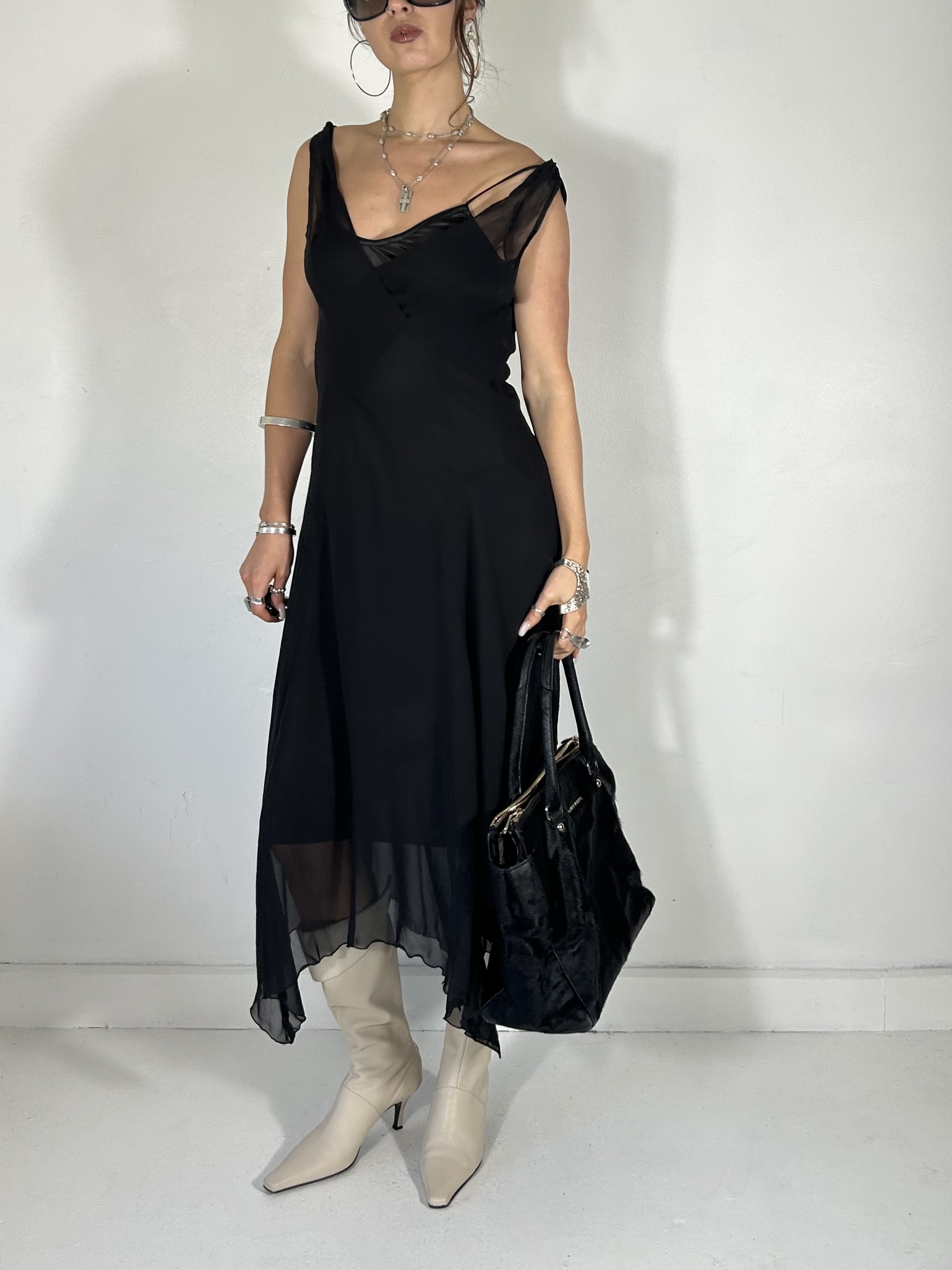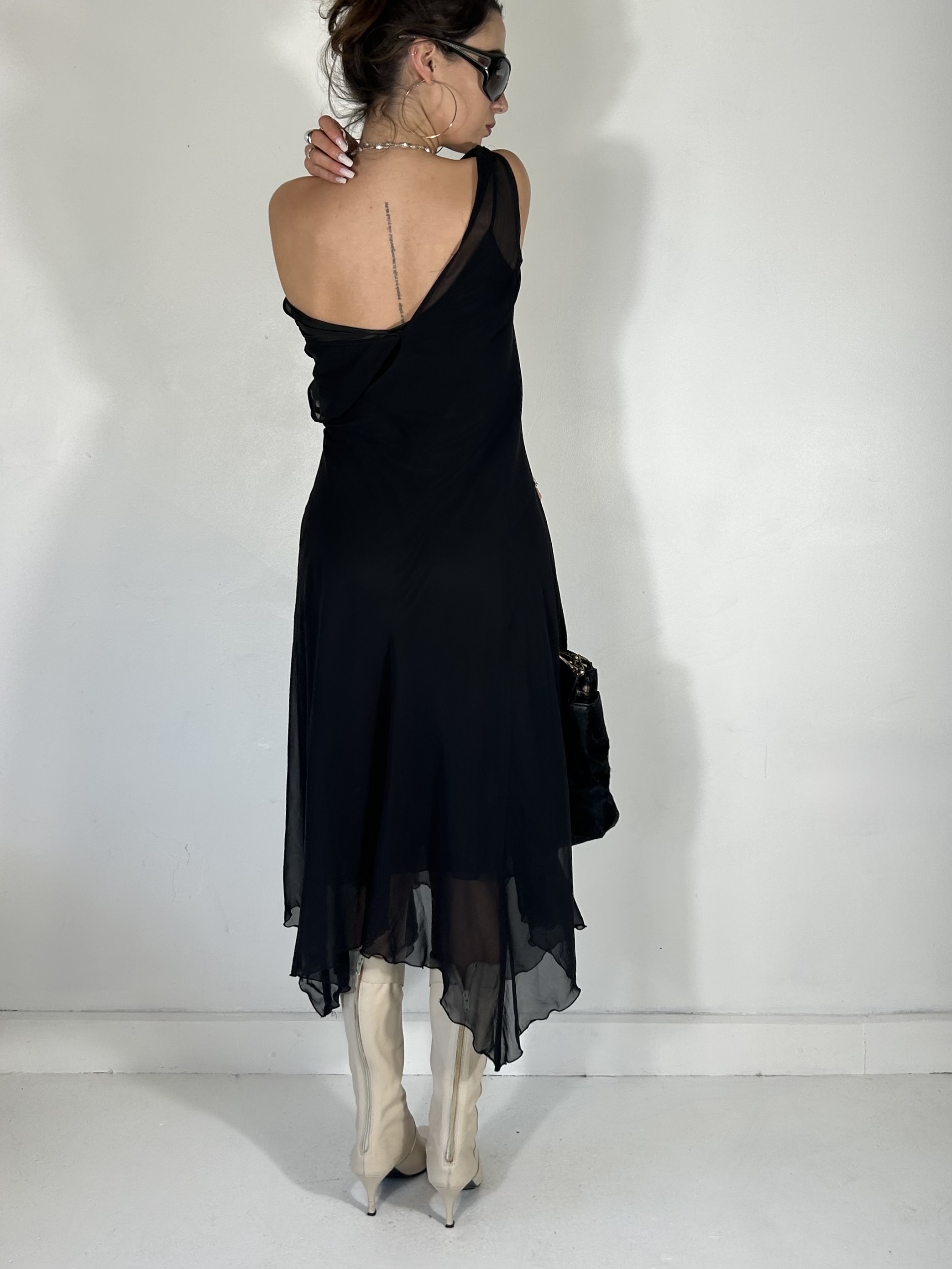 Black chiffon double layer asymmetrical maxi dress