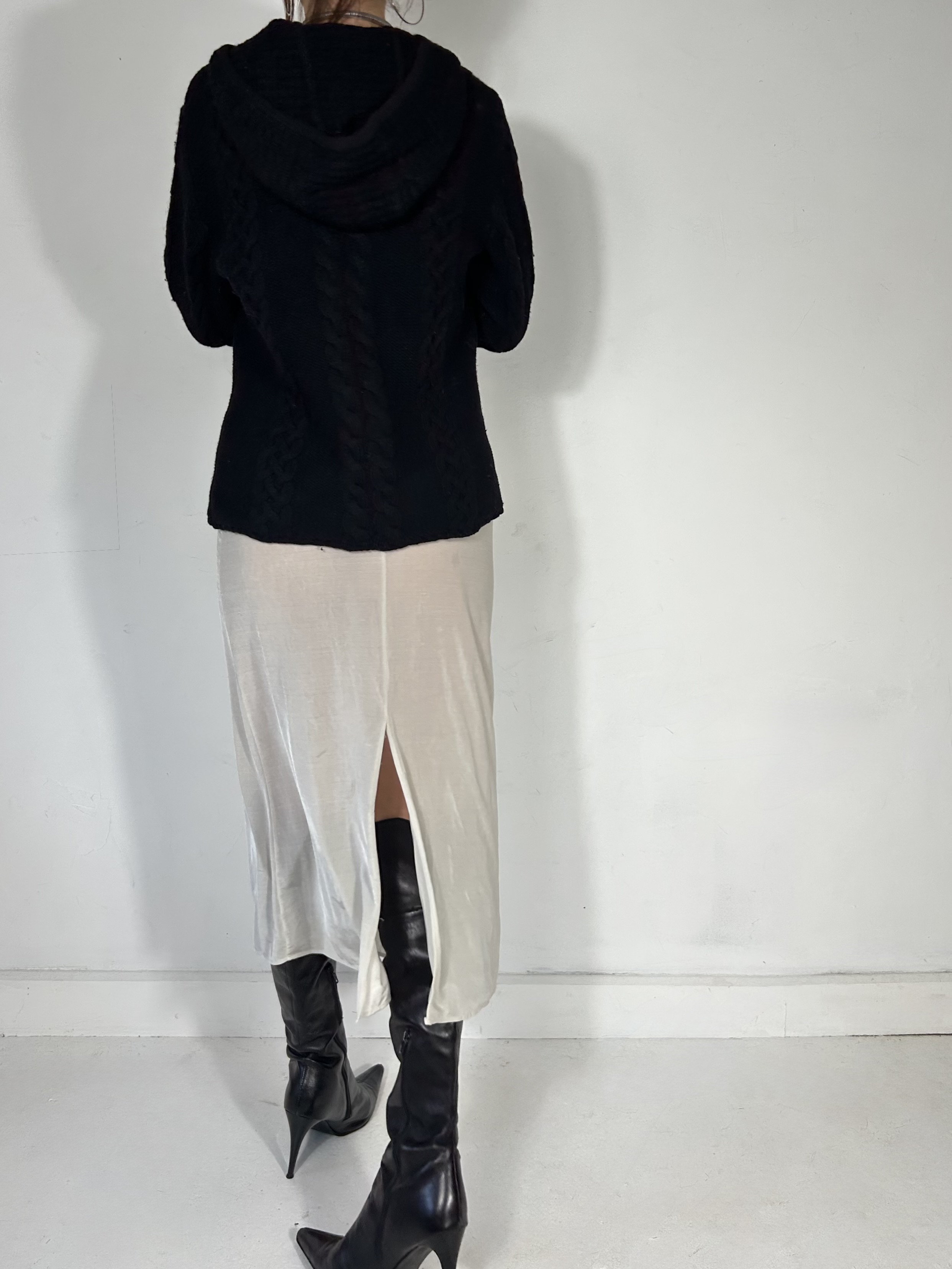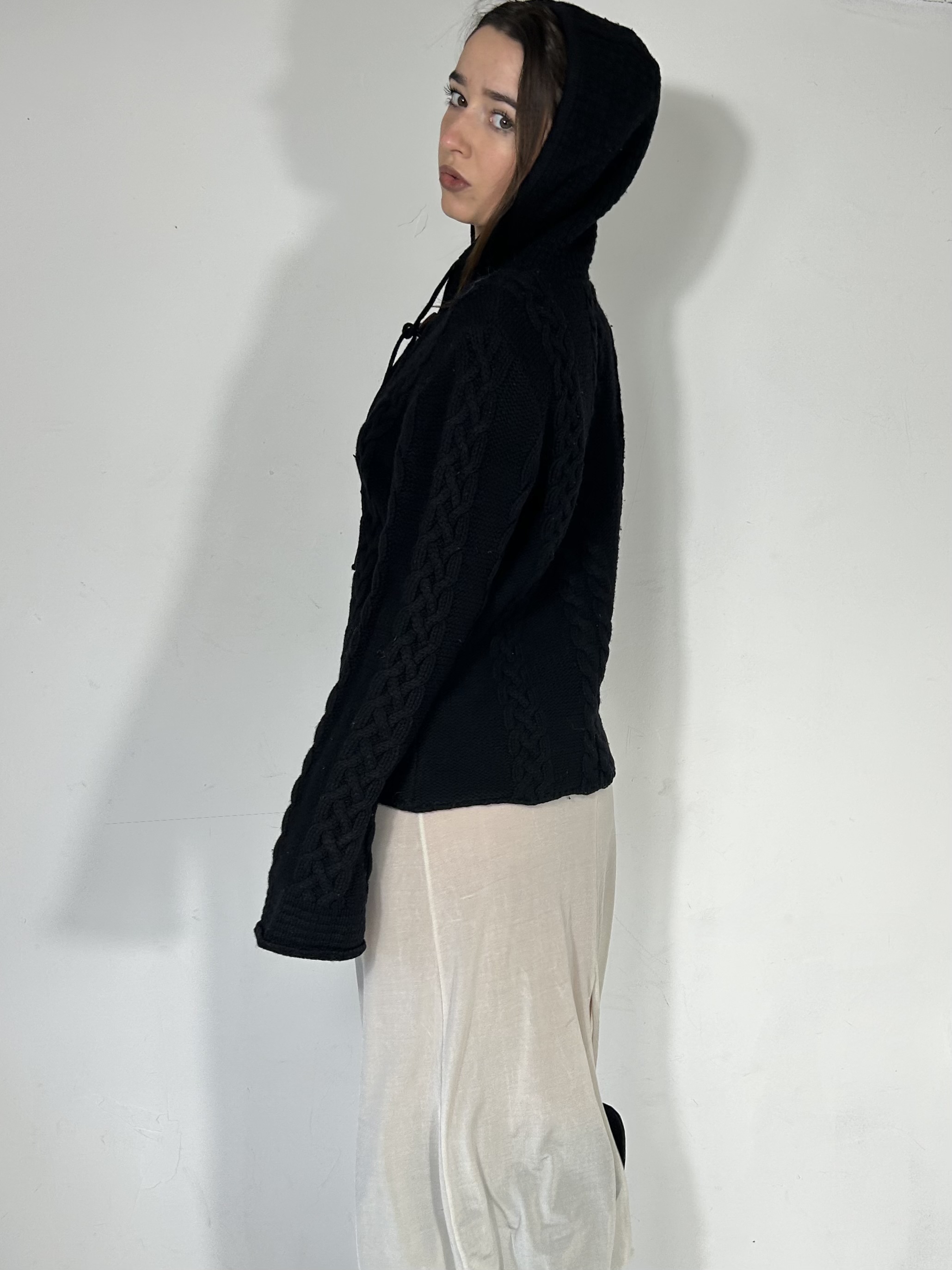 Black cable knit hooded jumper with toggle clasps