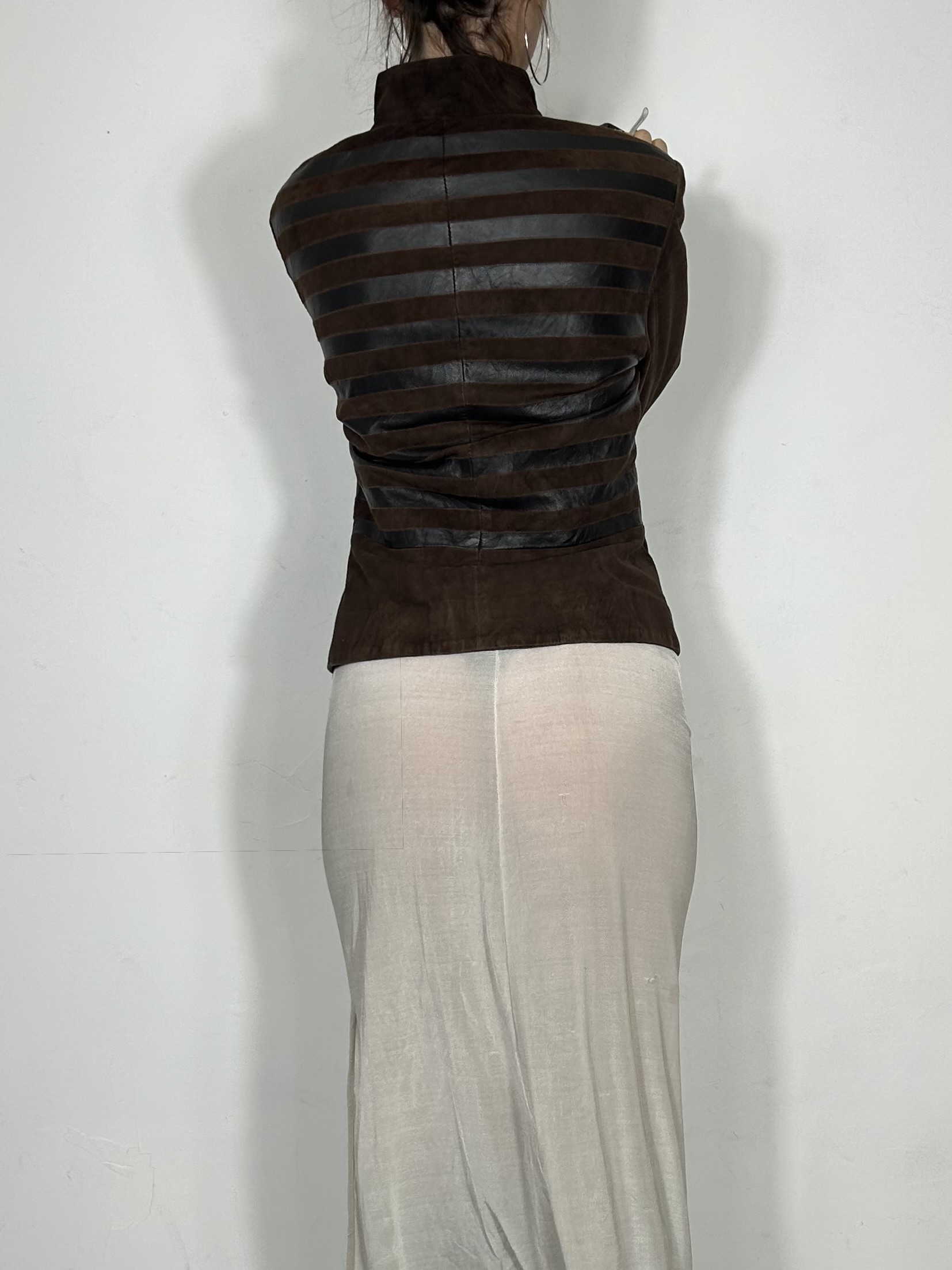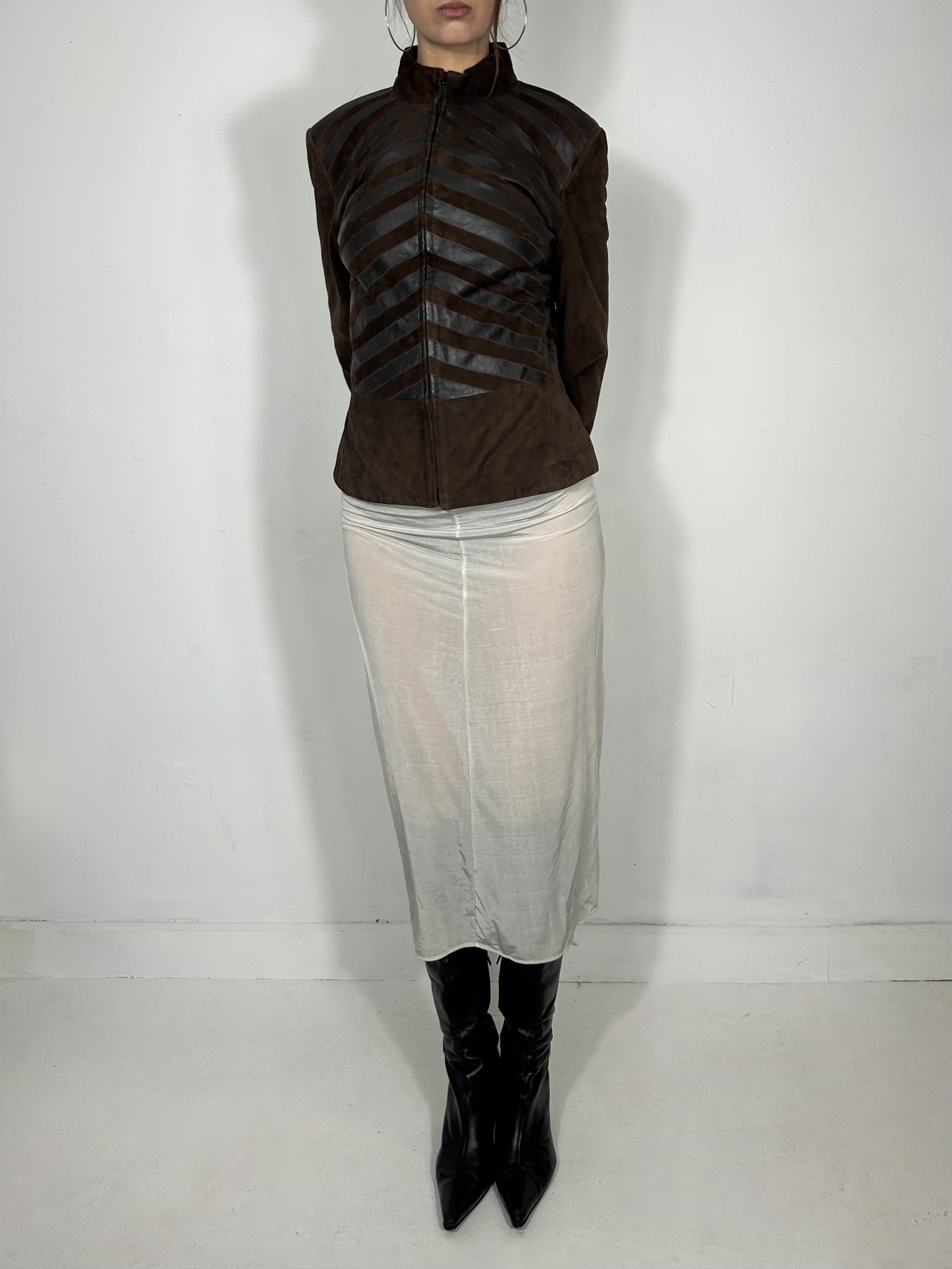 Brown suede zip up jacket with leather stripe detailing