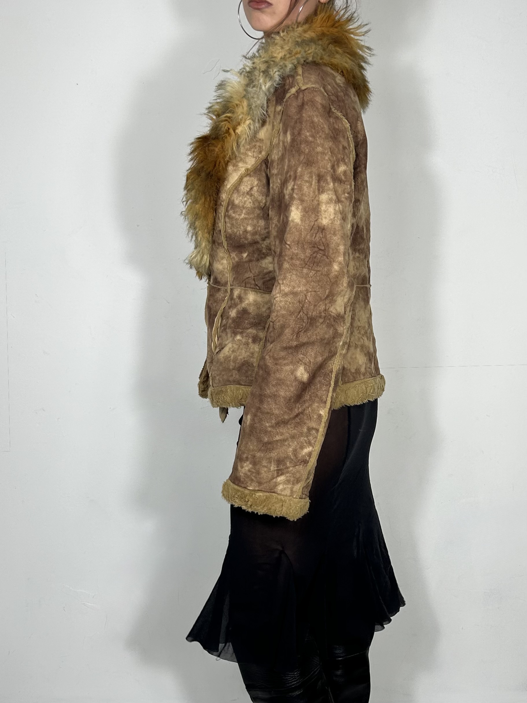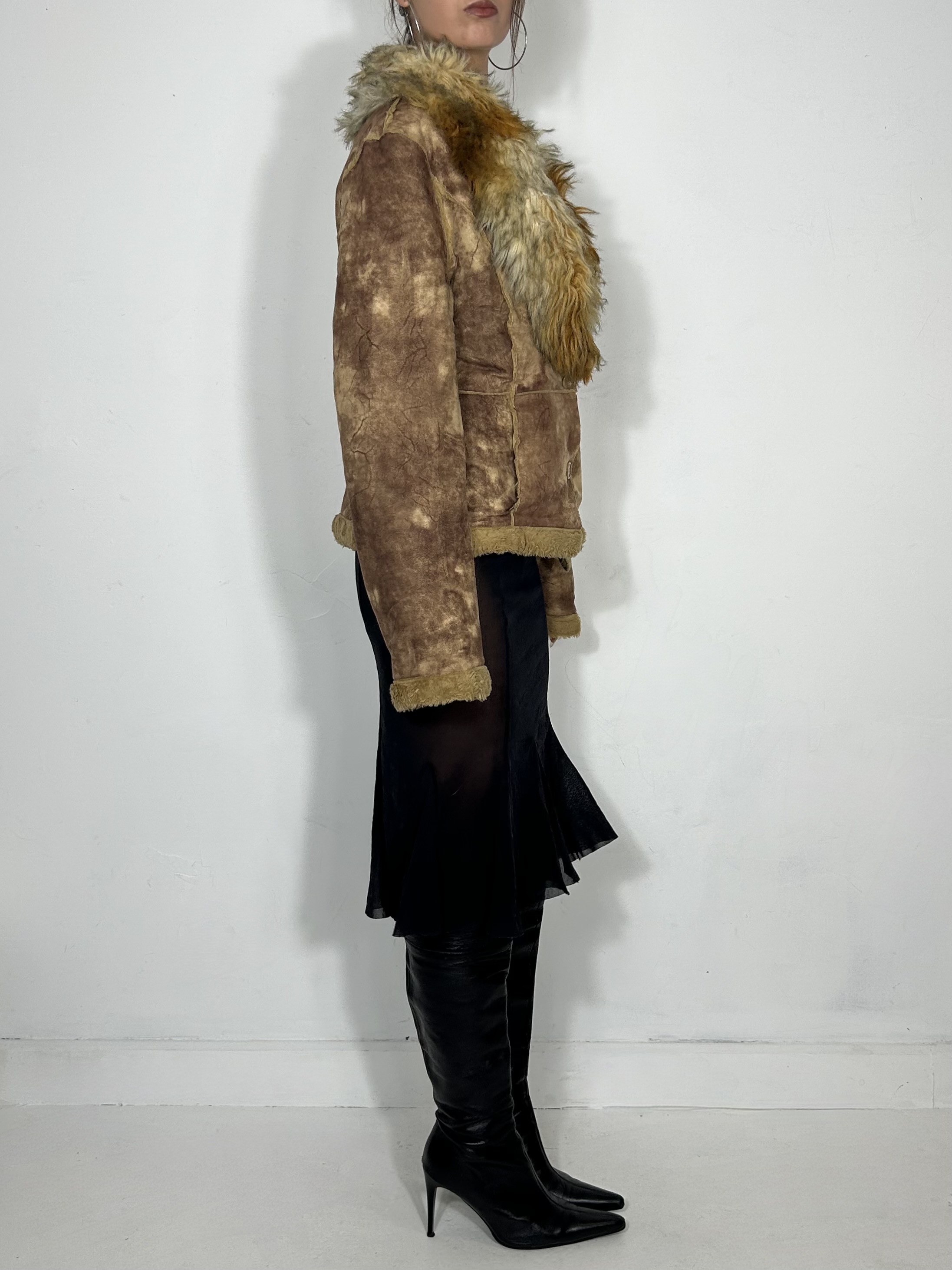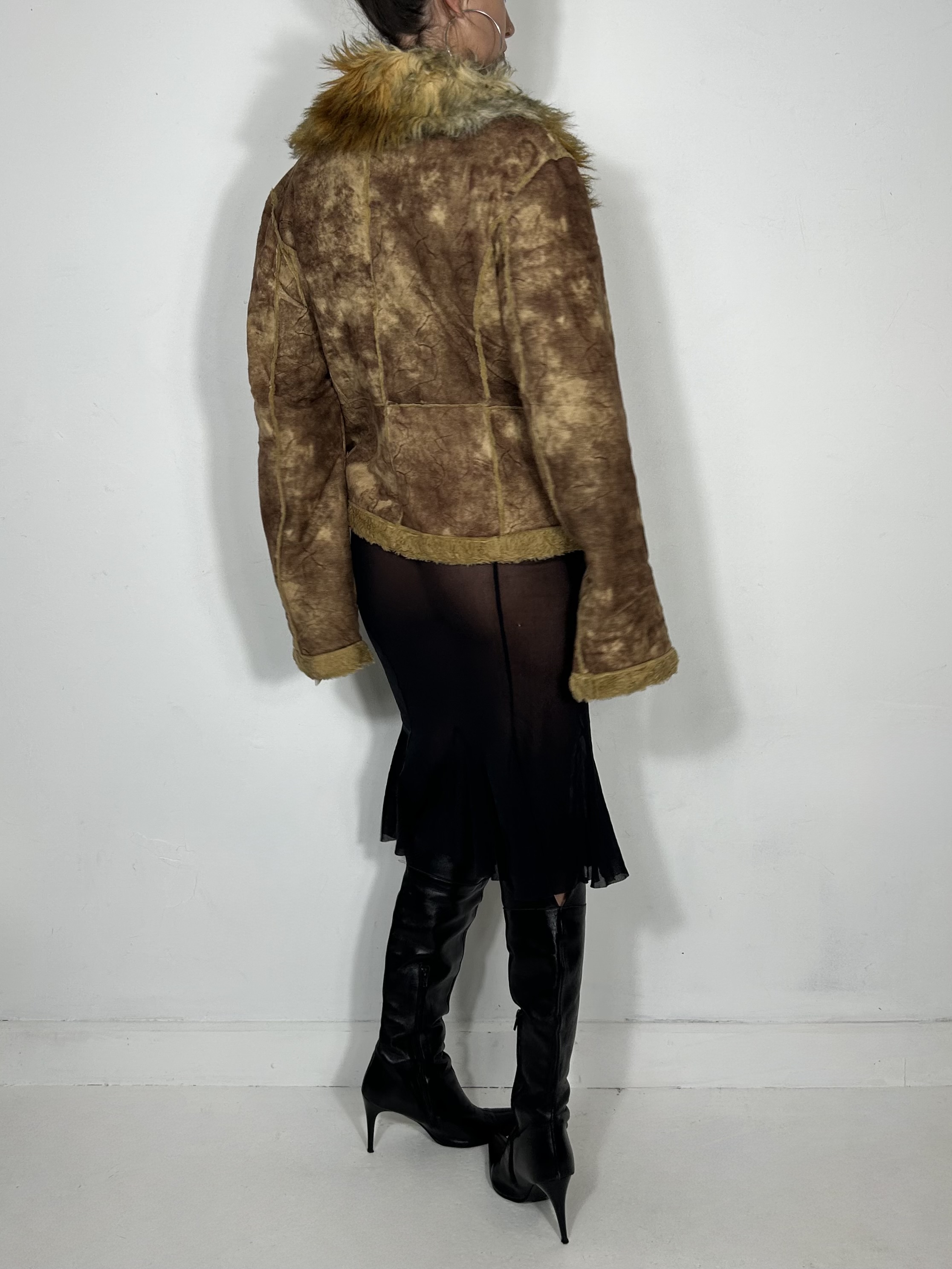 Tan organic tone faux fur cropped jacket with suede panels and fur trim