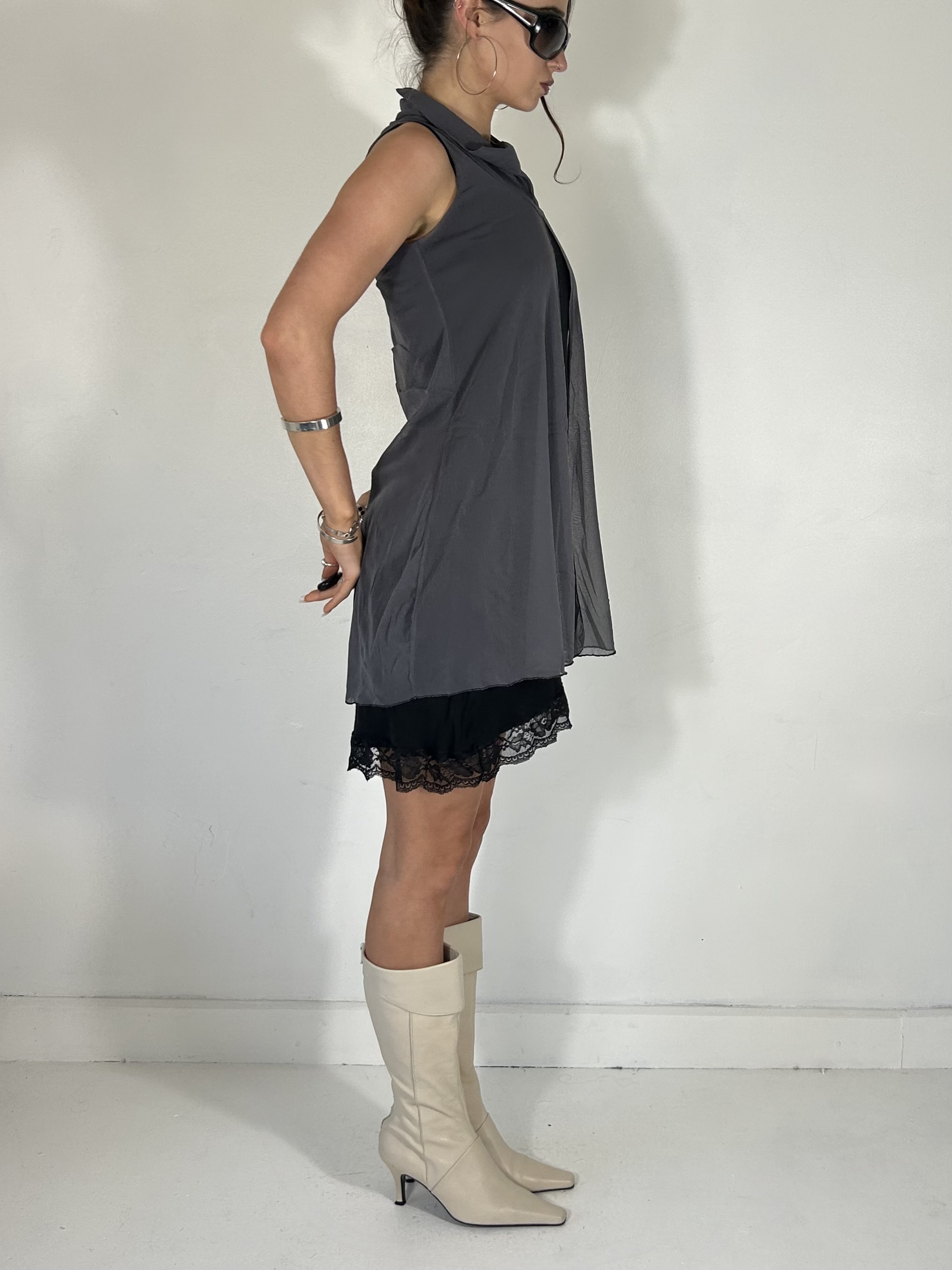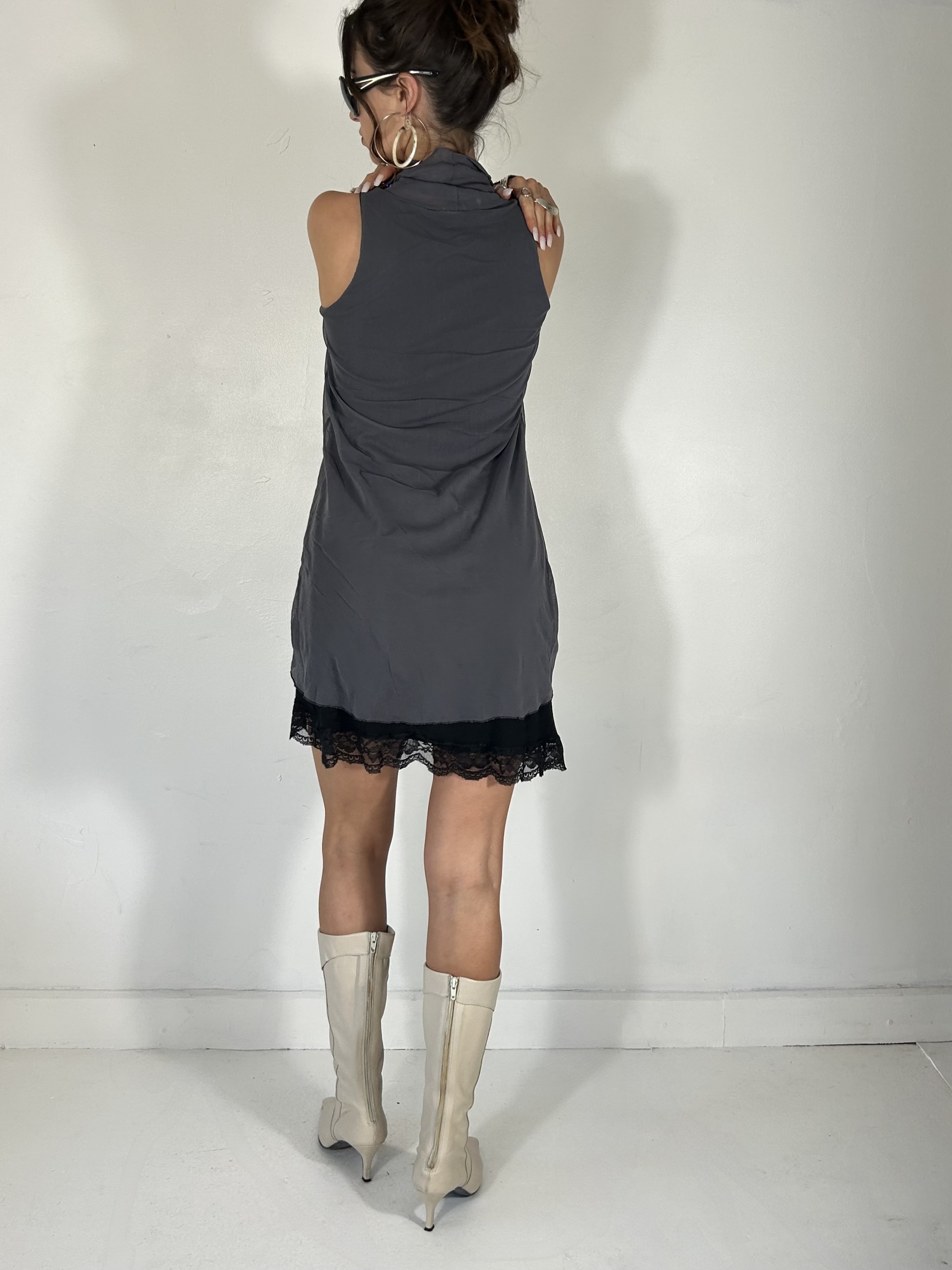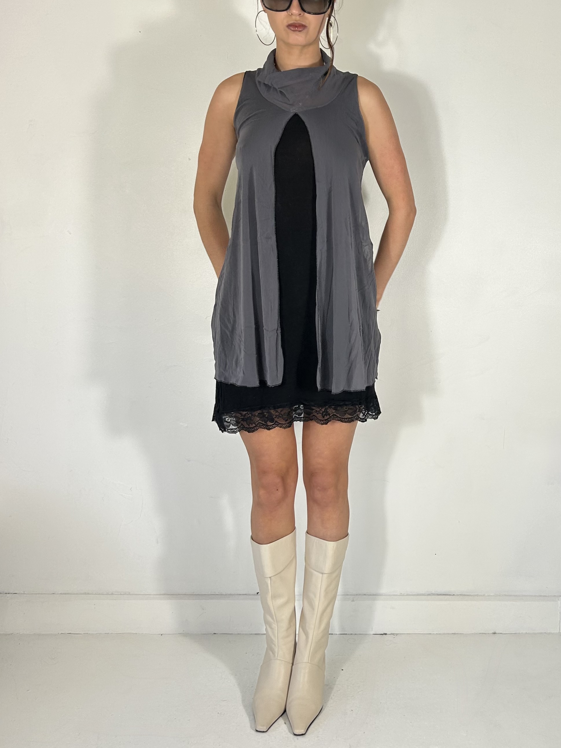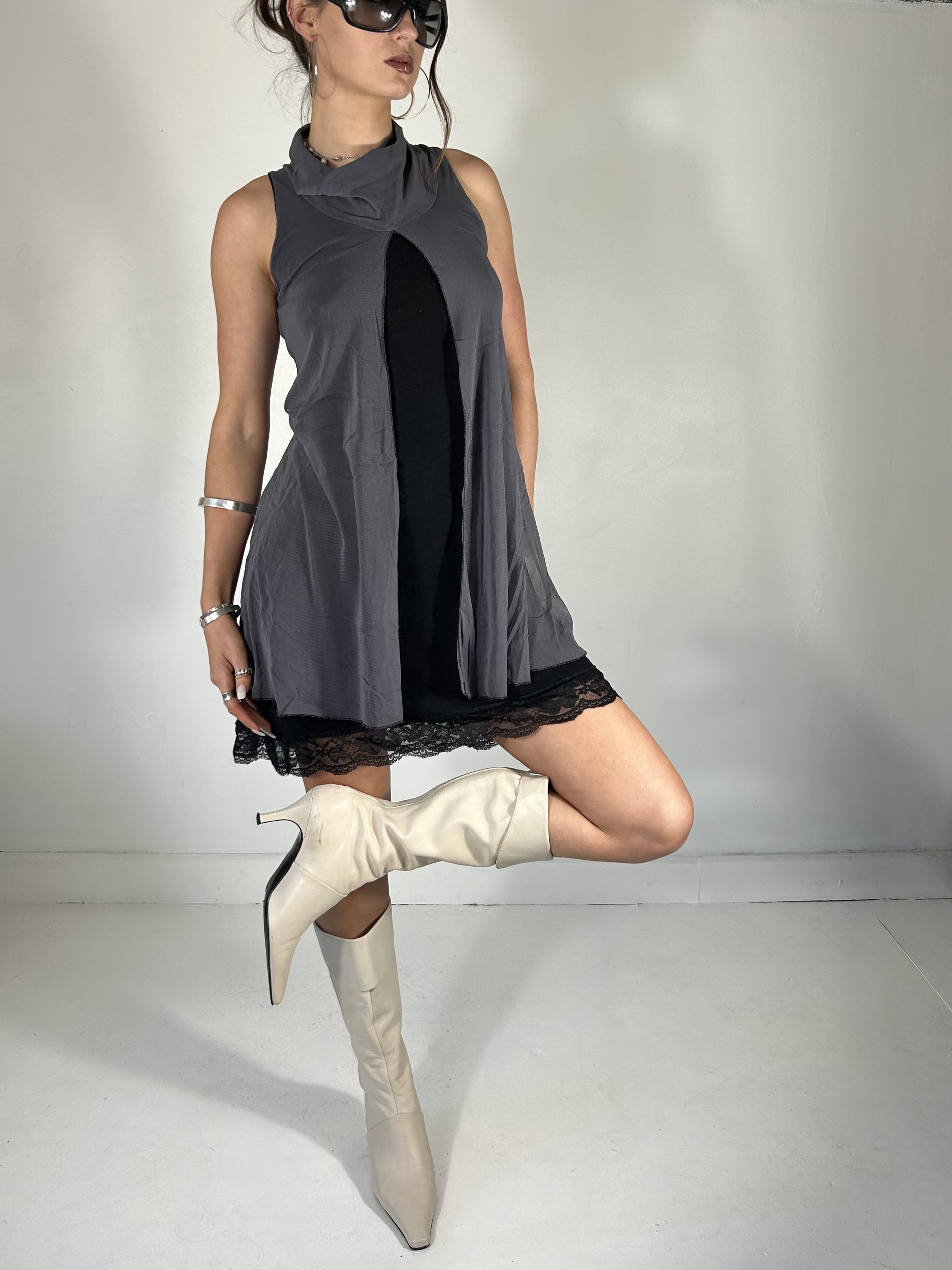 Charcoal and black mesh mini dress with layered cape detailing