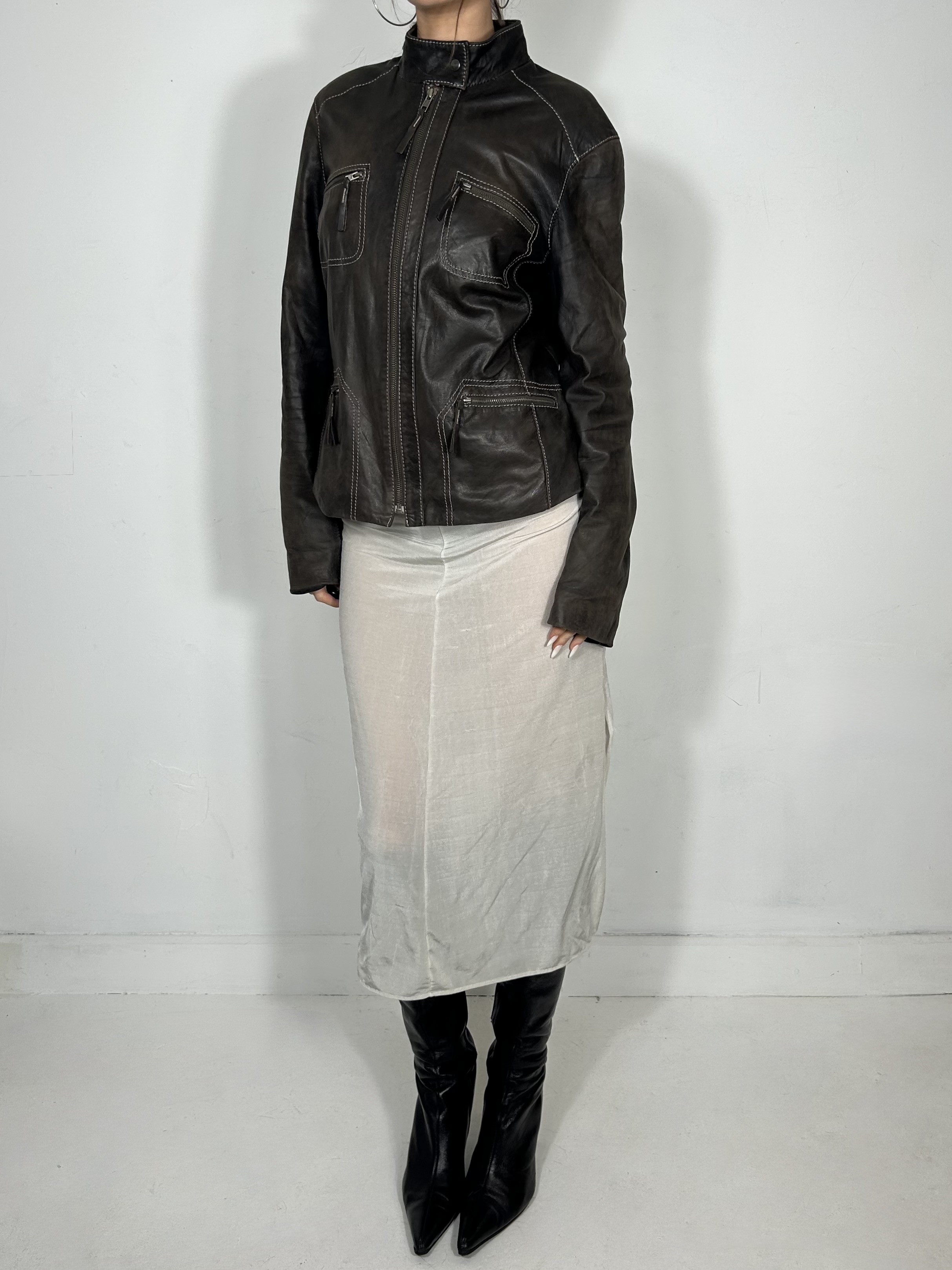 Brown leather high neck zip jacket with utility pocket detailing