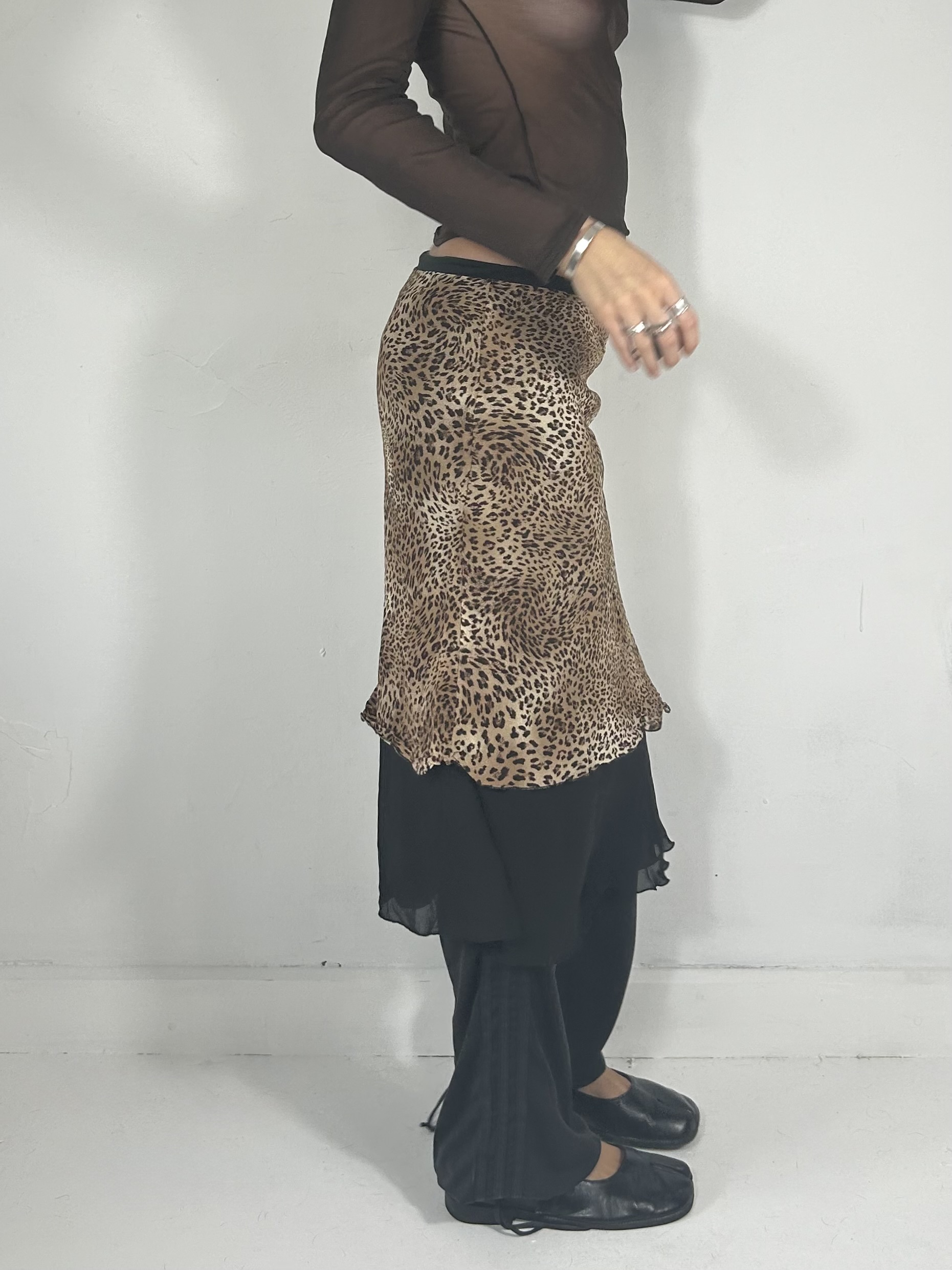 Dual layer animal print midi skirt with semi sheer chiffon hem