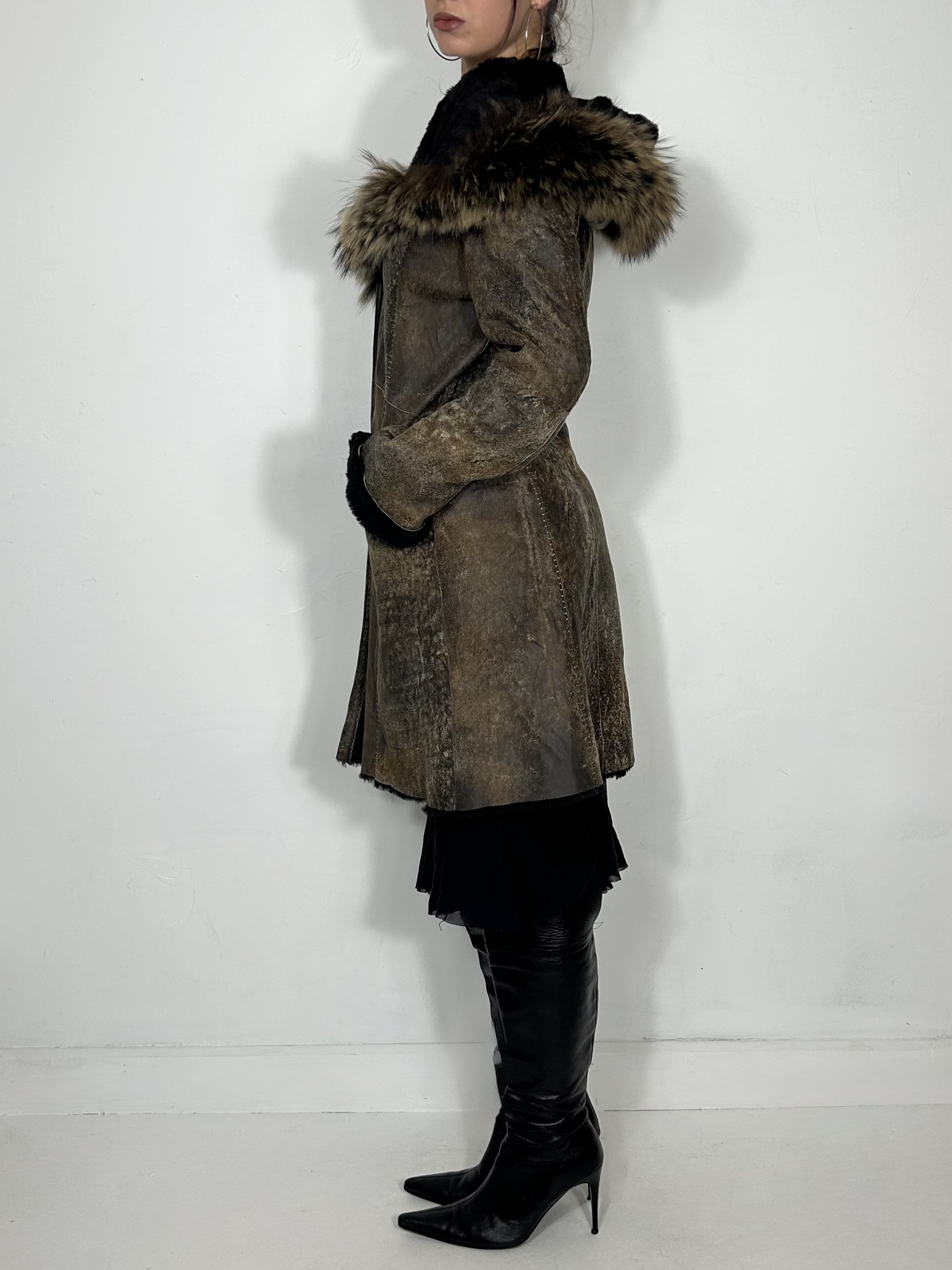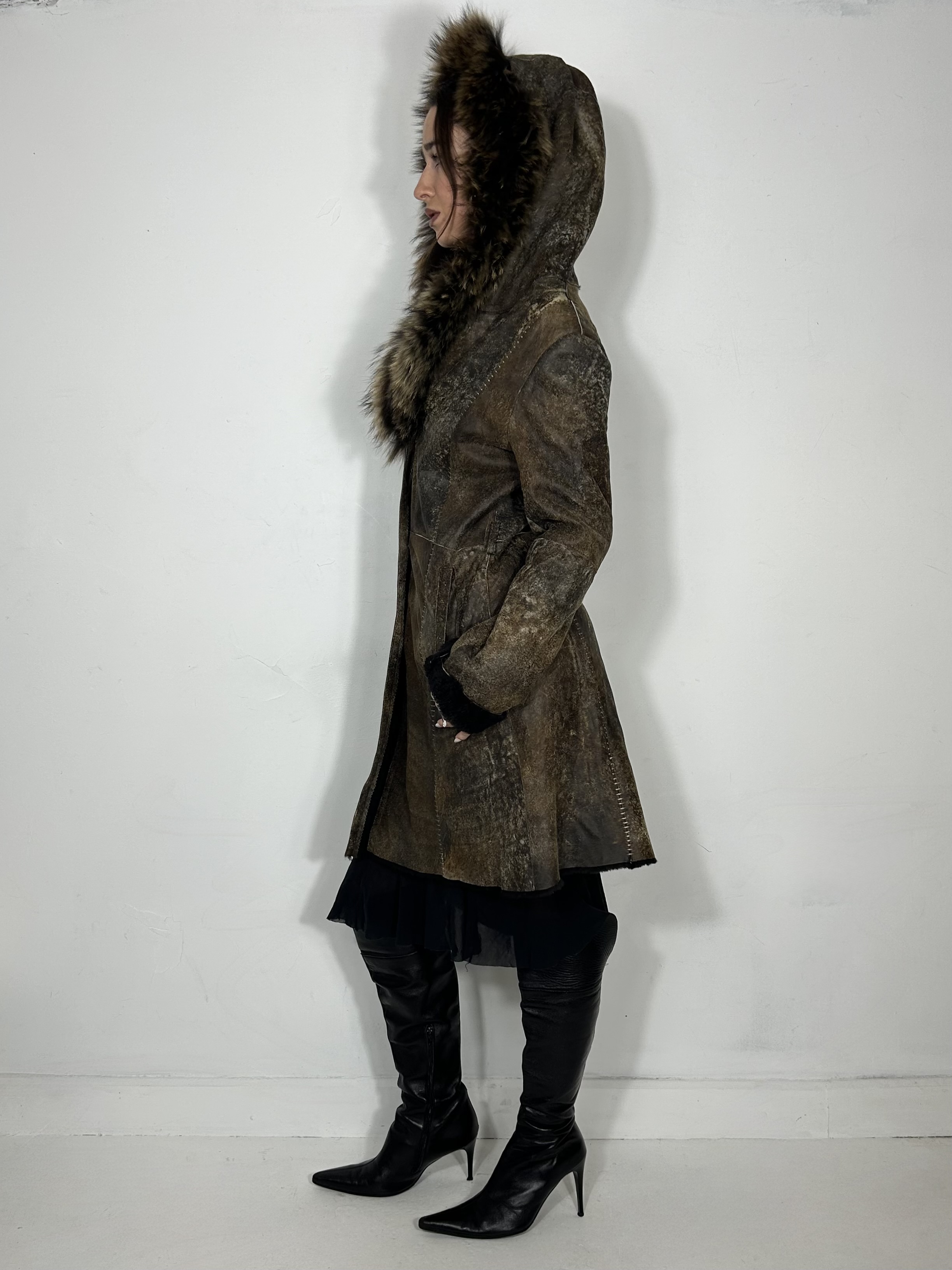Faded brown leather patchwork trench with fur trim hood and stitch detailing