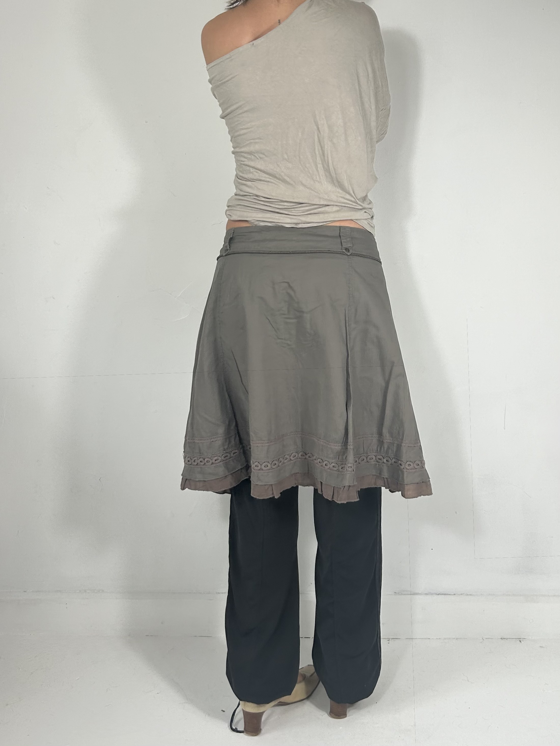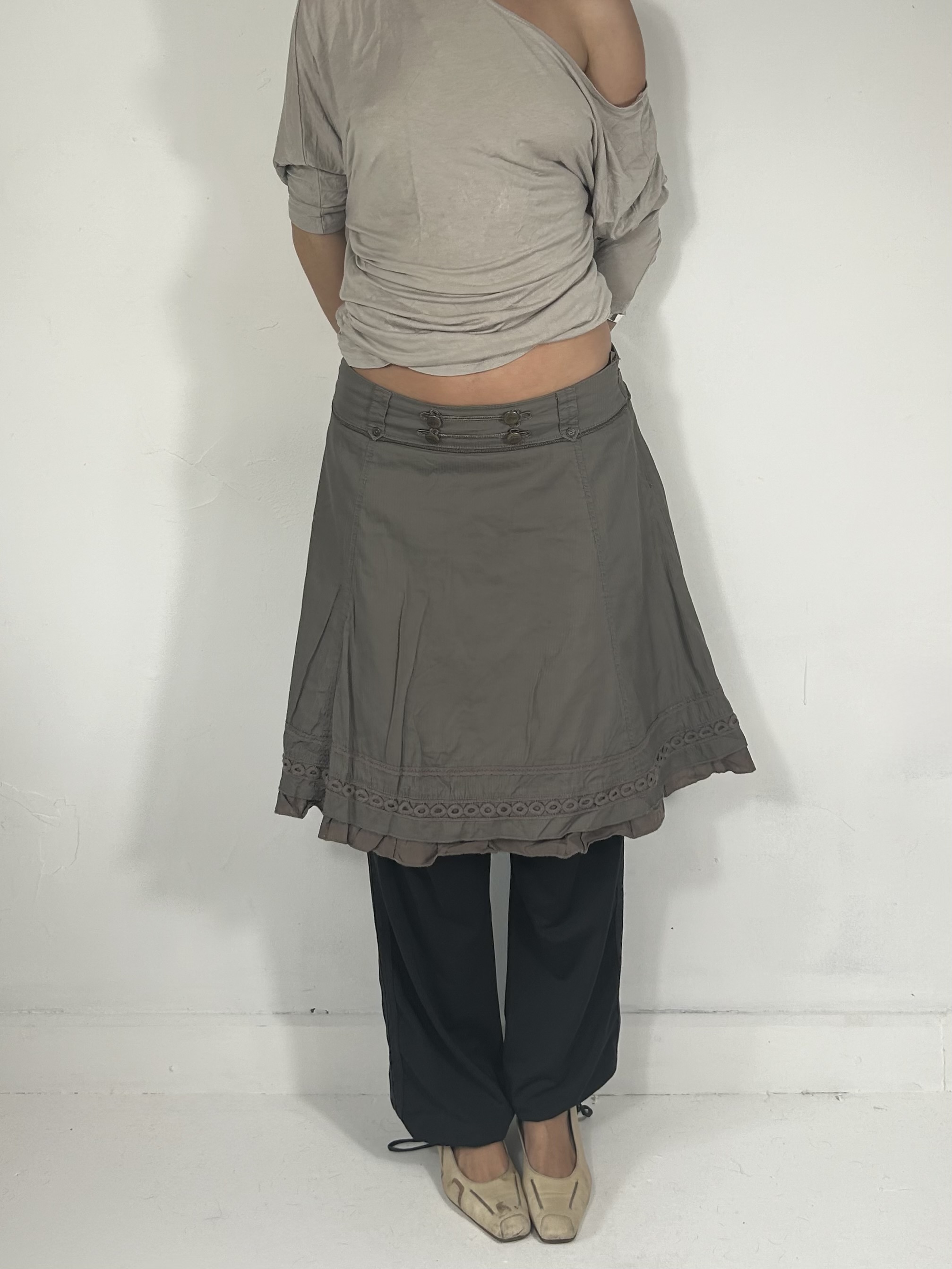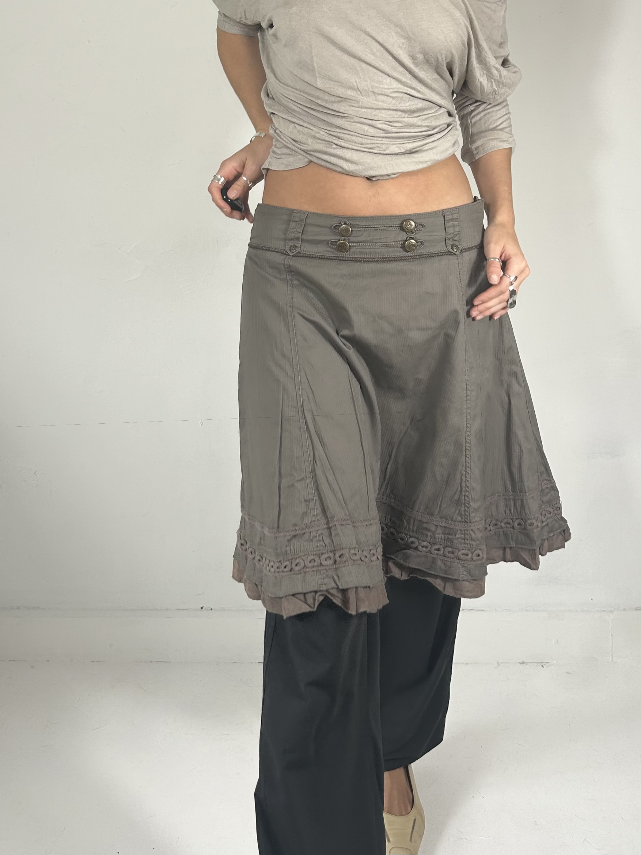 Khaki canvas midi skirt with military button detailing and ruch hem