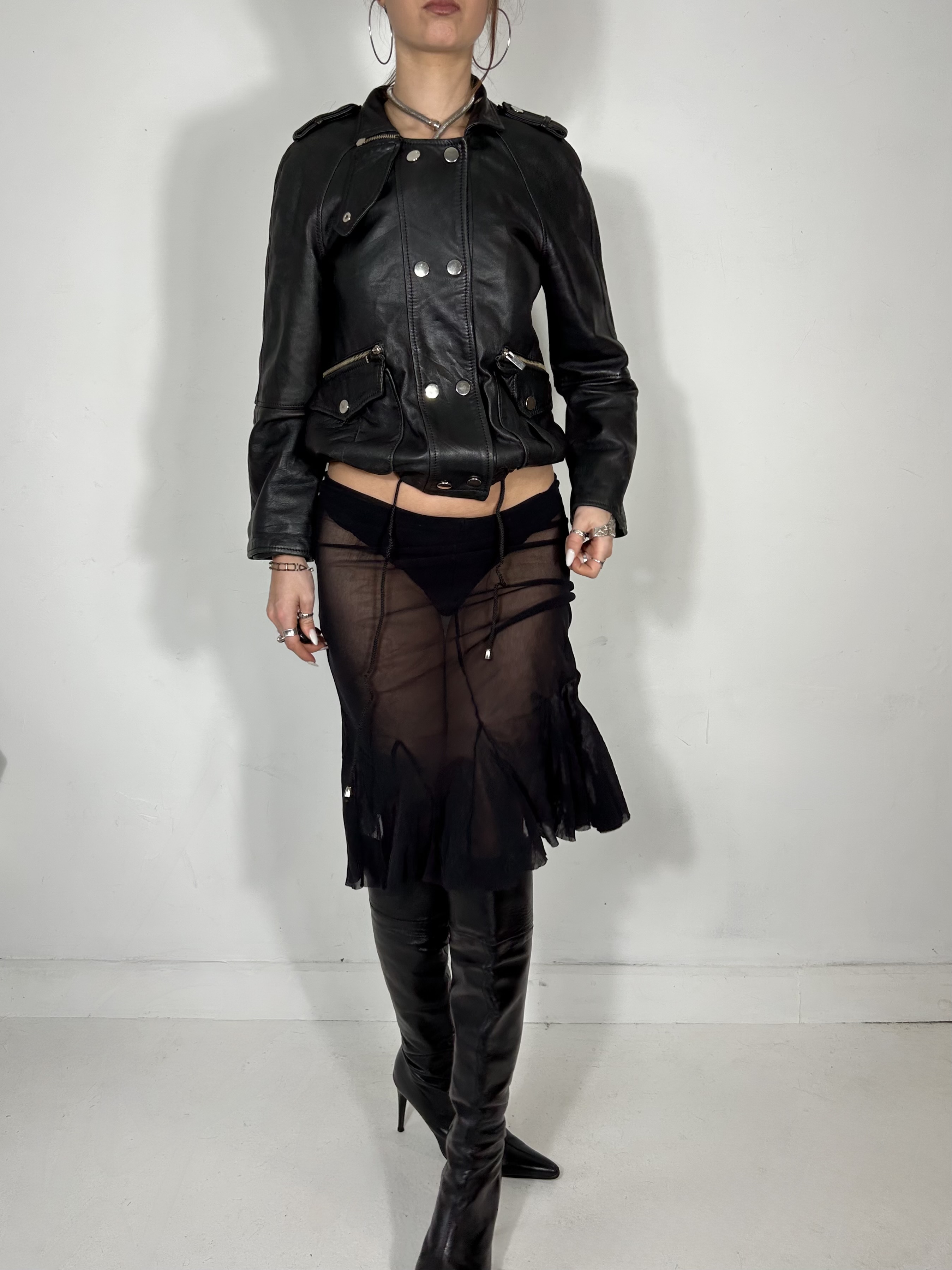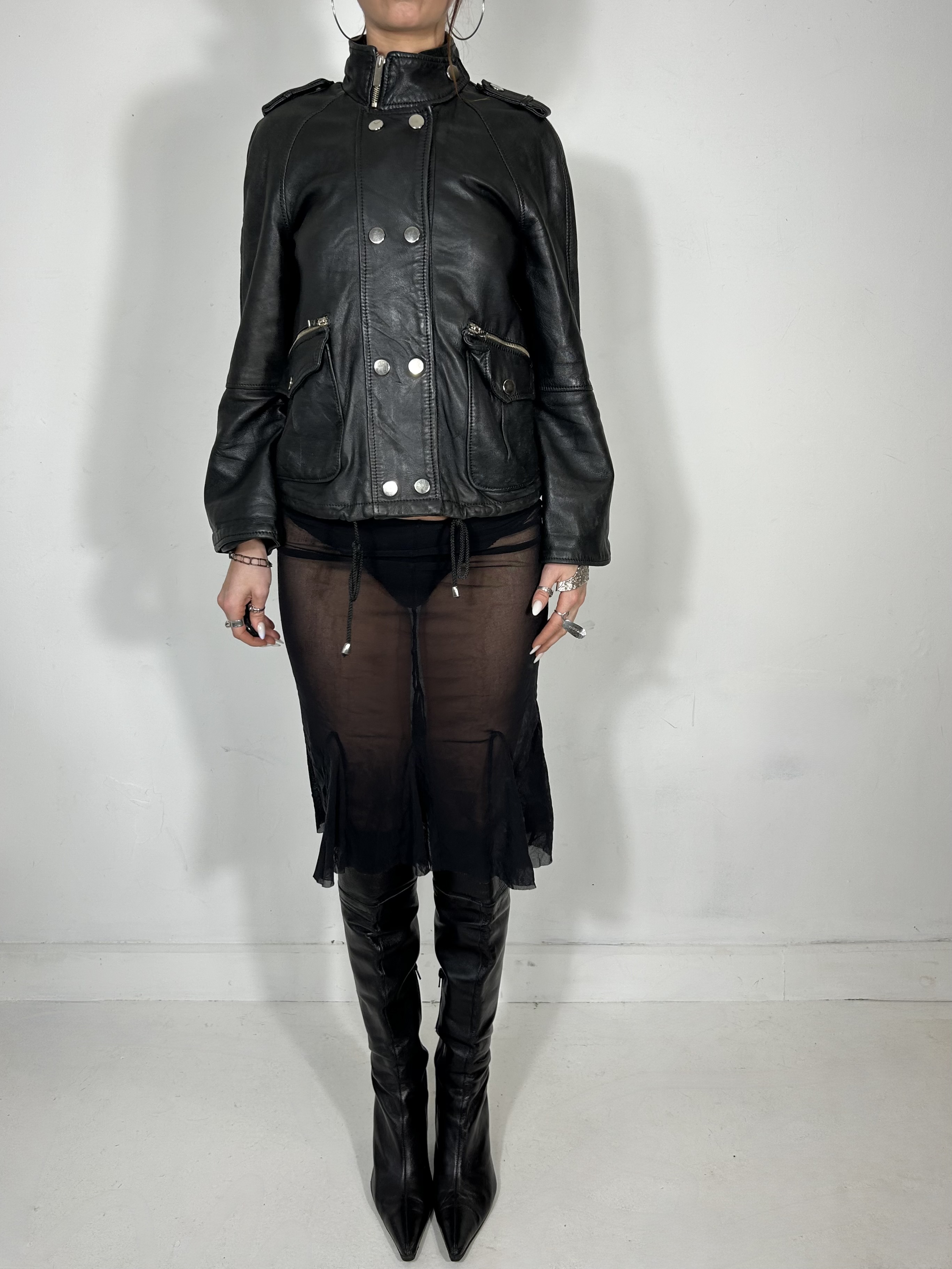 Black leather multi way adjustable jacket with silver popper detailing
