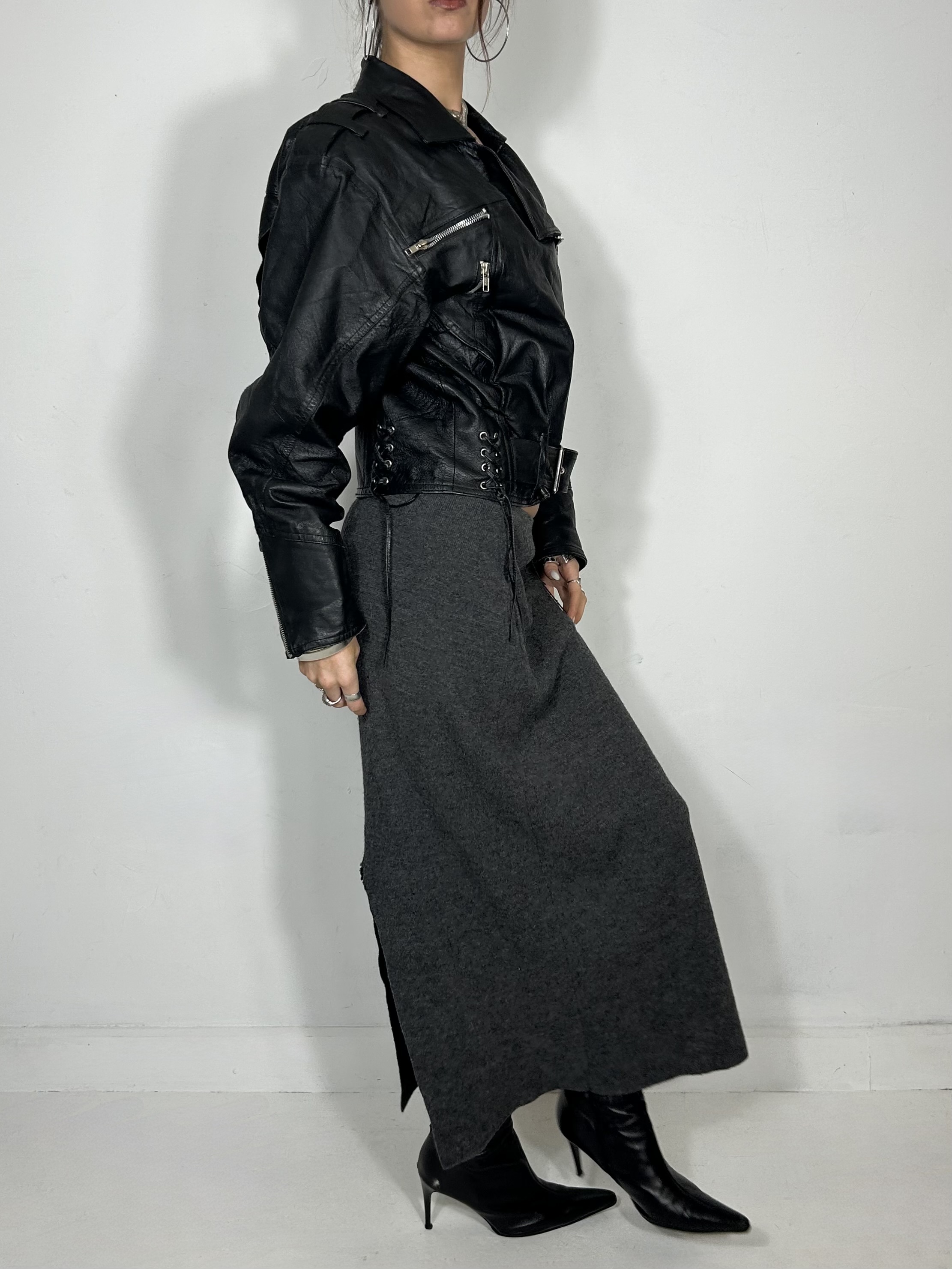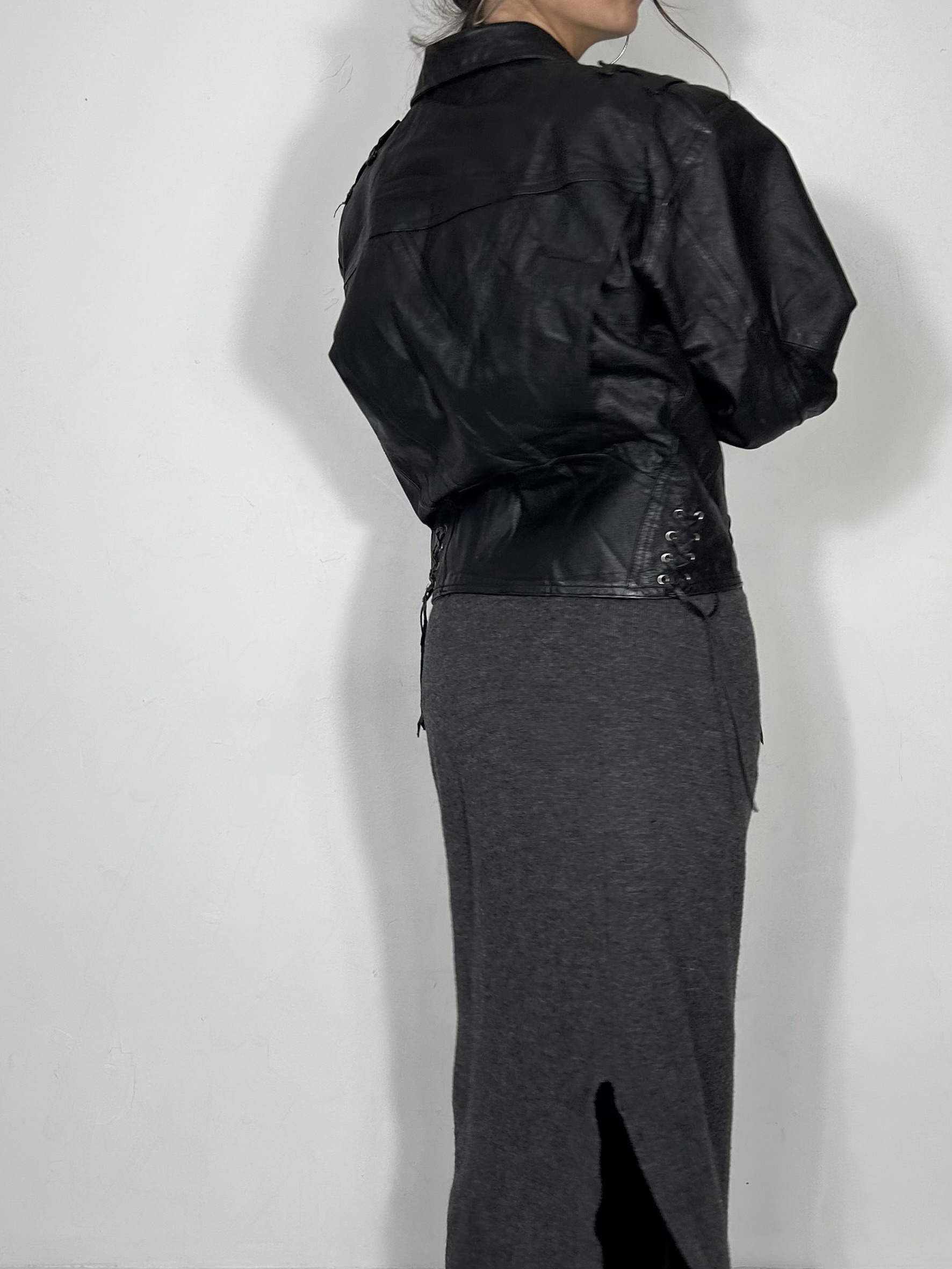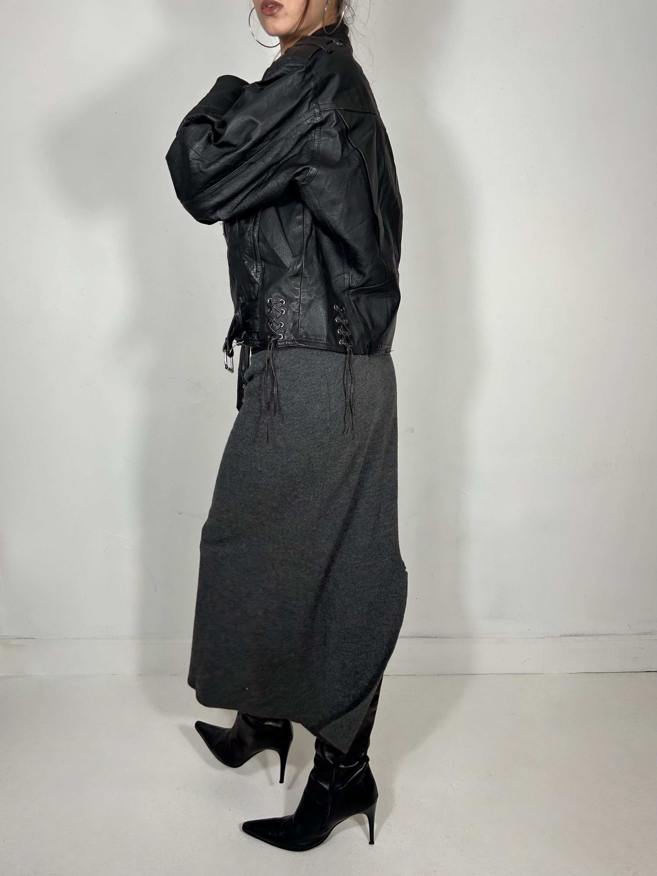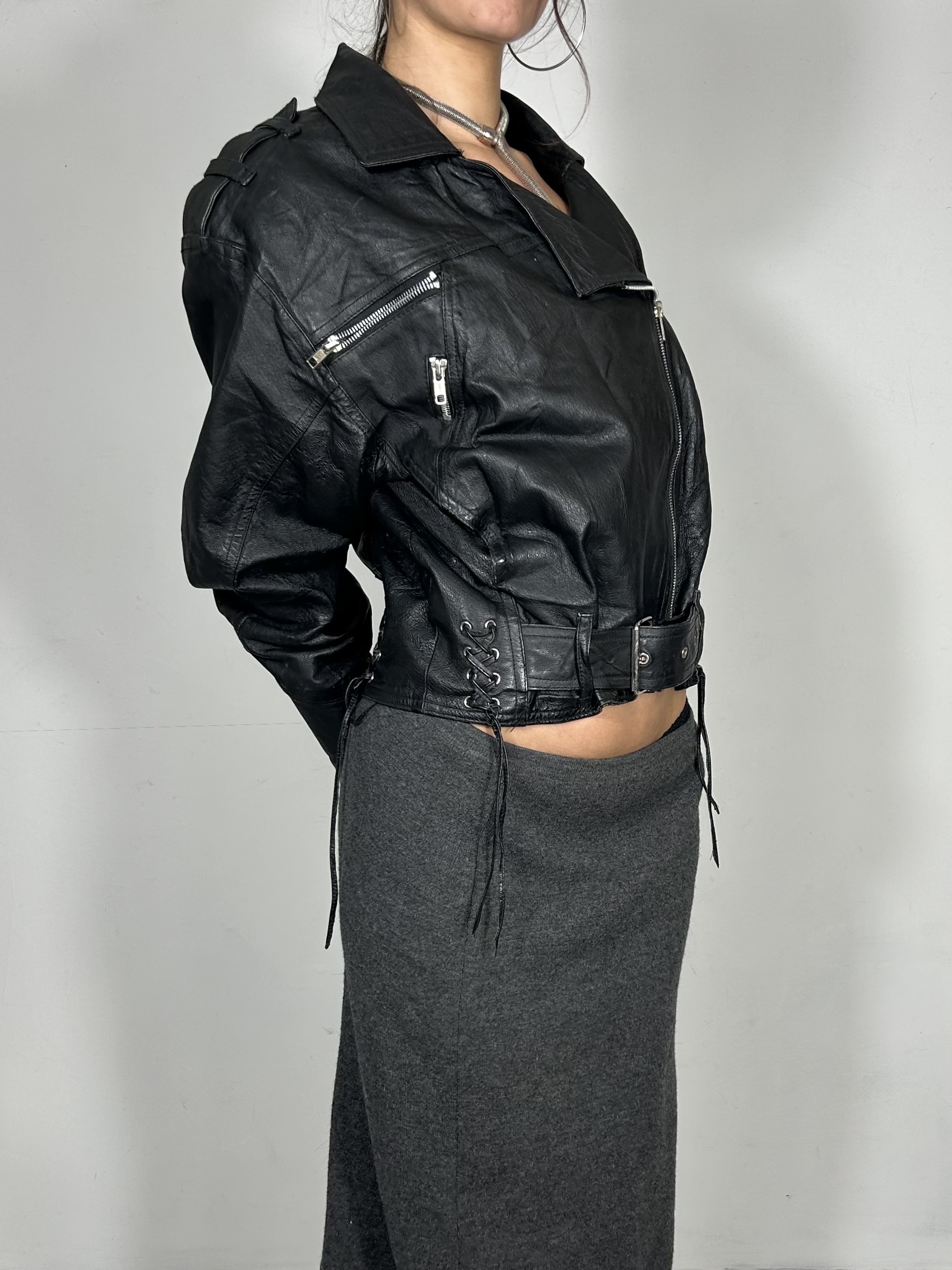 Black leather asymmetric bomber jacket with lace up corset style detailing