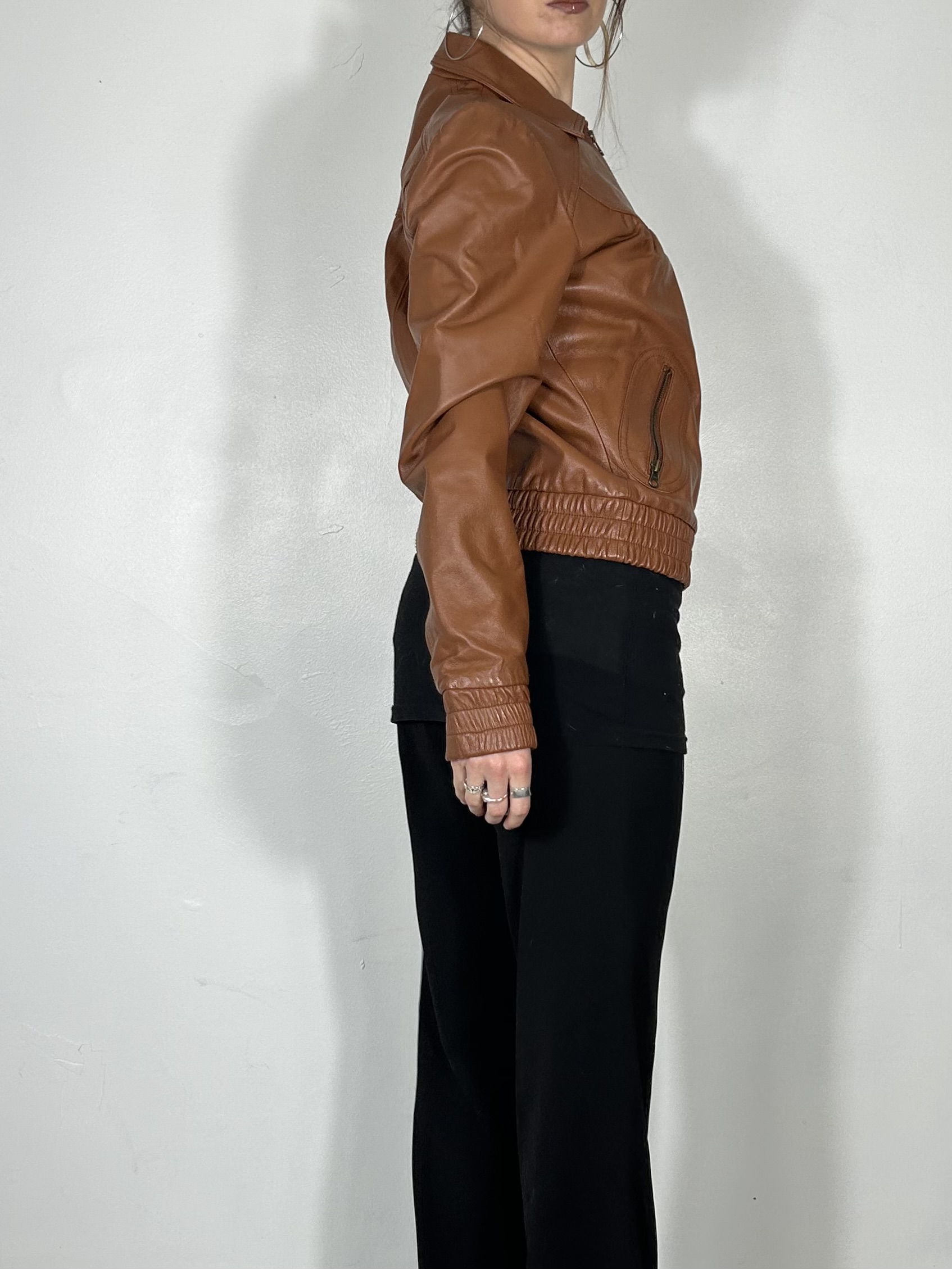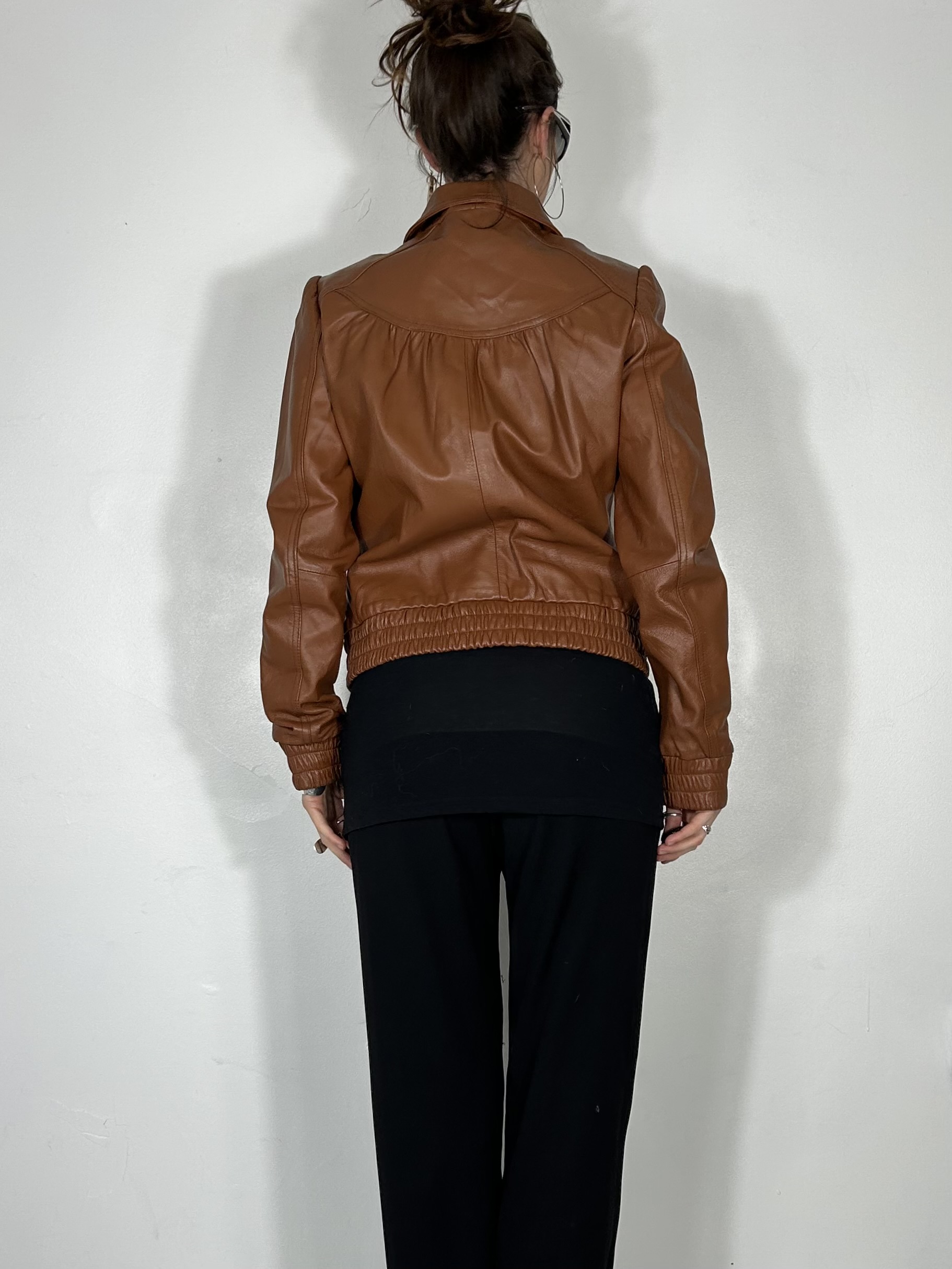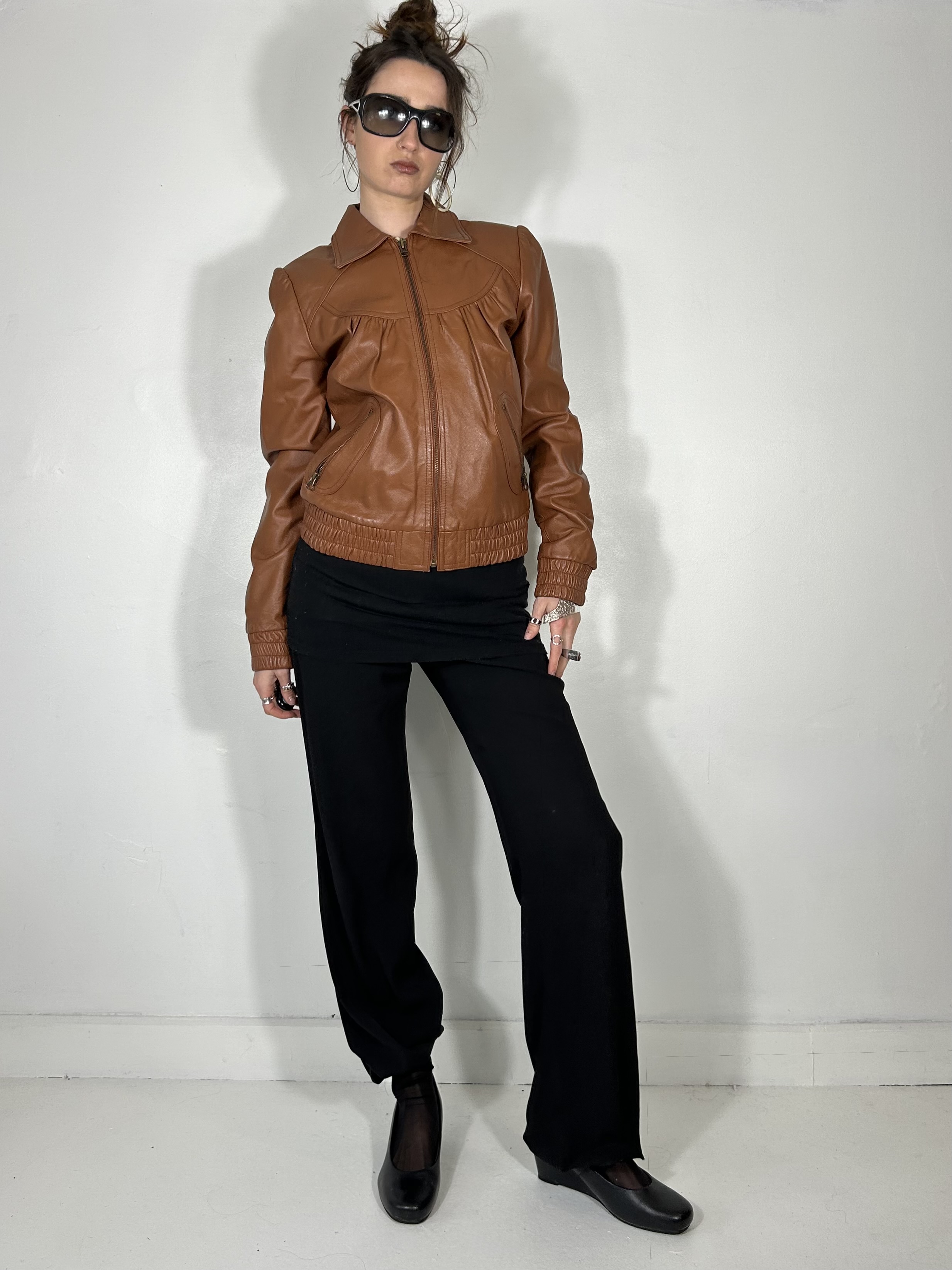 Tan genuine leather cinched jacket with ruch detailing
