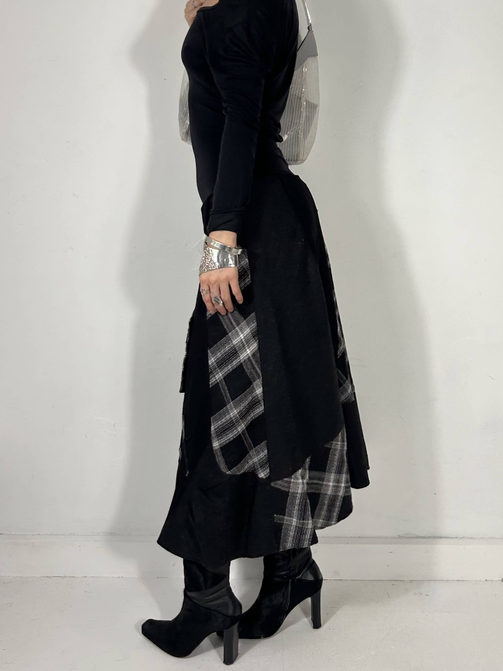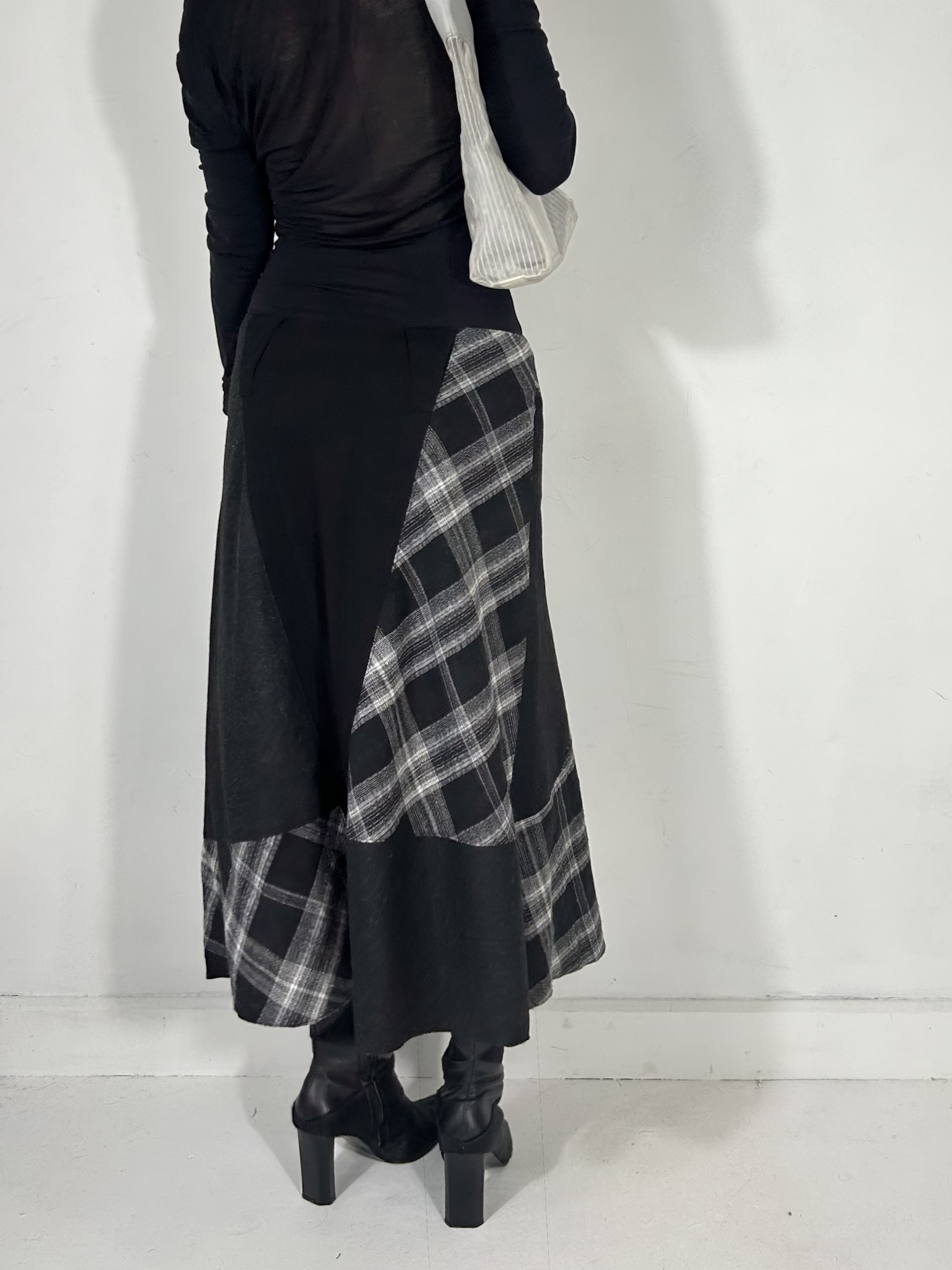 Subversive grey and black mixed texture plaid maxi skirt with appliqué detailing