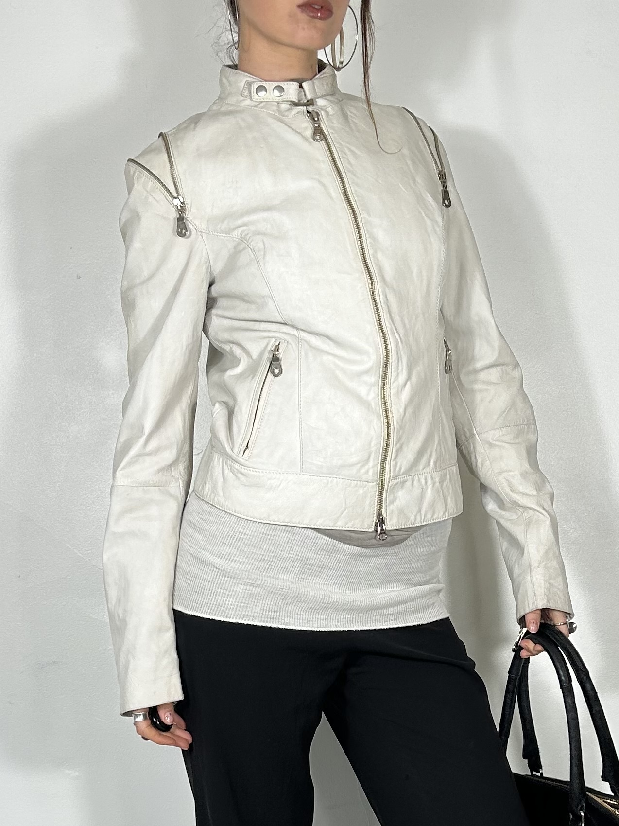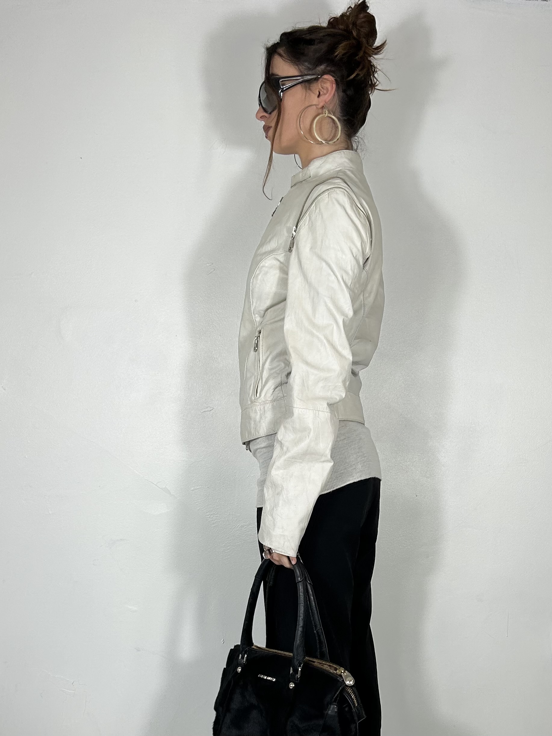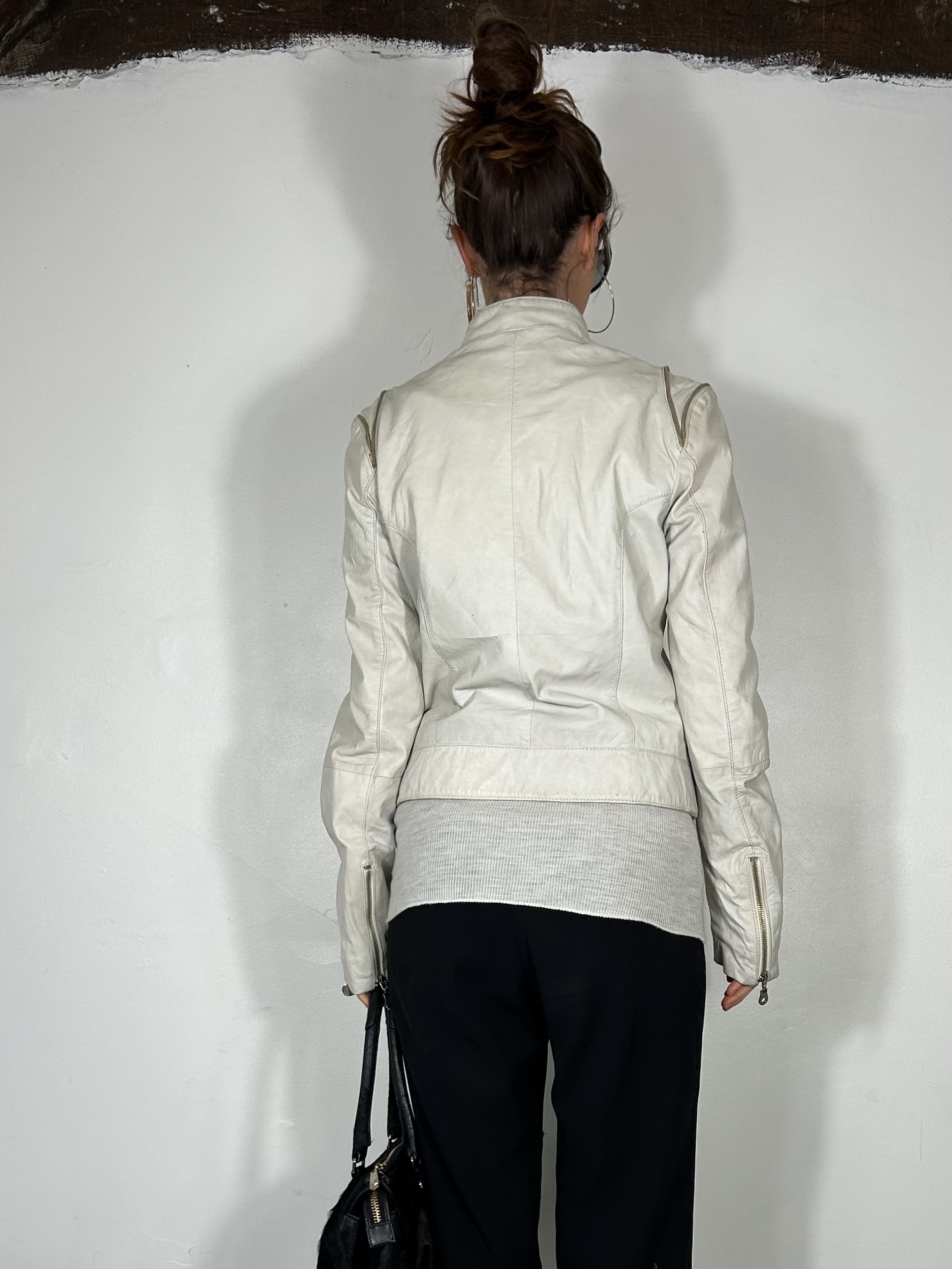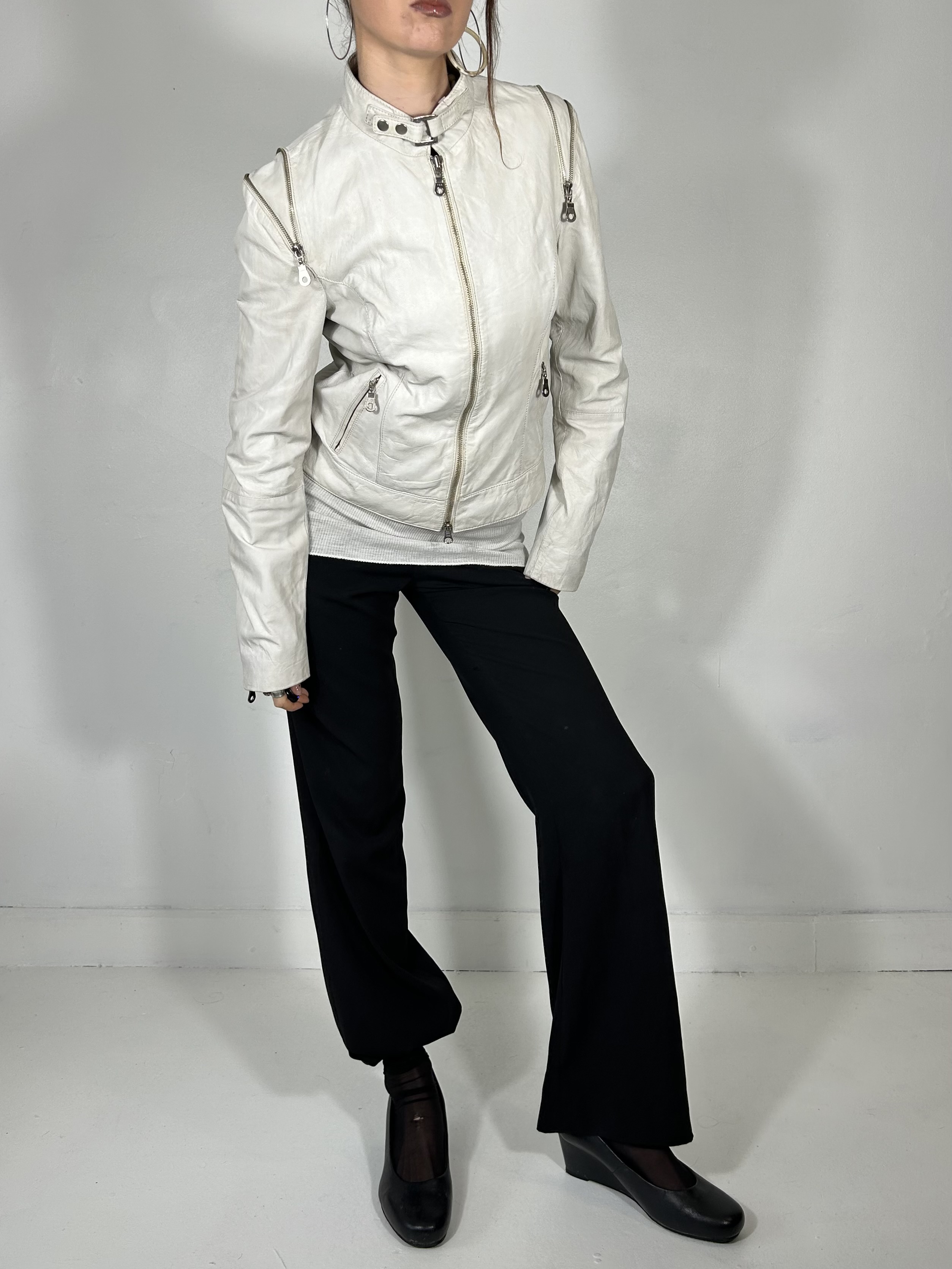 White leather biker jacket with silver zip detailing