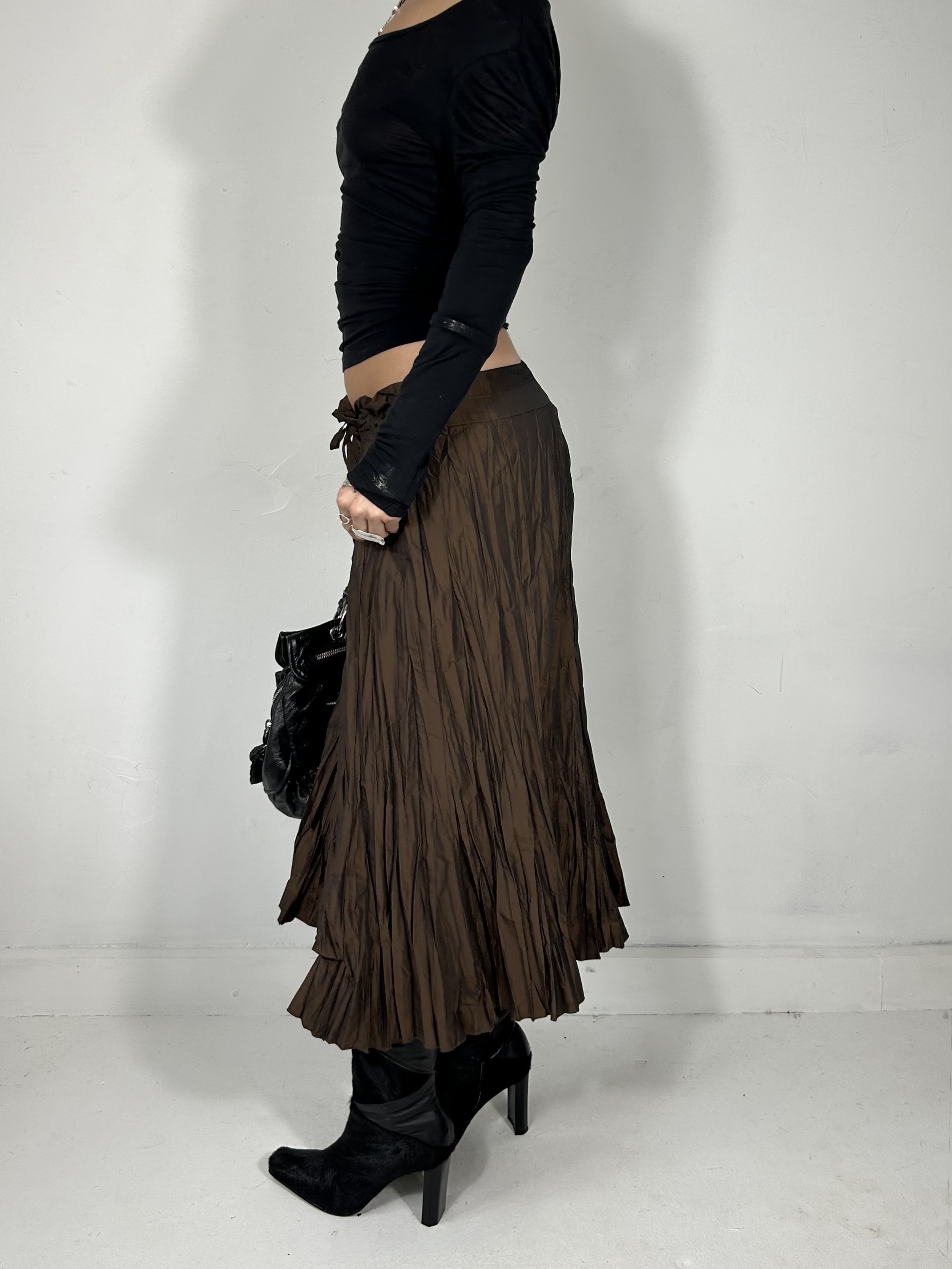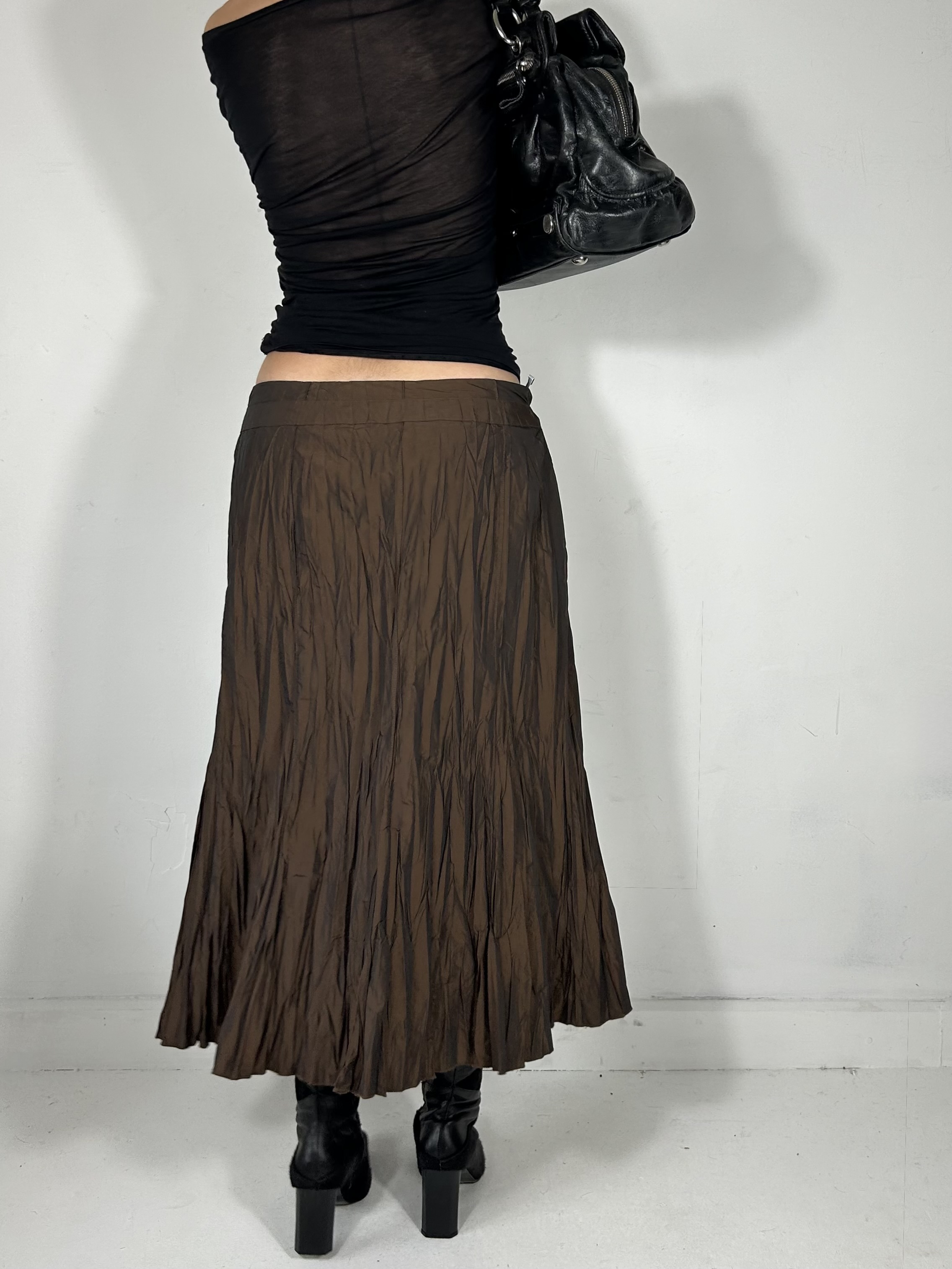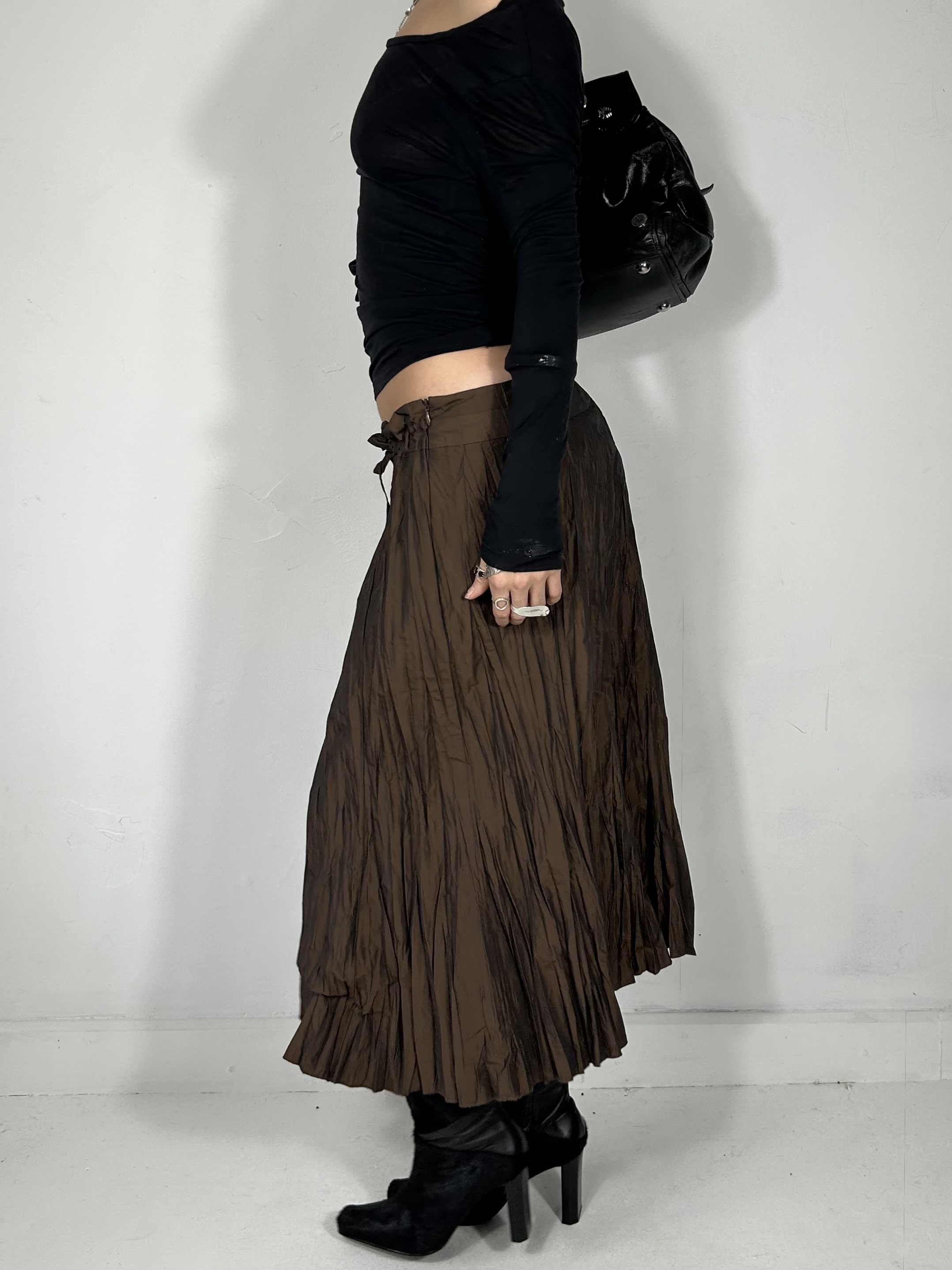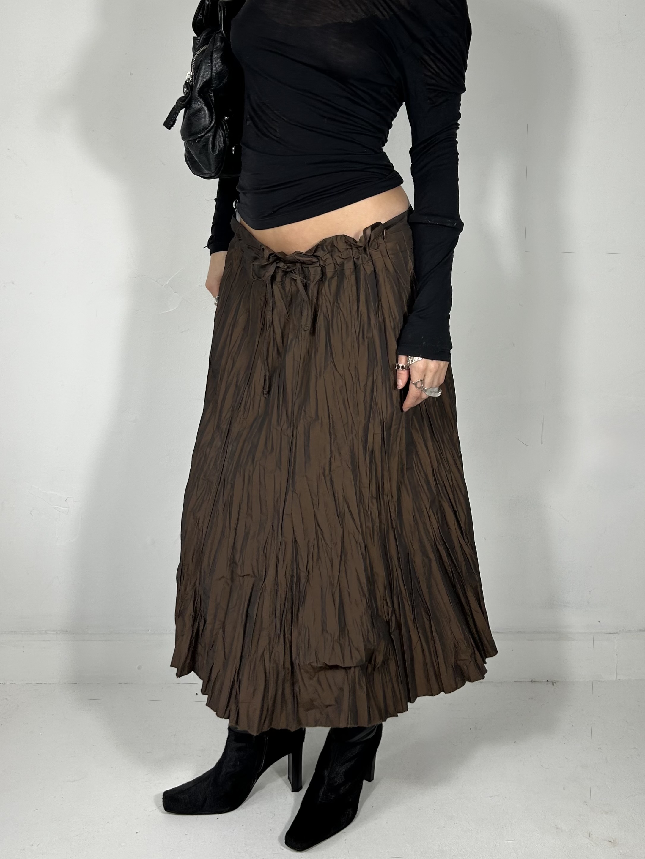 Brown metallic pleated maxi skirt with tie detail. Fits sizes uk 6-12